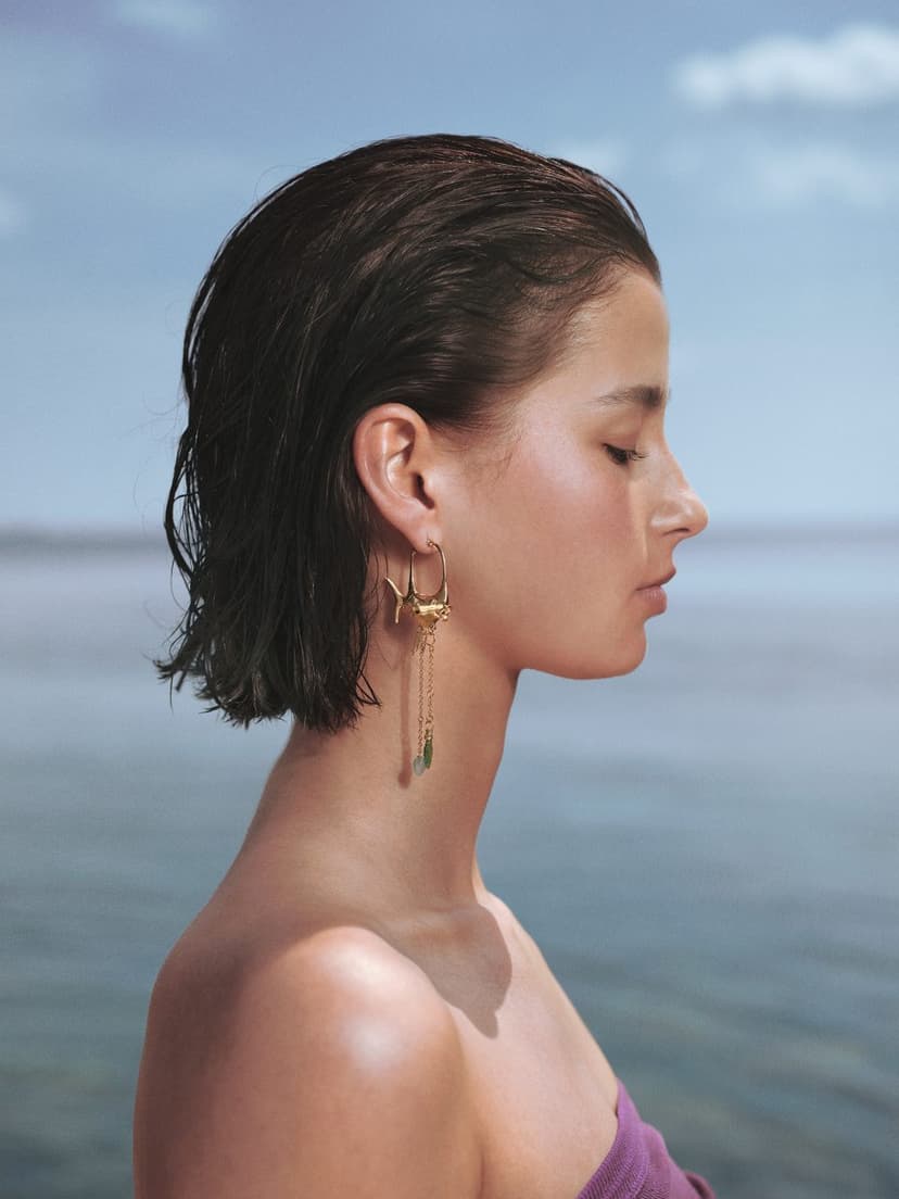 Under the Sea bangles, earrings, and rings are designed as infinite, organic shapes crafted from 18 karat yellow gold, whereas The Young Fish Collection captures the essence of ocean creatures in playful designs with whimsical details. The Young Fish ring features an Akoya pearl that bounces with a gentle touch, while the Young Fish earrings can be styled with interchangeable pendants, allowing for a diverse range of personal expressions.