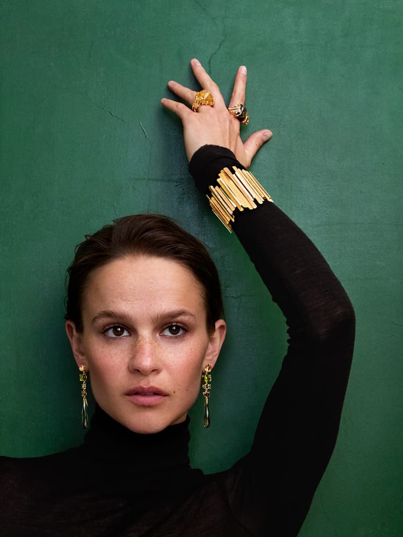 This BoHo bracelet, designed by Charlotte Lynggaard, is crafted from 18 karat yellow gold and rose gold set with 392 diamonds in 33 different sizes totalling 6.70 ct. TW. VS. In this design, narrow shapes in yellow gold and rose gold are placed in a staggered pattern structured in three different levels, which creates a unique, three-dimensional structure. The gold is adorned with satinized surfaces, polished surfaces, and pavé-set diamonds, creating a variety of vibrant contrasts. This BoHo bracelet was designed by Charlotte Lynggaard on the occasion of OLE LYNGGAARD COPENHAGEN’s 60th anniversary in 2023. Part of The BoHo Collection.