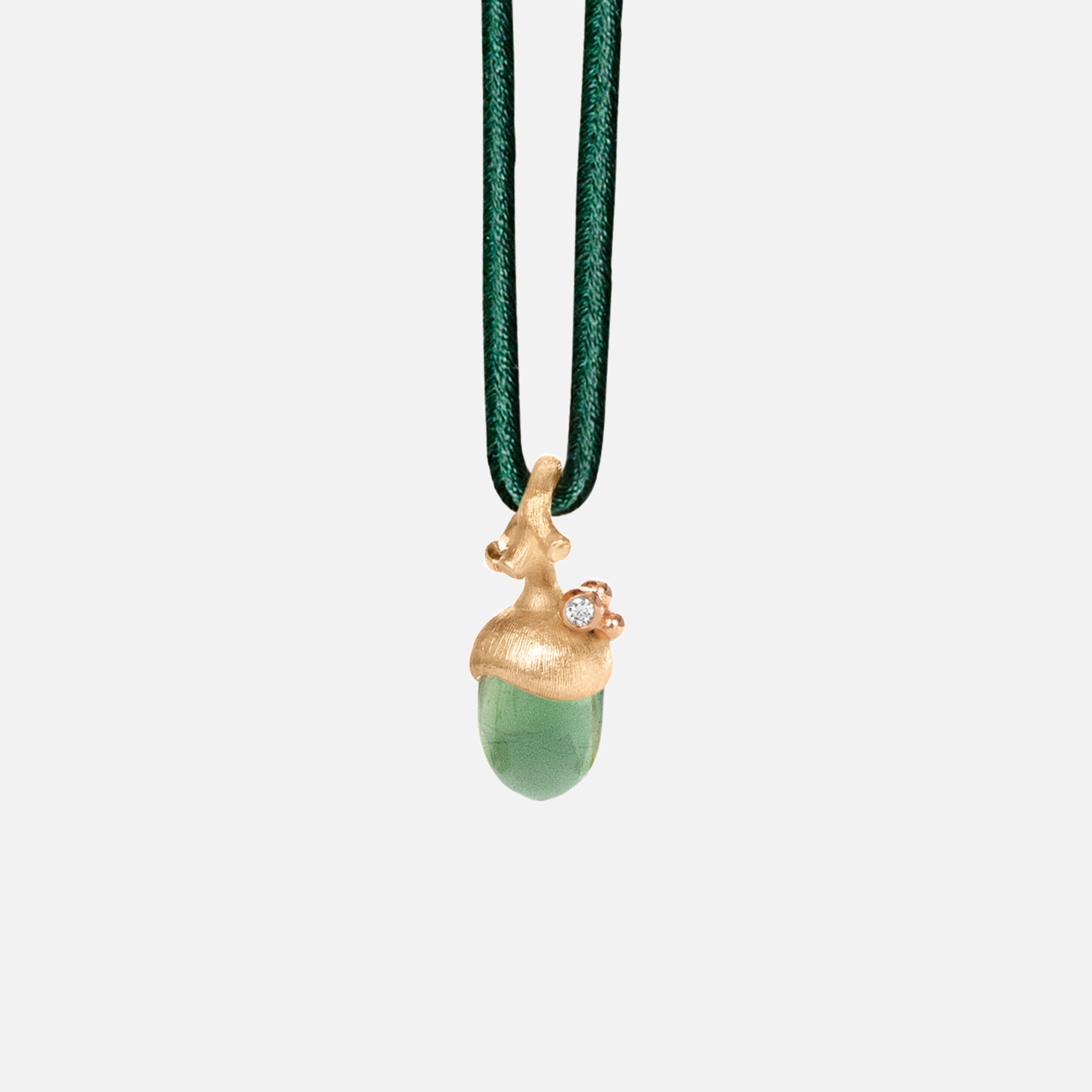 Designed by Charlotte Lynggaard, the Acorn pendant small is crafted from 18 karat yellow and rose gold with one diamond 0.01 carat TW. VS., and a green serpentine cabochon. The gold surfaces are hand-brushed by master goldsmiths for a matt finish. Part of the Forest Collection.