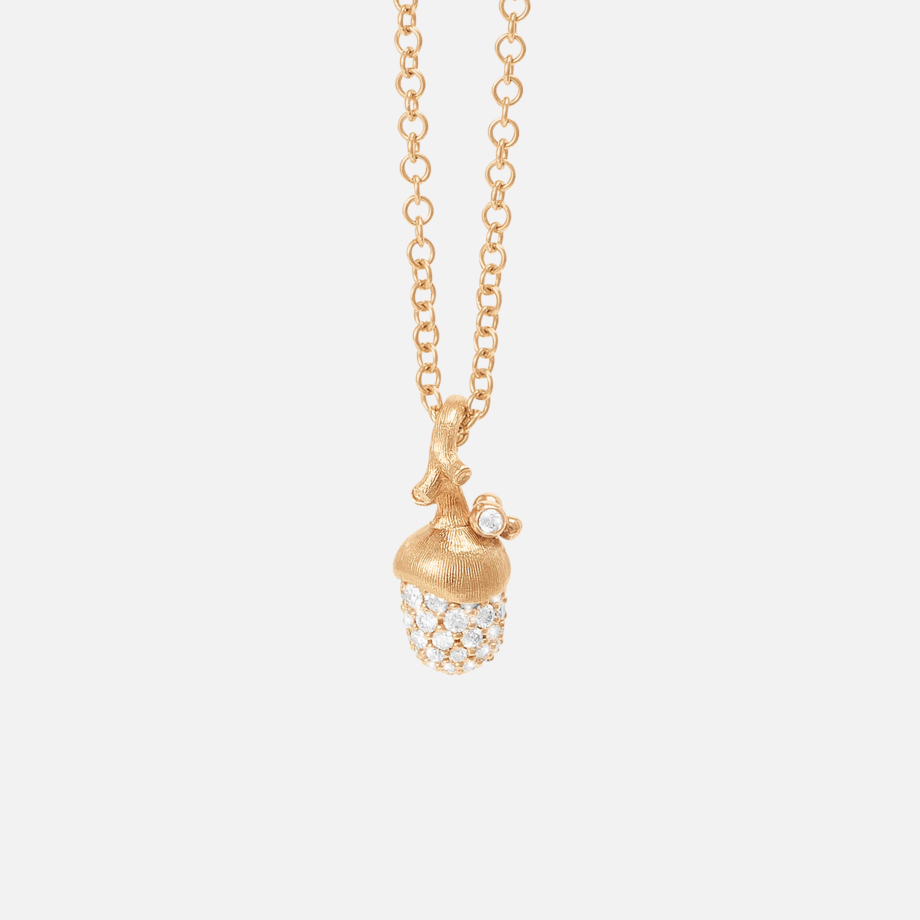 Designed by Charlotte Lynggaard, the Acorn pendant small is crafted from 18 karat yellow and rose gold with 56 hand-set pavé diamonds 0.36 carat TW. VS. The gold surfaces are hand-brushed by master goldsmiths for a matt finish. Part of the Forest Collection.