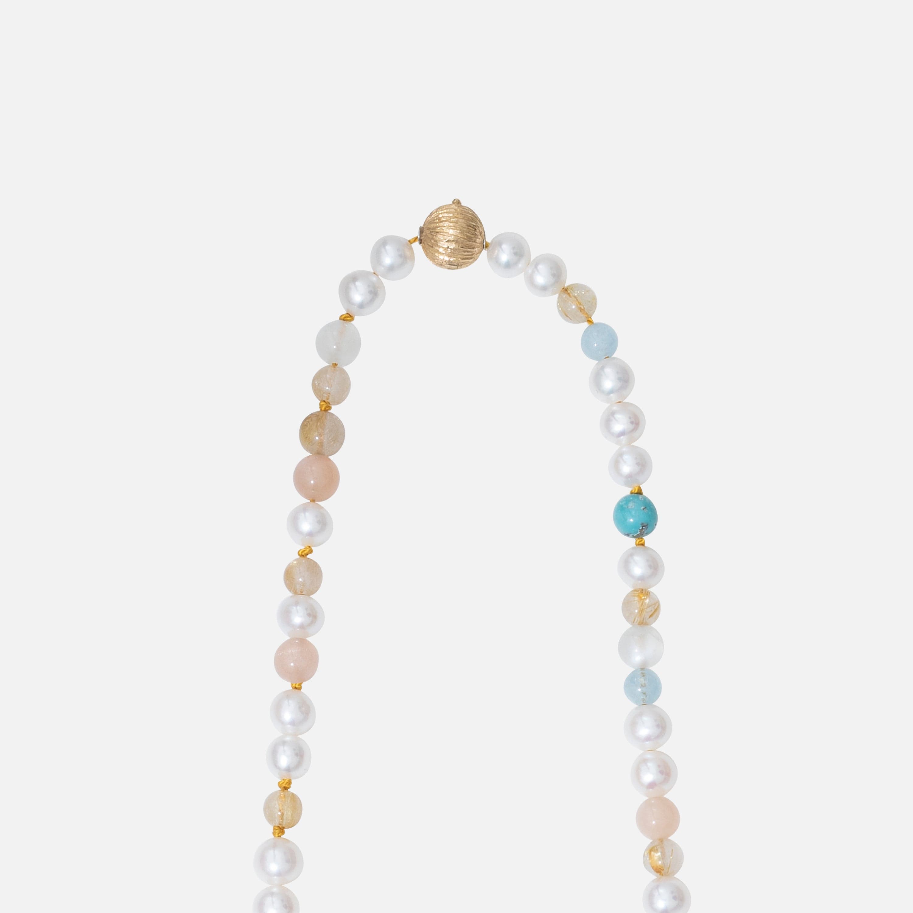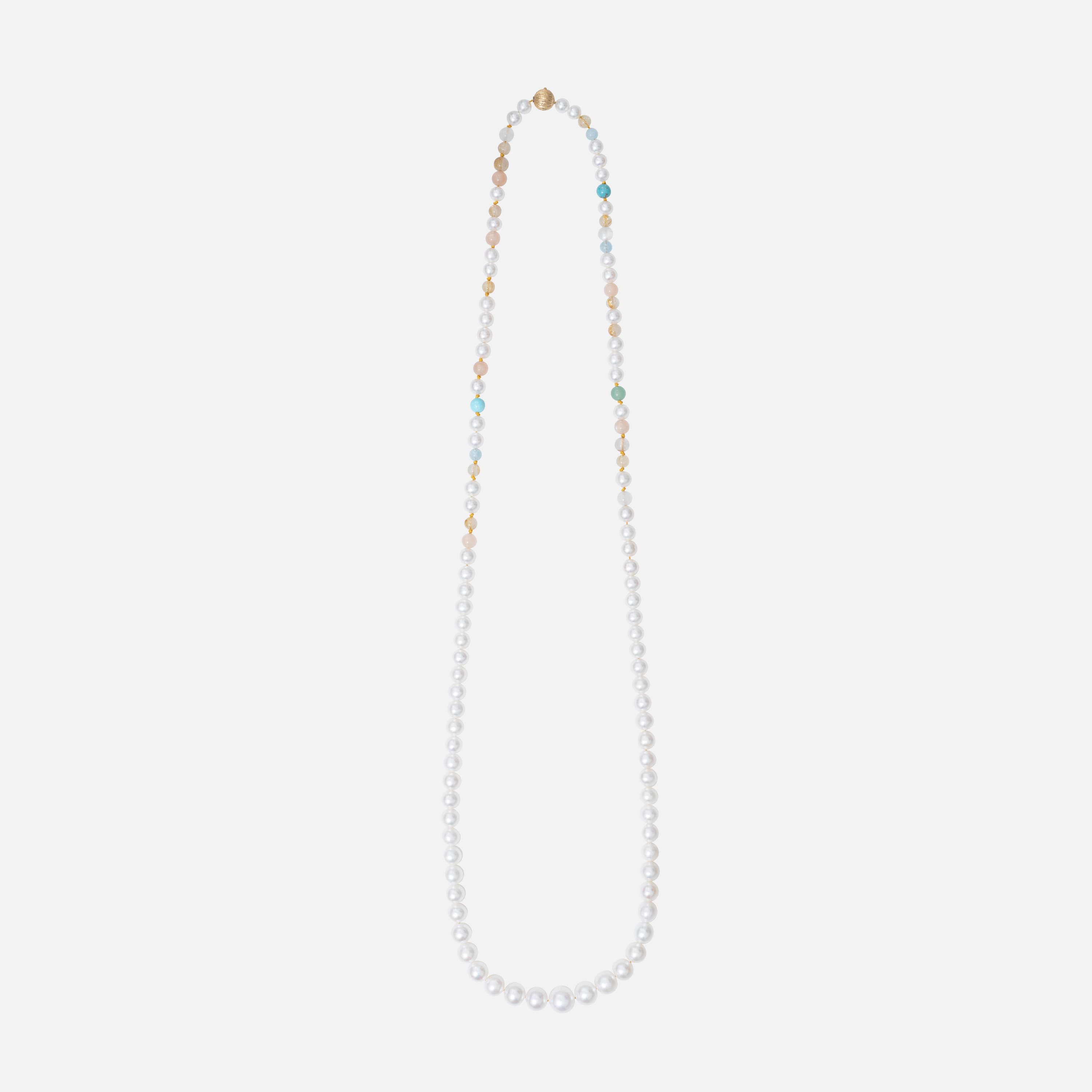 Designed by Charlotte Lynggaard, the bead collier is 75-78 cm long, without fastening, and is crafted from freshwater pearls, aquamarine, blush moonstone, rutile quartz, serpentine, turquoise, and white moonstone. Finish the collier with the clasp of your choice. Clasps are bought seperatly. Part of the Ole Lynggaard Copenhagen Collection.