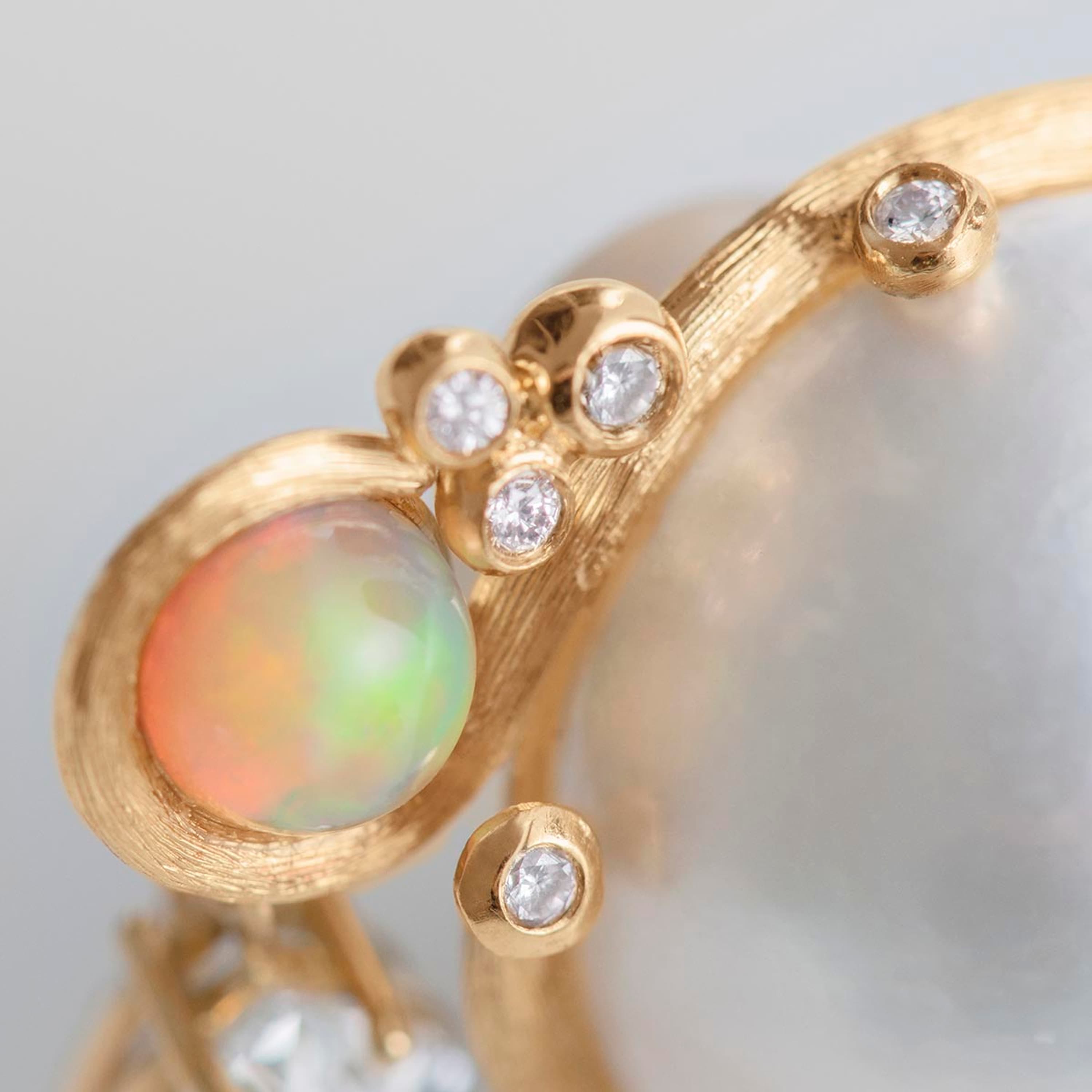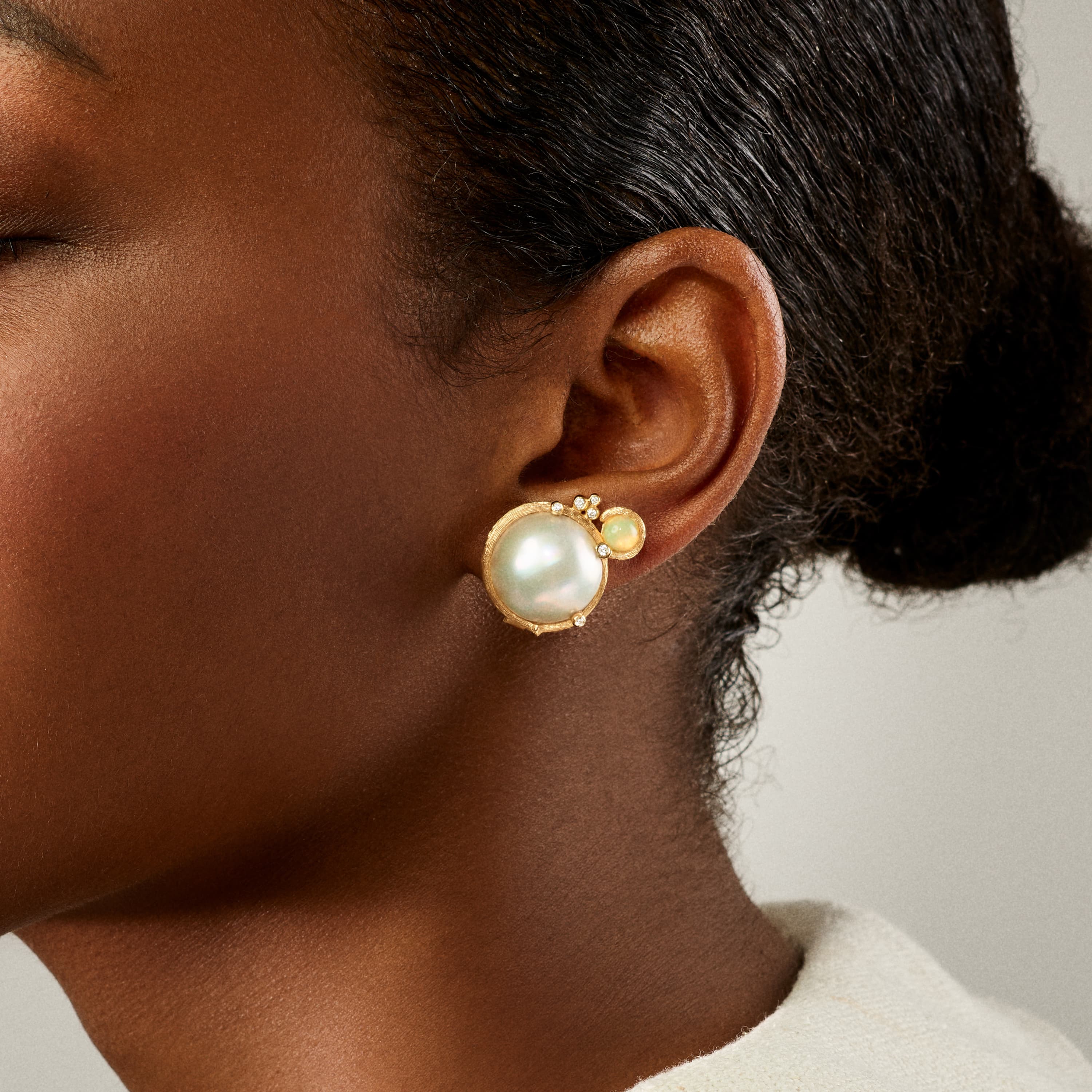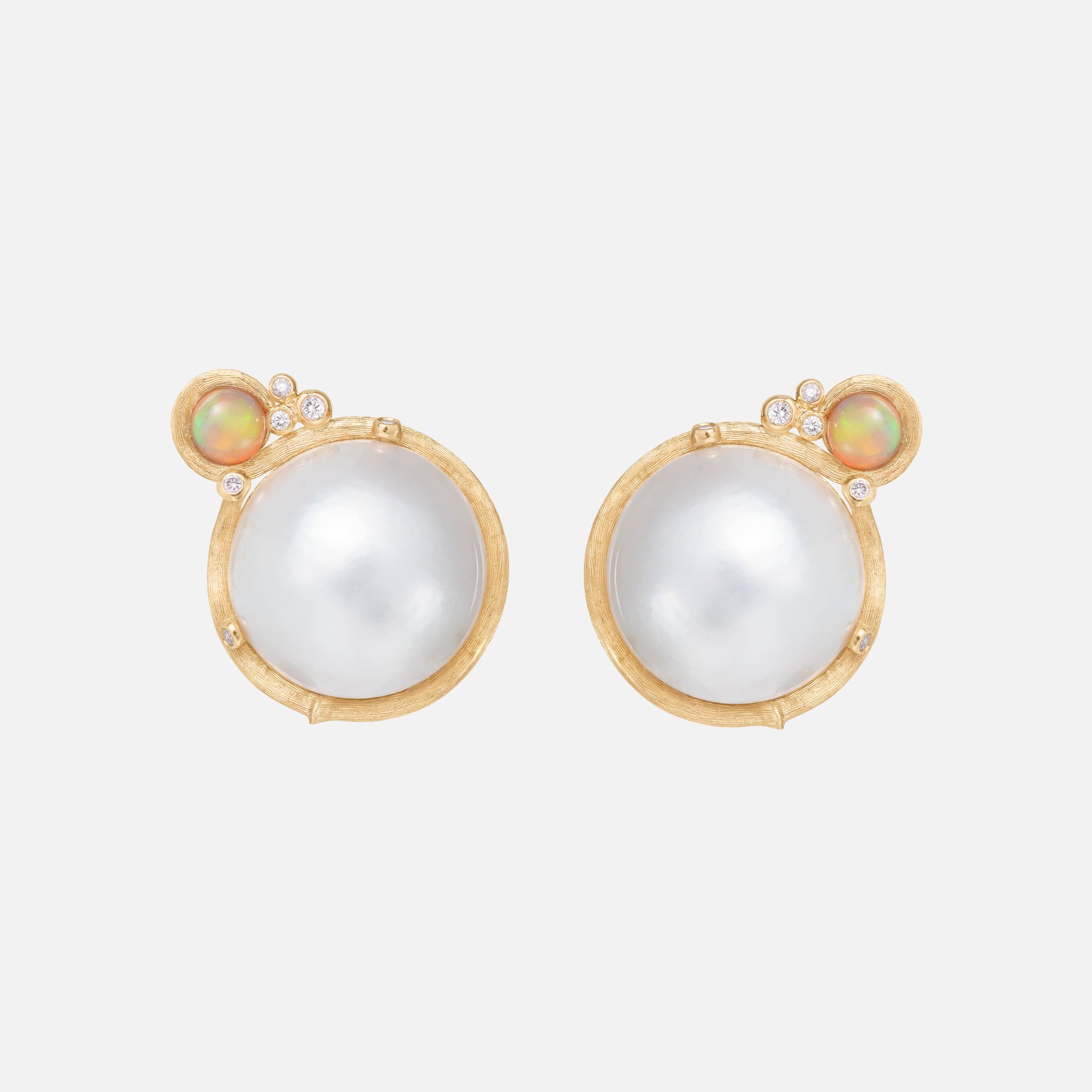 Designed by Charlotte Lynggaard, the BoHo Mabe pearl ear clips are crafted from 18 karat yellow gold with two 17 mm Mabe pearls, two 6 mm opals, and 12 hand-set diamonds 0.1 carat TW. VS. Each earring has two eyelets for hanging pendants. Sold as a pair. Part of the BoHo Collection.