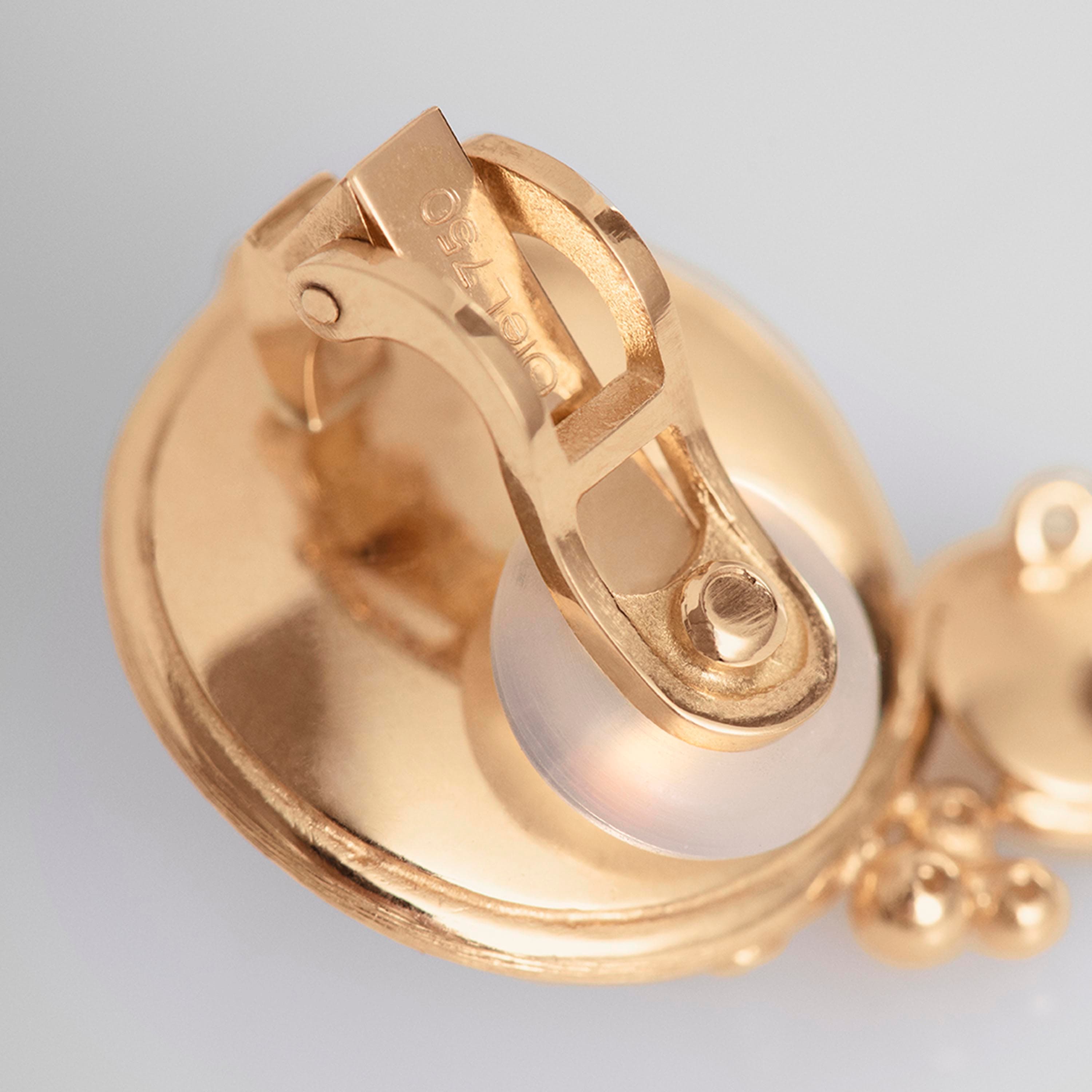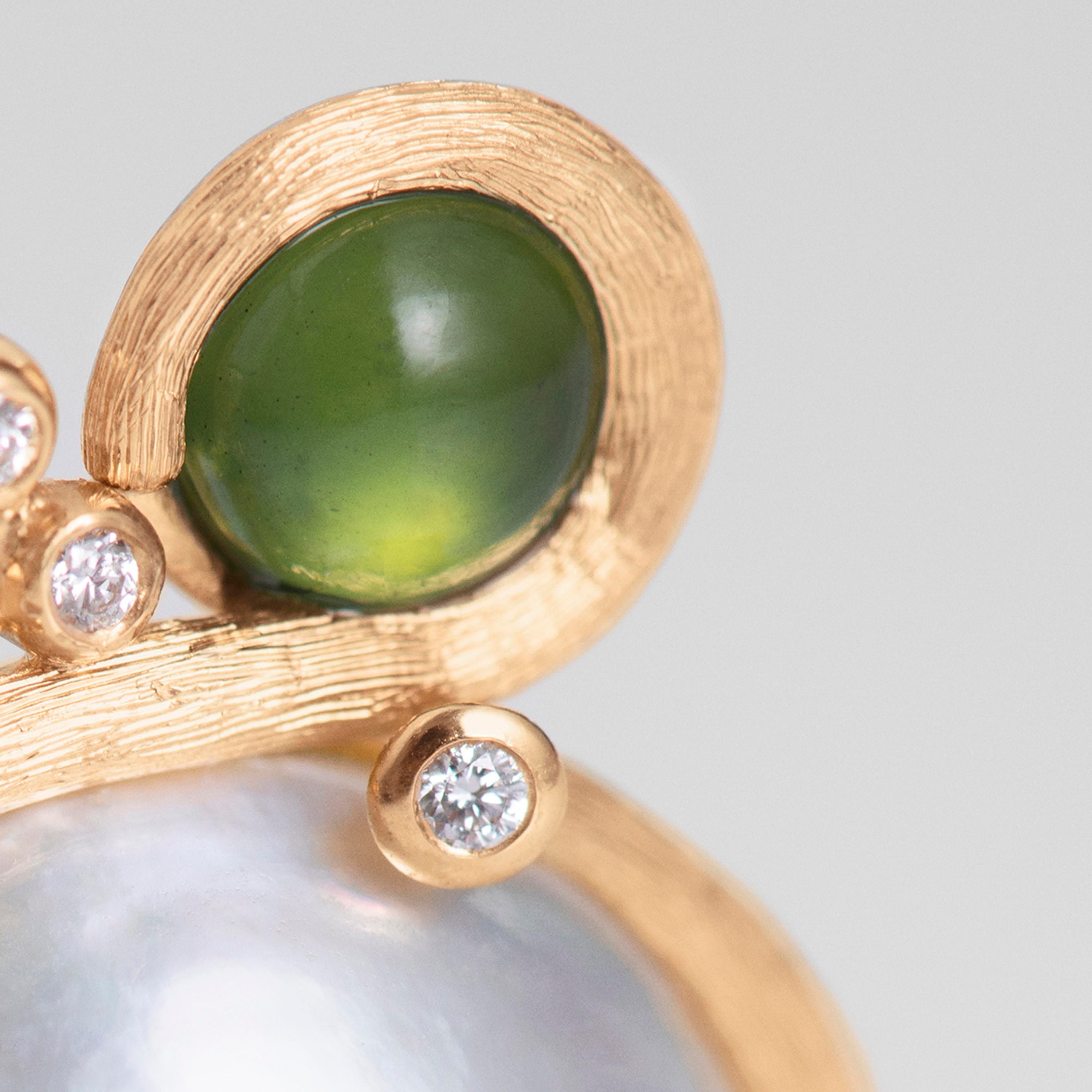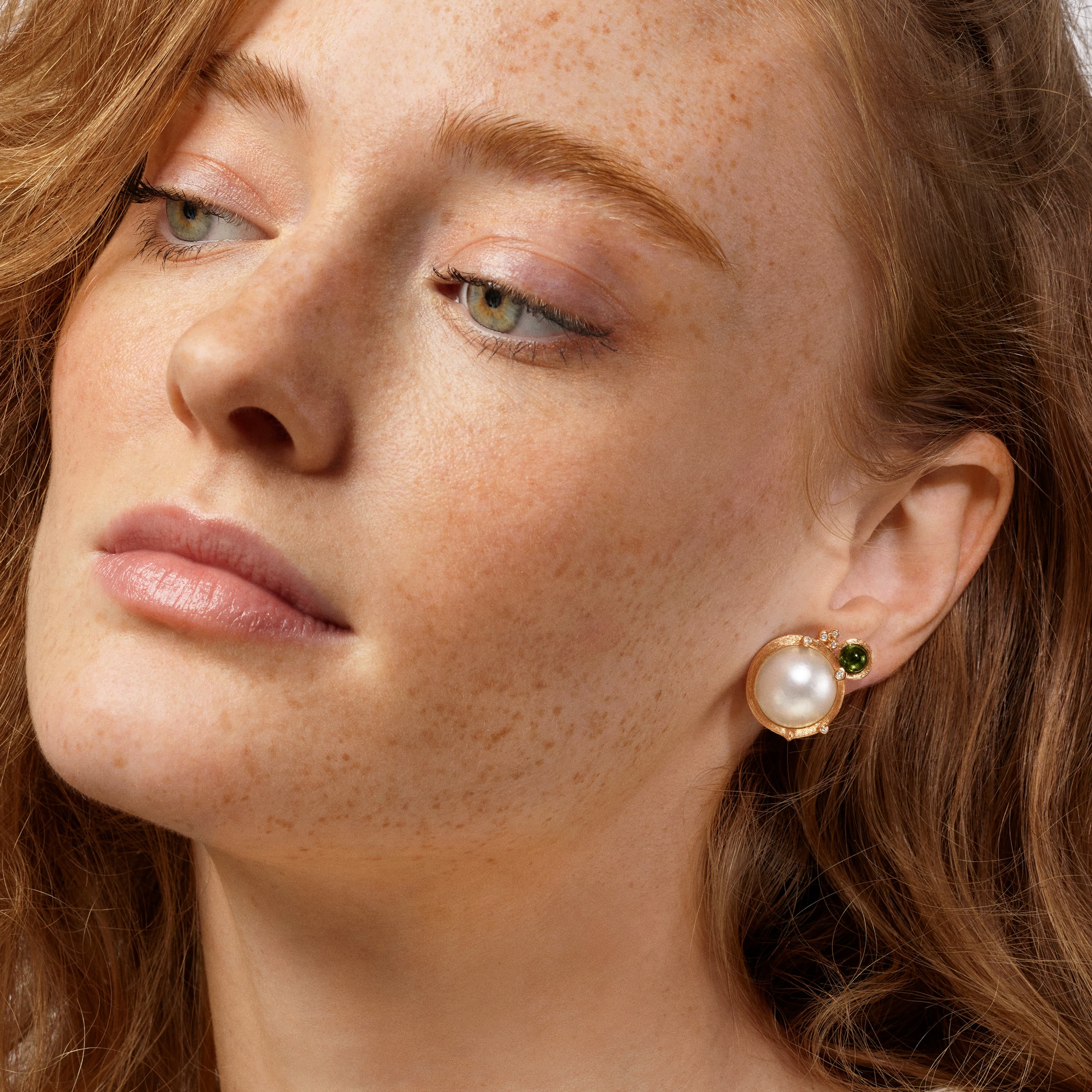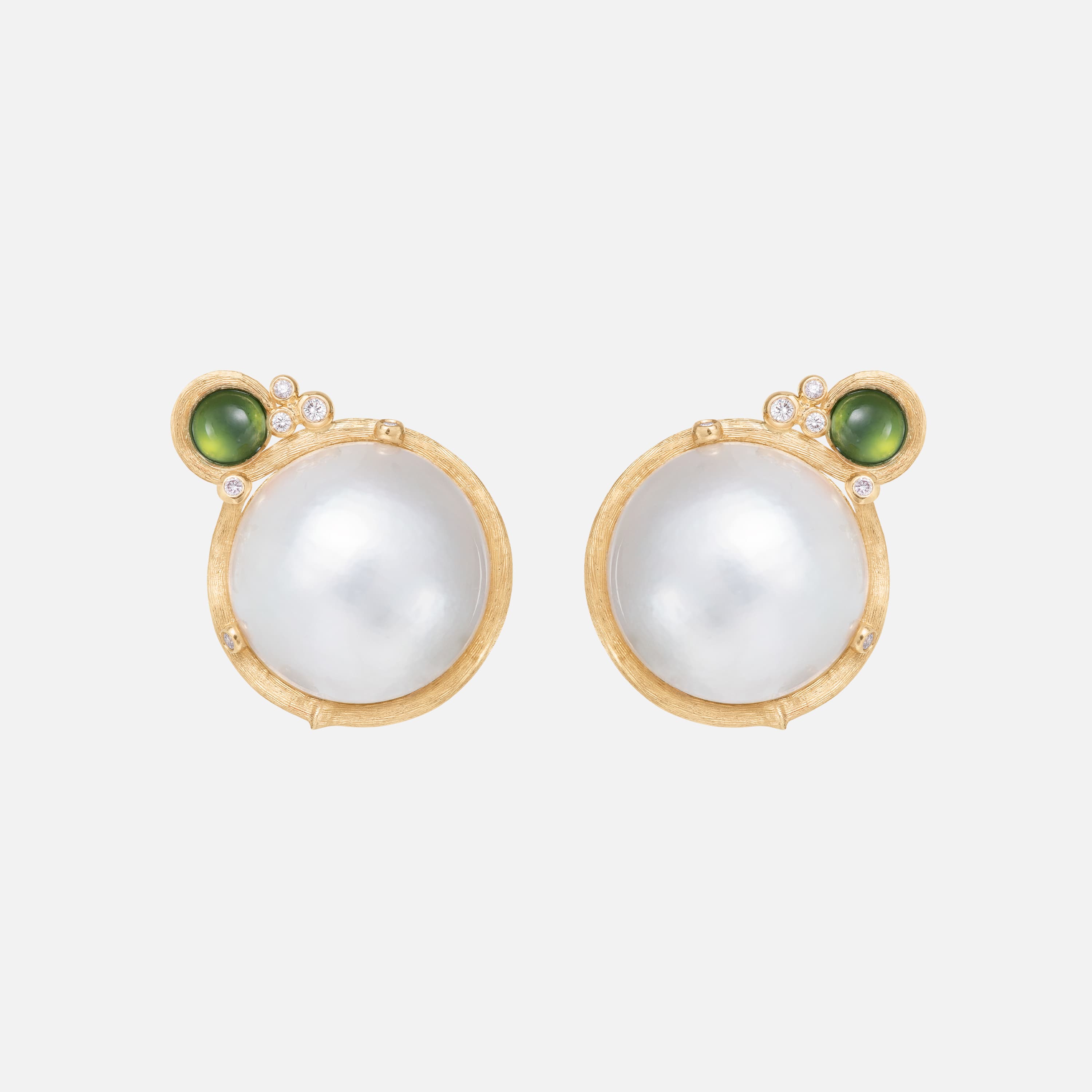 Designed by Charlotte Lynggaard, the BoHo Mabe pearl ear clips are crafted from 18 karat yellow gold with two 17 mm Mabe pearls, two 6 mm green tourmalines, and 12 hand-set diamonds 0.1 carat TW. VS. Each earring has two eyelets for hanging pendants. Sold as a pair. Part of the BoHo Collection.