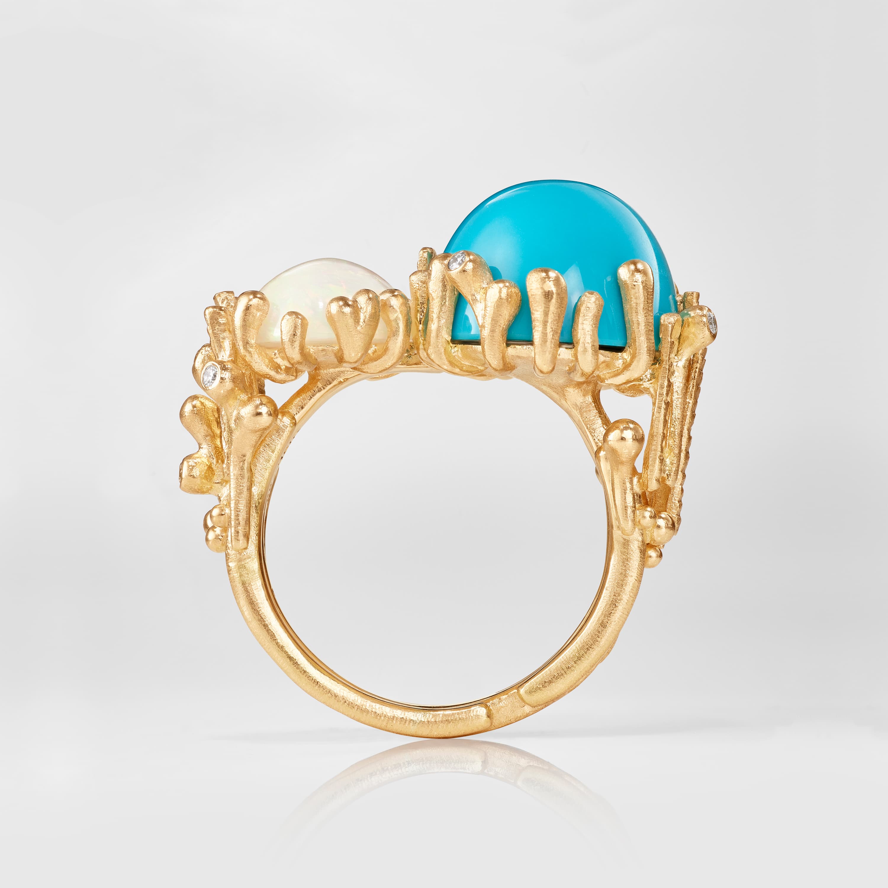 Designed by Charlotte Lynggaard, the BoHo ring double is crafted from 18 karat yellow gold with a 14,3 carat, 18x13 mm turquoise, a 2,5 carat, 13x9 mm light blue opal, and 7 hand-set diamonds 0.05 carat TW. VS. The hammered and polished gold surfaces are hand-finished by master goldsmiths. Part of the BoHo Collection. Please note: As gemstones are natural materials, each stone is absolutely unique. They will vary in colour and have individual, unique inclusions and features. Web-images of stones are only representatives of the unique stone you will receive when ordering the product, not the exact stone.