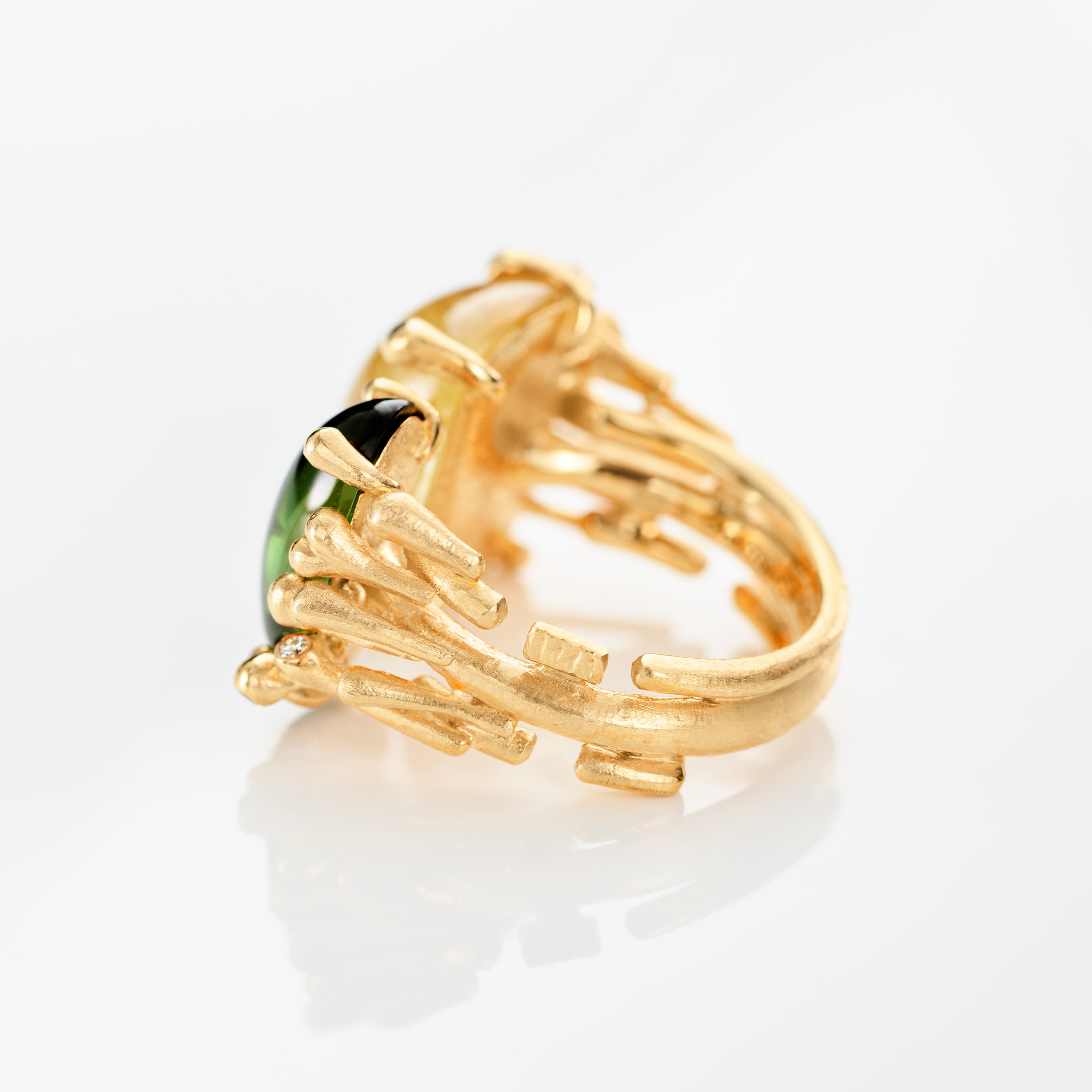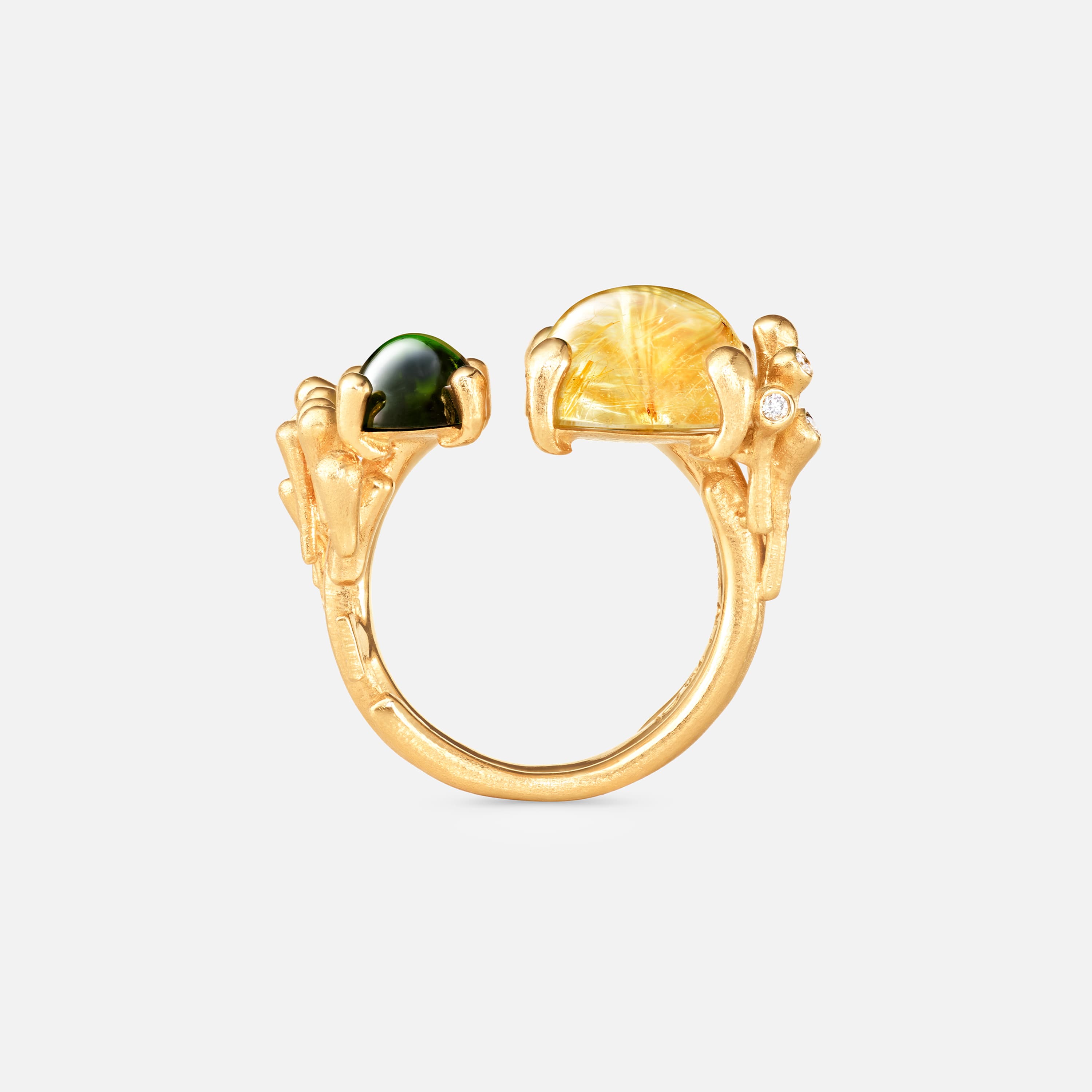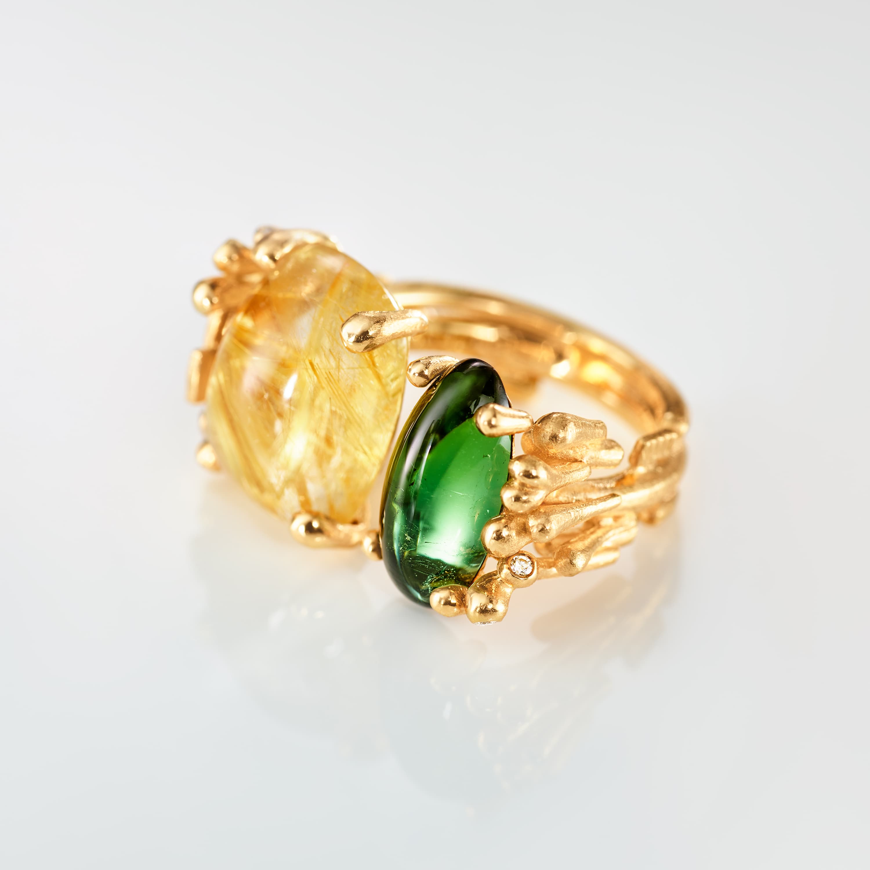 Designed by Charlotte Lynggaard, the BoHo ring double is crafted from 18 karat yellow gold with an 8,3 carat, 11x15 mm rutile quartz, a 4 carat, 6,7x14 mm green tourmaline, and 5 hand-set diamonds 0.04 carat TW. VS. The hammered and polished gold surfaces are hand-finished by master goldsmiths. Part of the BoHo Collection. Please note: As gemstones are natural materials, each stone is absolutely unique. They will vary in colour and have individual, unique inclusions and features. Web-images of stones are only representatives of the unique stone you will receive when ordering the product, not the exact stone.