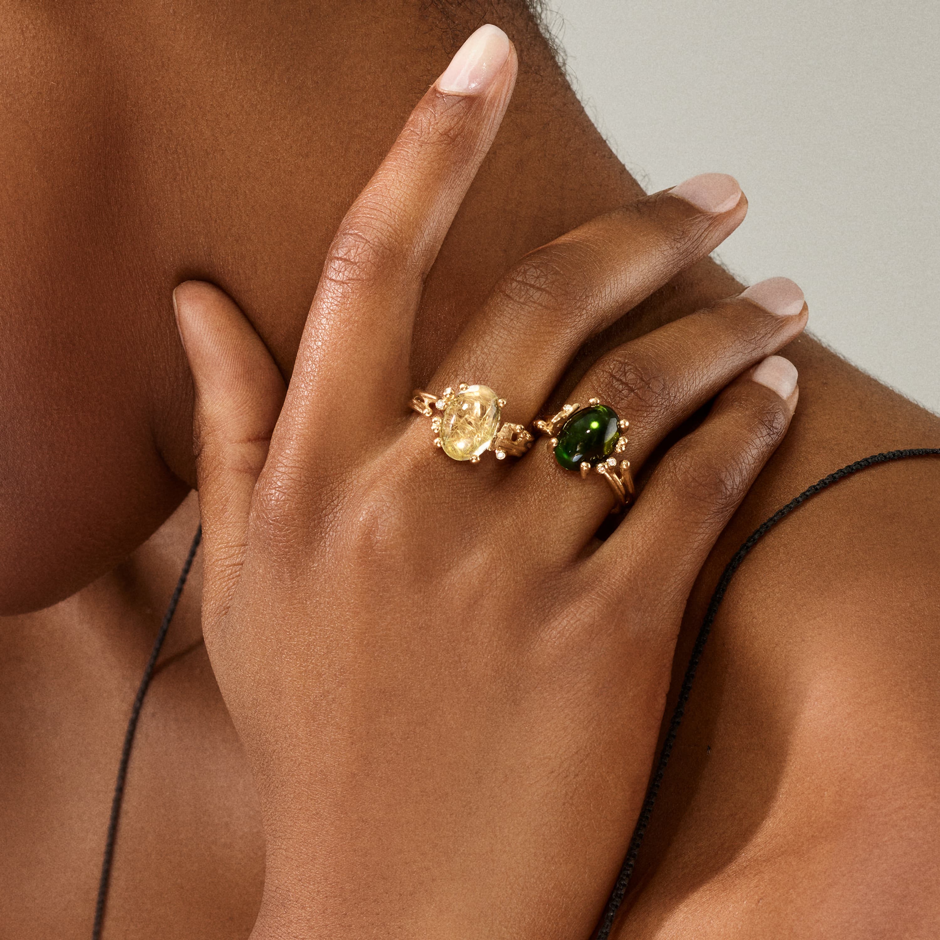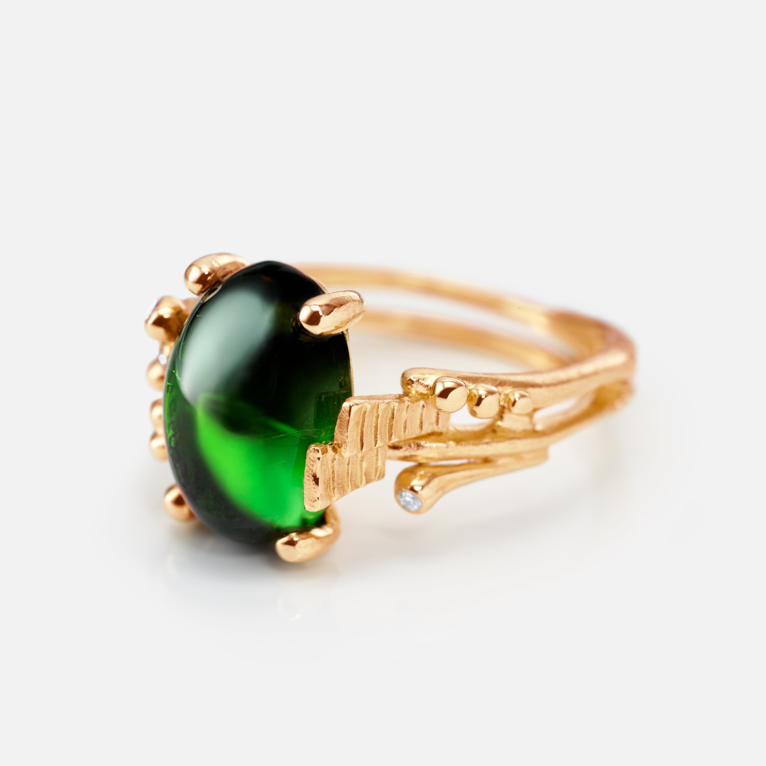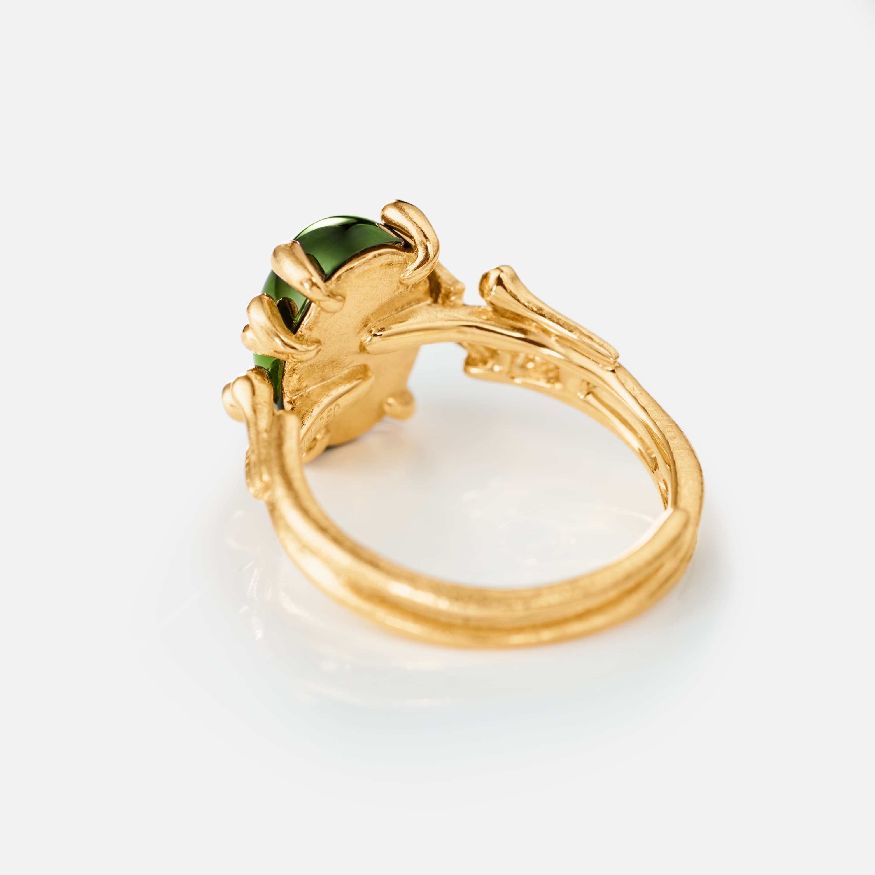 Designed by Charlotte Lynggaard, the BoHo ring small is crafted from 18 karat yellow gold with a 9x13 mm green tourmaline, and 3 hand-set diamonds totalling 0.02 carat TW. VS. The hammered and polished gold surfaces are hand-finished by master goldsmiths. Part of the BoHo Collection. Please note: As gemstones are natural materials, each stone is absolutely unique. They will vary in colour and have individual, unique inclusions and features. Web-images of stones are only representatives of the unique stone you will receive when ordering the product, not the exact stone.