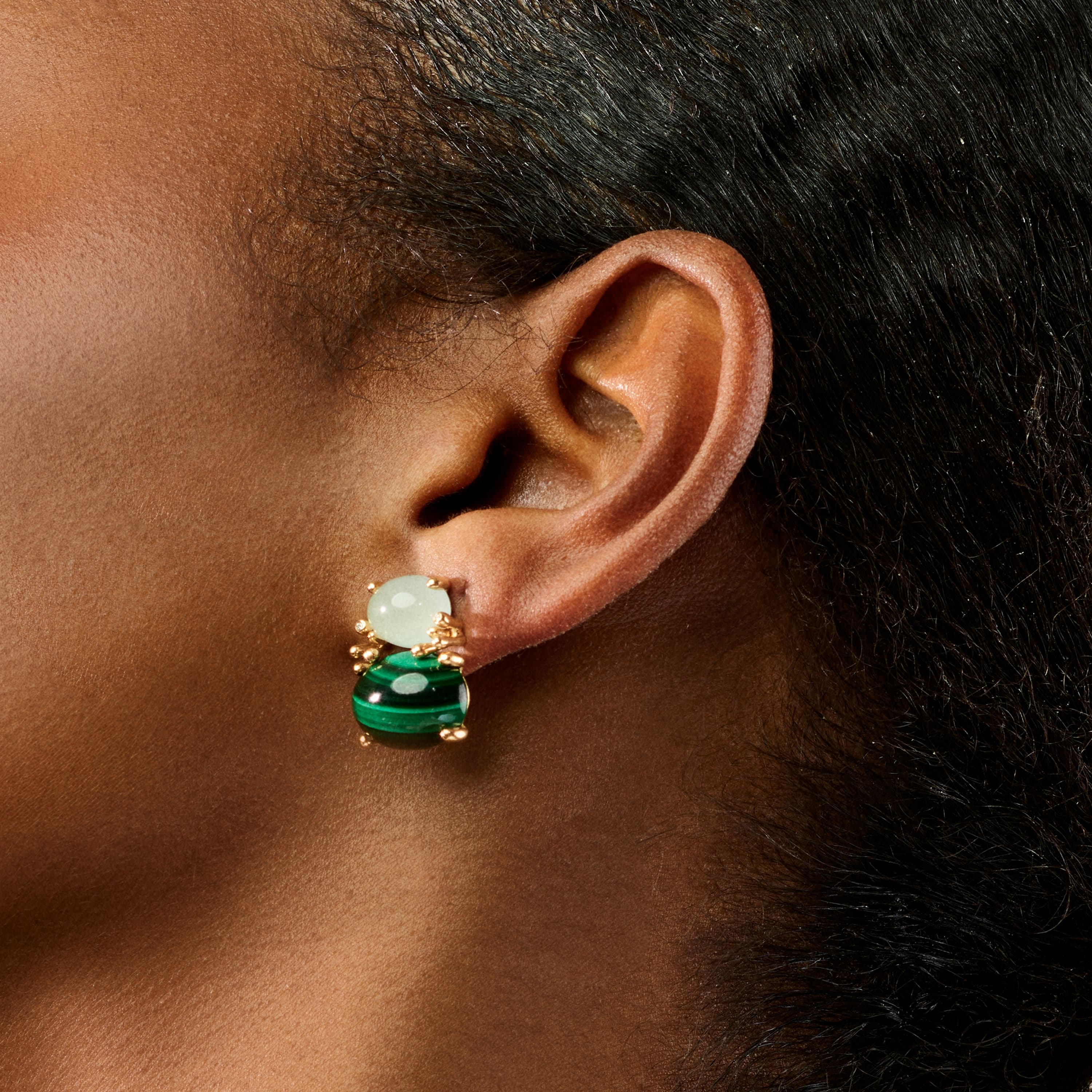 These BoHo stud earrings, designed by Charlotte Lynggaard, are crafted from 18 karat yellow gold, two aquamarines, two malachites, and four diamonds totalling 0.01 ct. TW VS. Each earring features a small eyelet for earring pendants. Please note: As gemstones are natural materials, each stone is truly unique. They will vary in colour and have individual, unique inclusions and features. The web images of the stones are only representatives of the unique stones you will receive when ordering the product, not the exact stones. Sold as a pair. Part of The BoHo Collection.