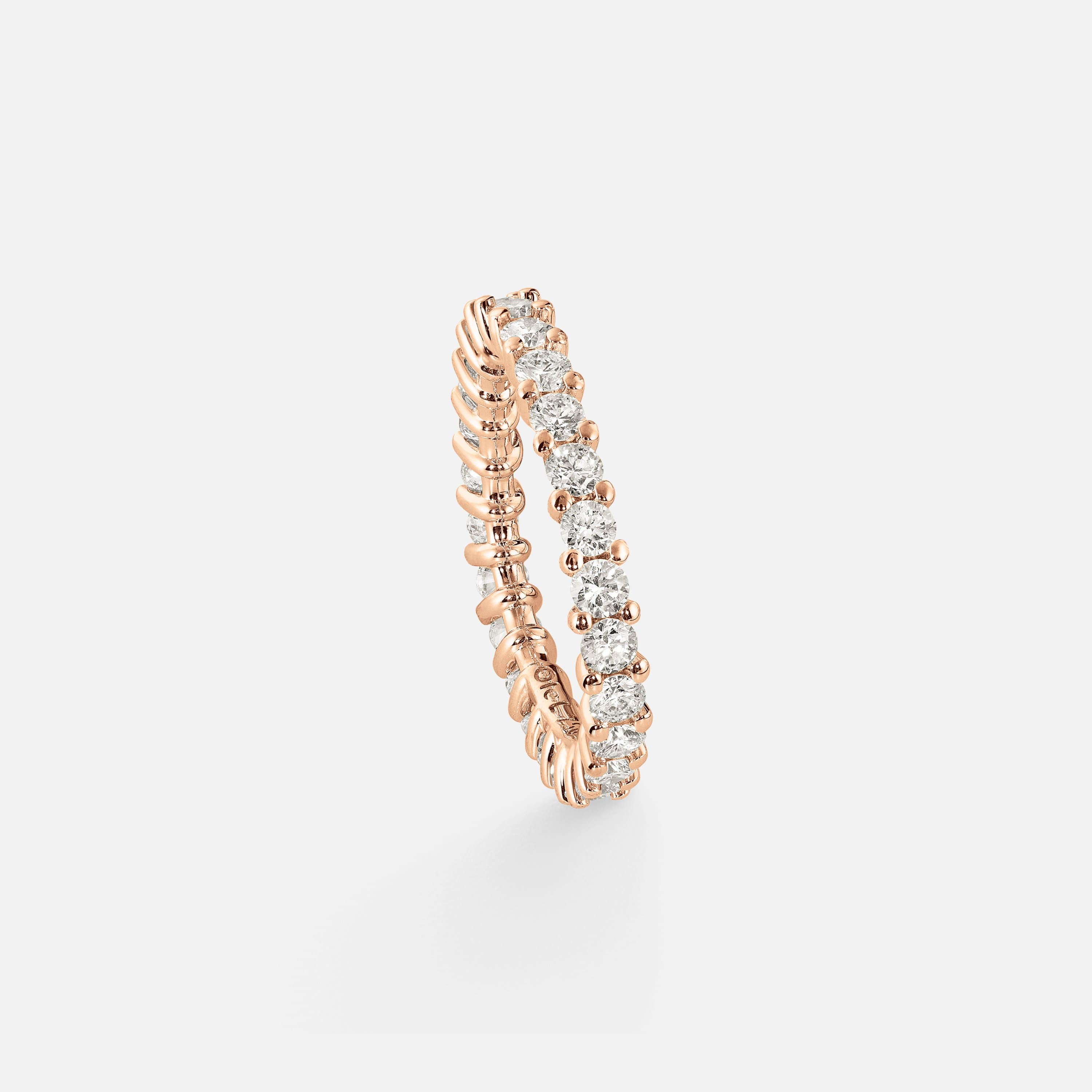 Designed by Ole Lynggaard, the Celebration eternity ring is crafted from 18 karat polished rose gold with 24-26 prong-set diamonds, totalling 1,2-1,3 carat TW. VS. depending on ring size. Handcrafted by master goldsmiths. Part of the Ole Lynggaard Copenhagen Engagement and Wedding Collection.