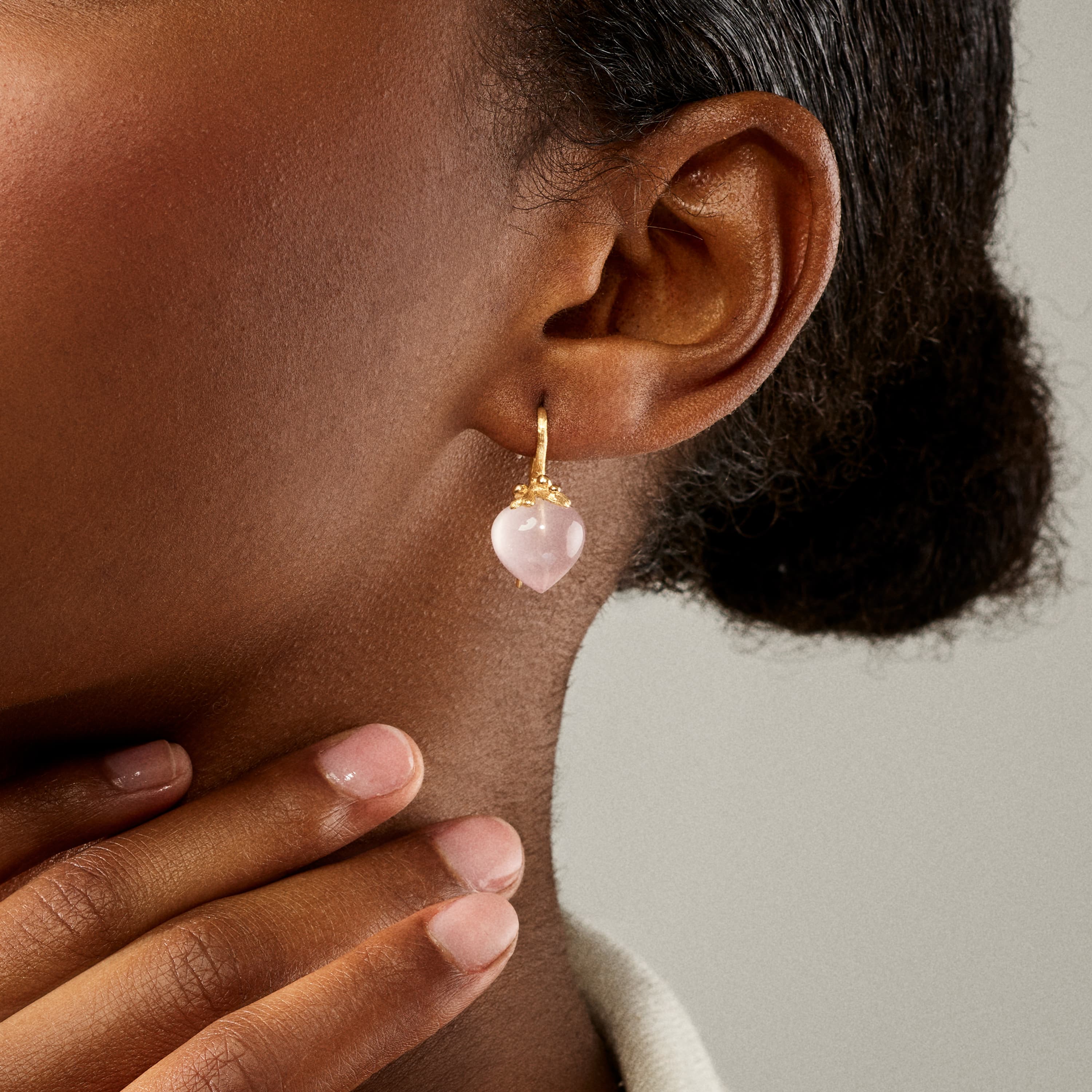 Designed by Charlotte Lynggaard, the Dew Drops Filigree earrings are crafted from 18 karat yellow gold with rose quartz cabochon drops. Handcrafted by master goldsmiths, the visible gold surfaces are hand-satinised, whilst the hook fastening is polished for a smooth finish. Sold as a pair. Part of the Ole Lynggaard Copenhagen Dew Drops Collection.