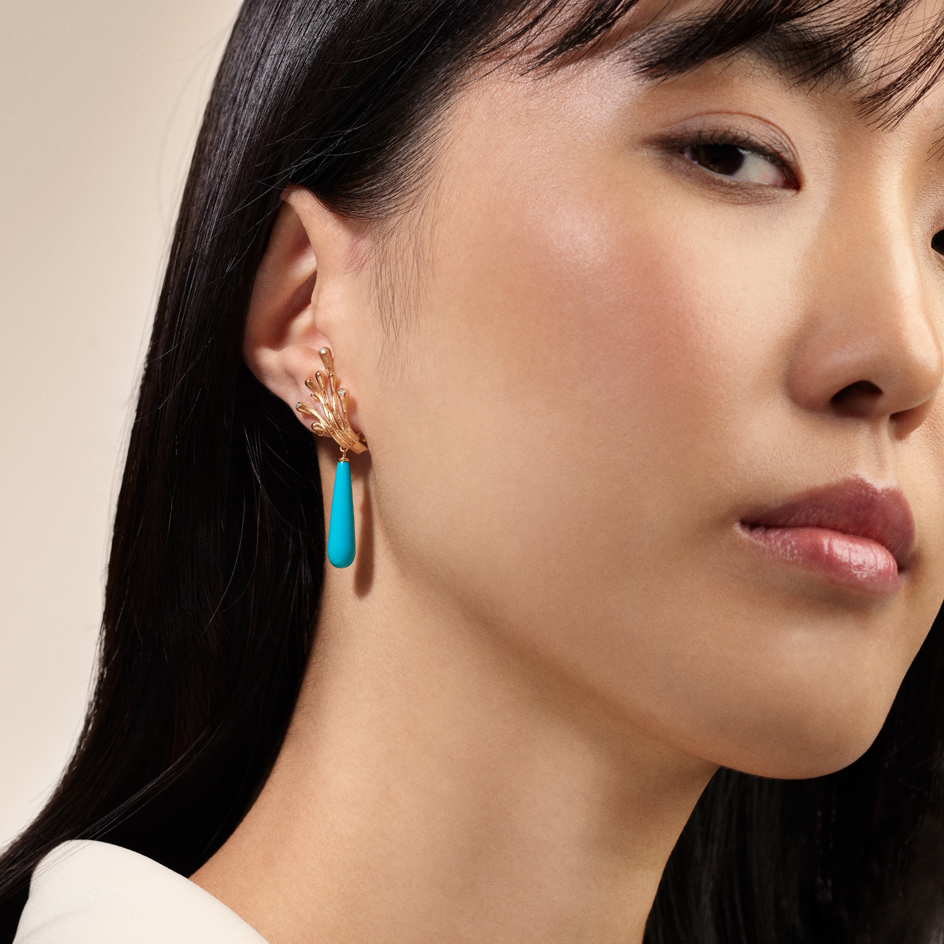 Designed by Charlotte Lynggaard, the earring pendant drops are crafted from 18 karat yellow gold with 22x6 mm turquoise cabochon drops. Handcrafted by master goldsmiths, the pendant drops are made for hanging in earrings and pendants with eyelets. Sold as a pair. Part of the Lotus Collection.
