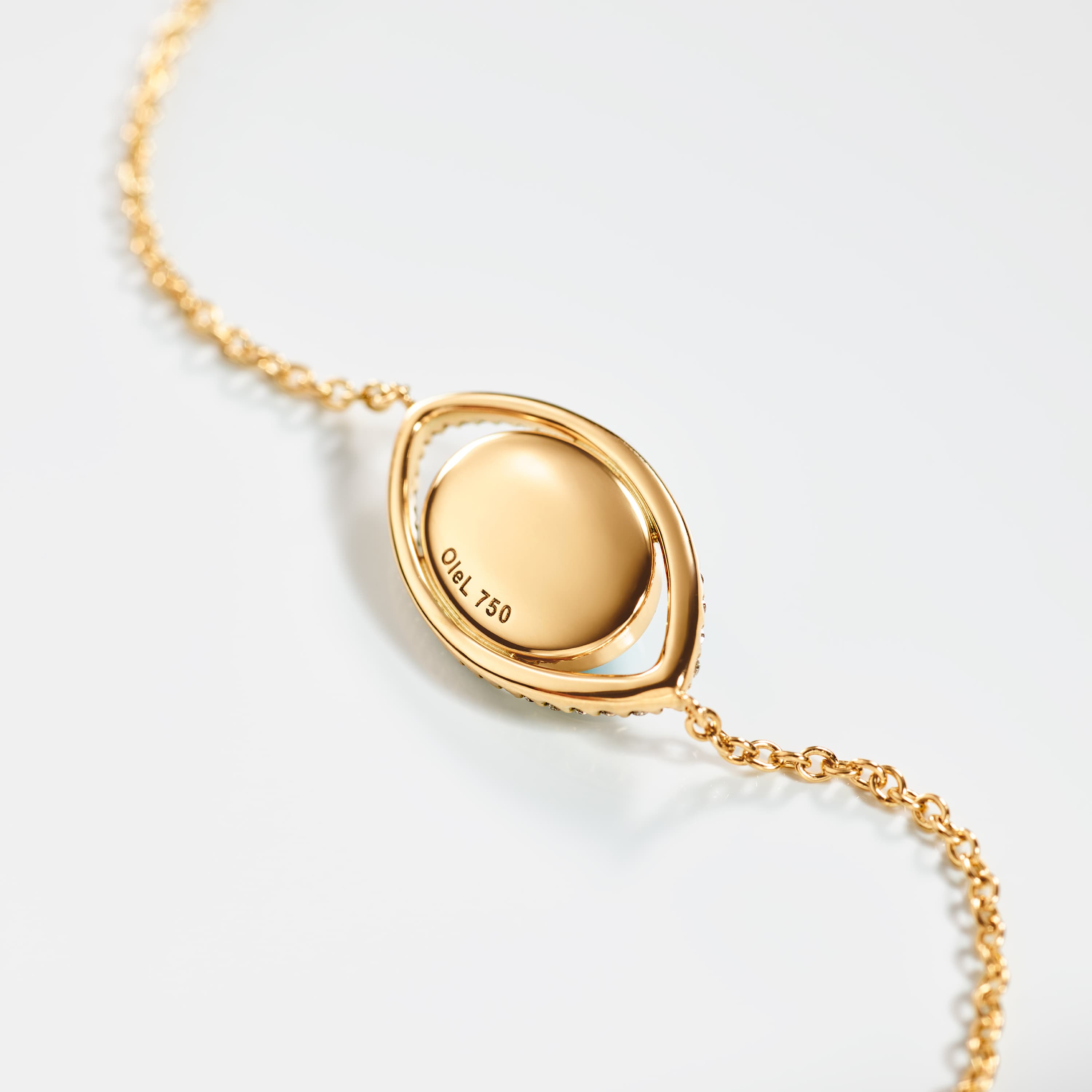 Designed by Charlotte Lynggaard, this bracelet features an Evil Eye. The Evil Eye is crafted in tiger’s eye, turquoise, and onyx, encircled by 42 diamonds totalling 0.25 ct. TW VS. The bracelet, anchor 40, is crafted in 18 karat yellow gold. It measures 18 cm, with eyelets allowing it to be worn at 15, 16, 17, or 18 cm. The adjustable end of the bracelet is adorned with a petite Shooting Star composed of 6 diamonds totalling 0.03 ct. TW VS, adding a sophisticated extra sparkle. Handcrafted by master goldsmiths. Part of The Lotus Collection.