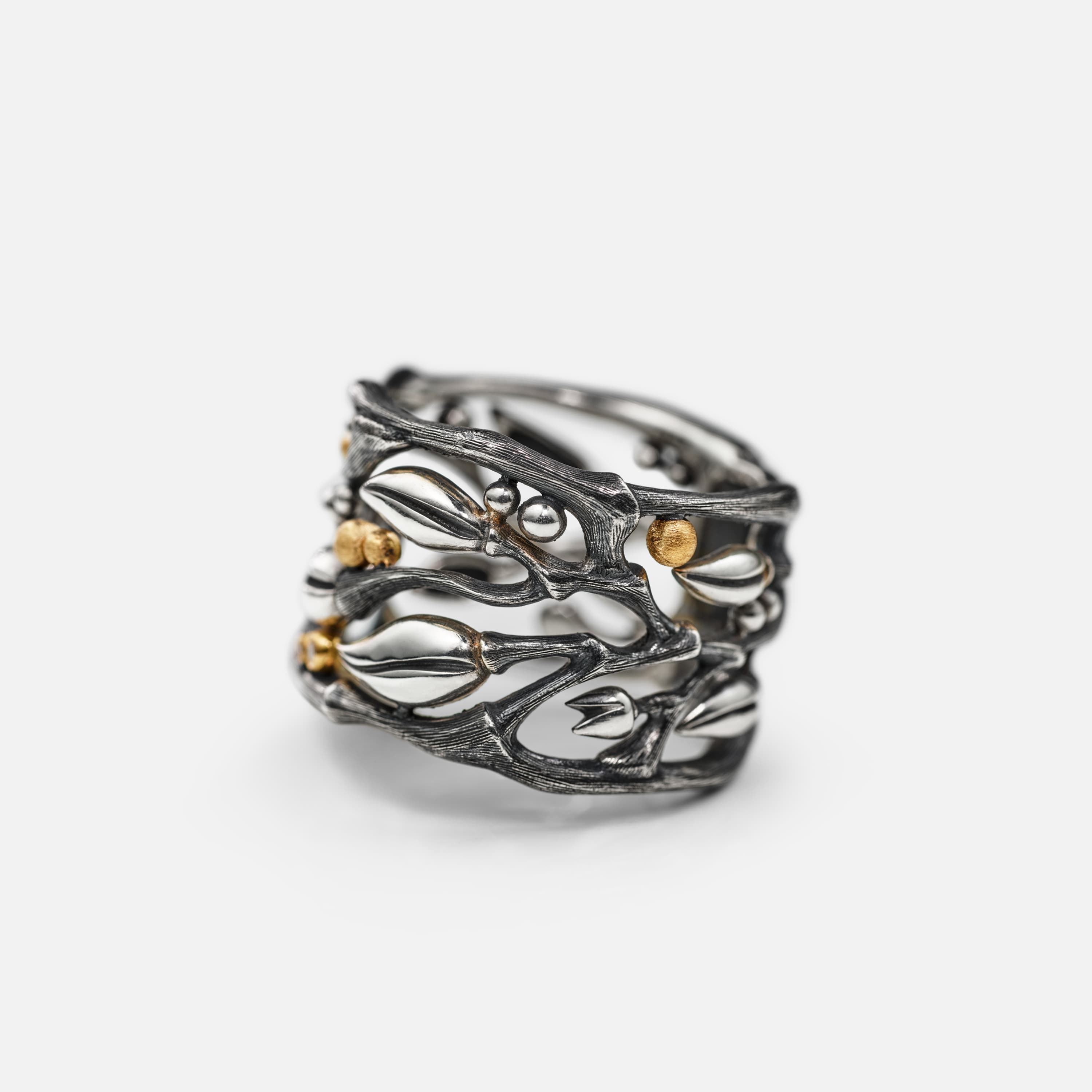 Designed by Charlotte Lynggaard, the Forest ring is crafted from lightly oxidized Sterling silver, 18 karat yellow gold and two bezel-set diamonds 0.02 carat TW. VS. The precious metal surfaces are hand-finished using different techniques to create contrast. Part of the Forest Collection.