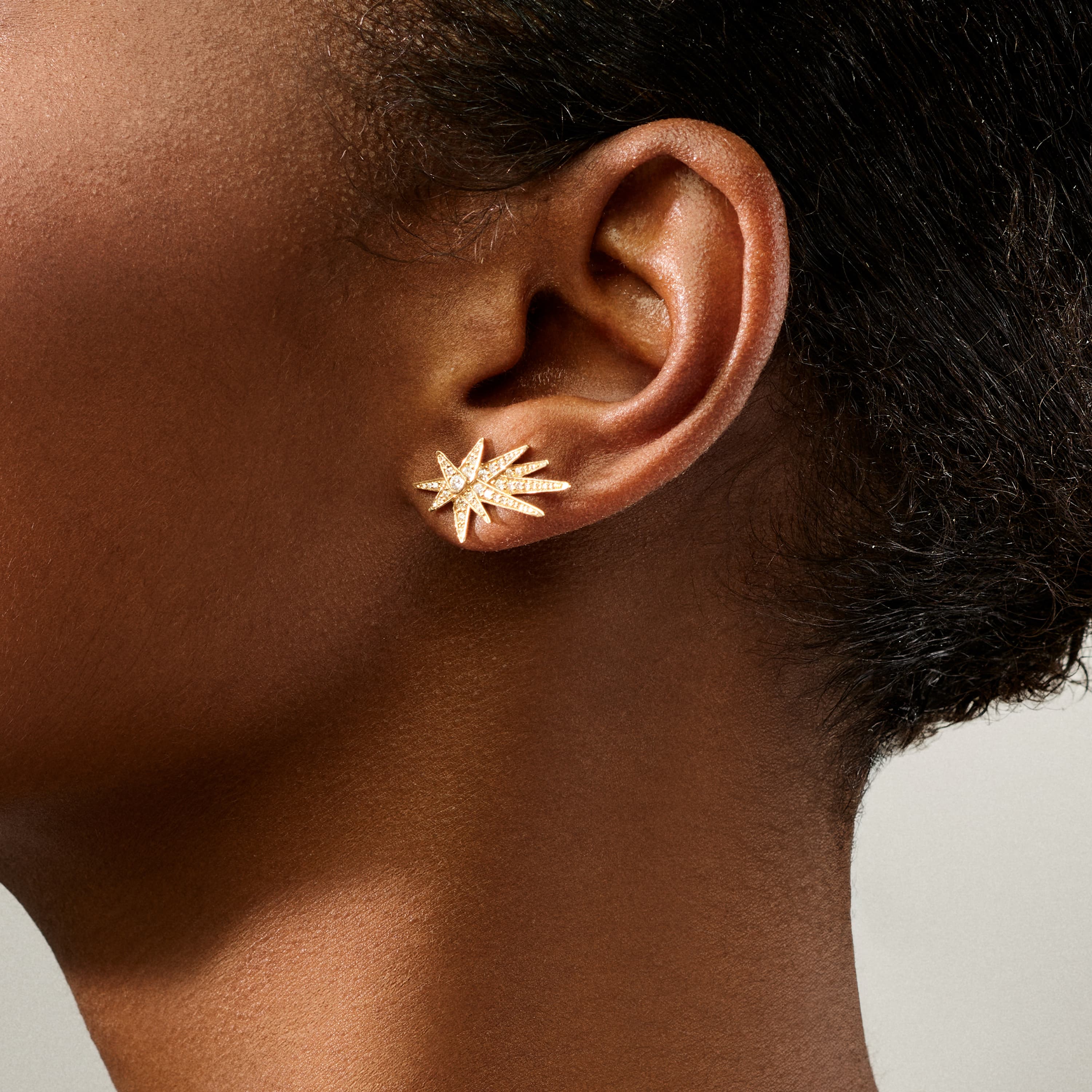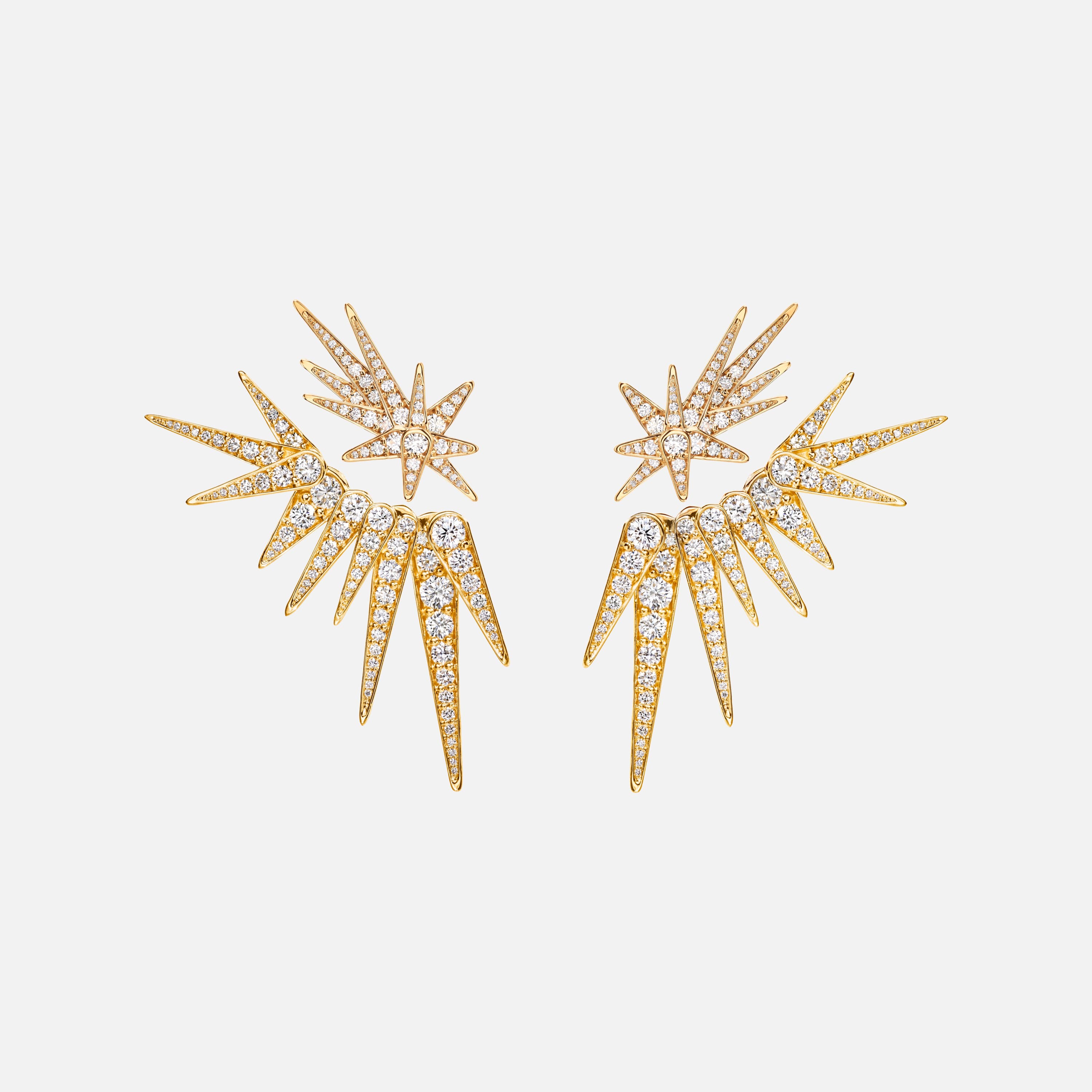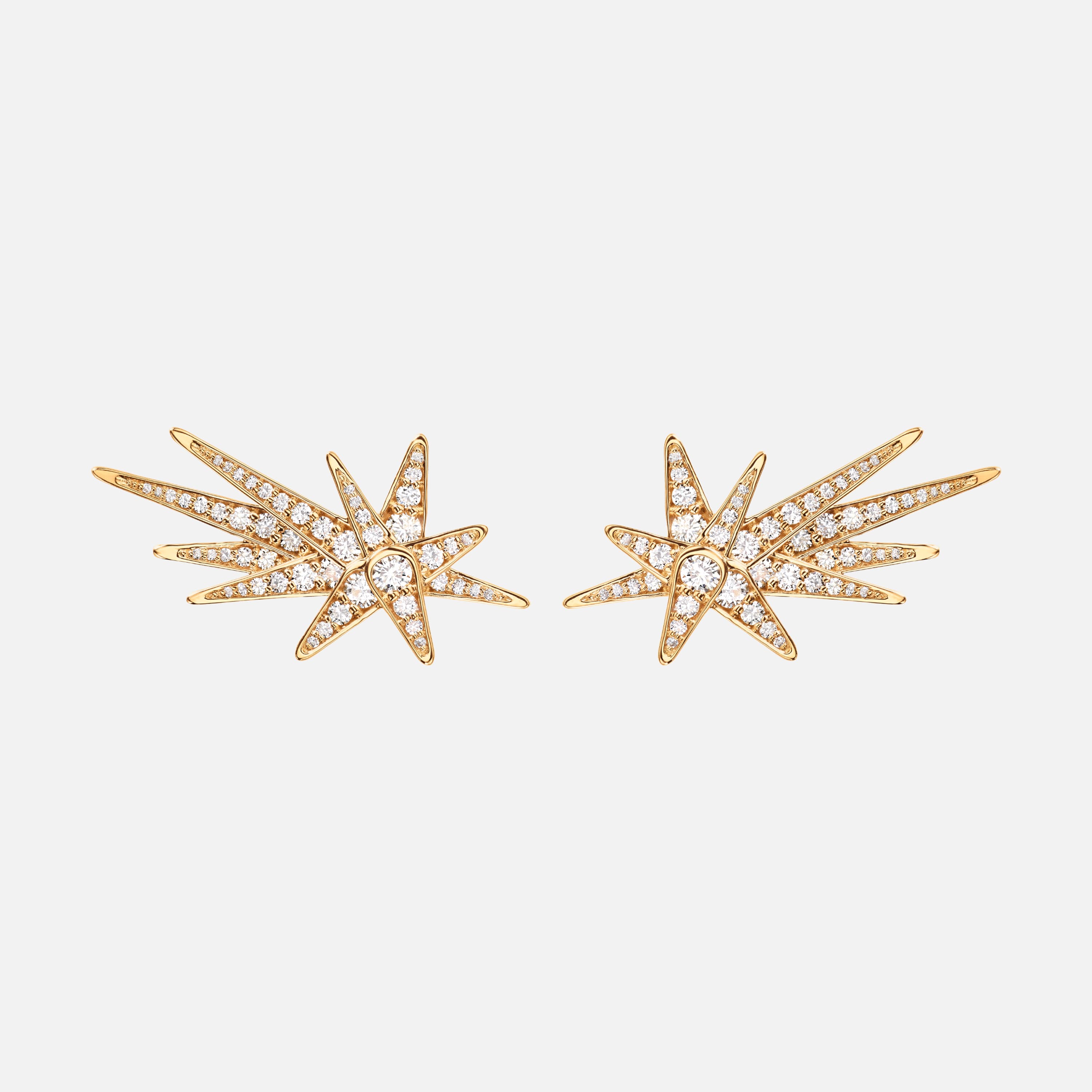 Designed by Charlotte Lynggaard. These Funky Shooting Stars stud earrings are crafted from 18 karat yellow gold and 104 diamonds totalling 0.54 carat TW. VS. The Funky Stars Collection is brought to life by new, intricate techniques creating a range of edgy expressions. Composed by layers of brilliant-cut diamonds, the Funky Stars have a multidimensional structure of exceptional sparkle.