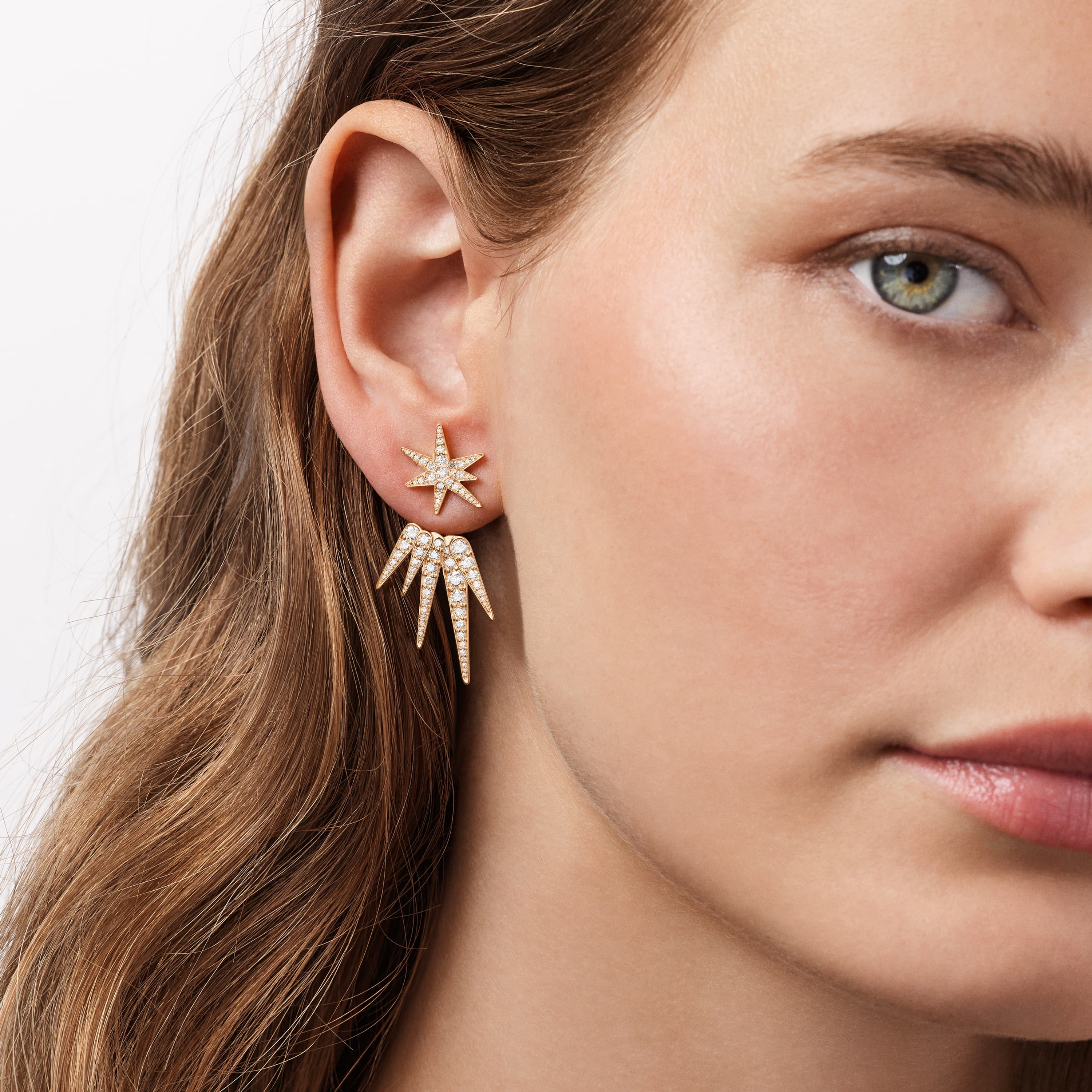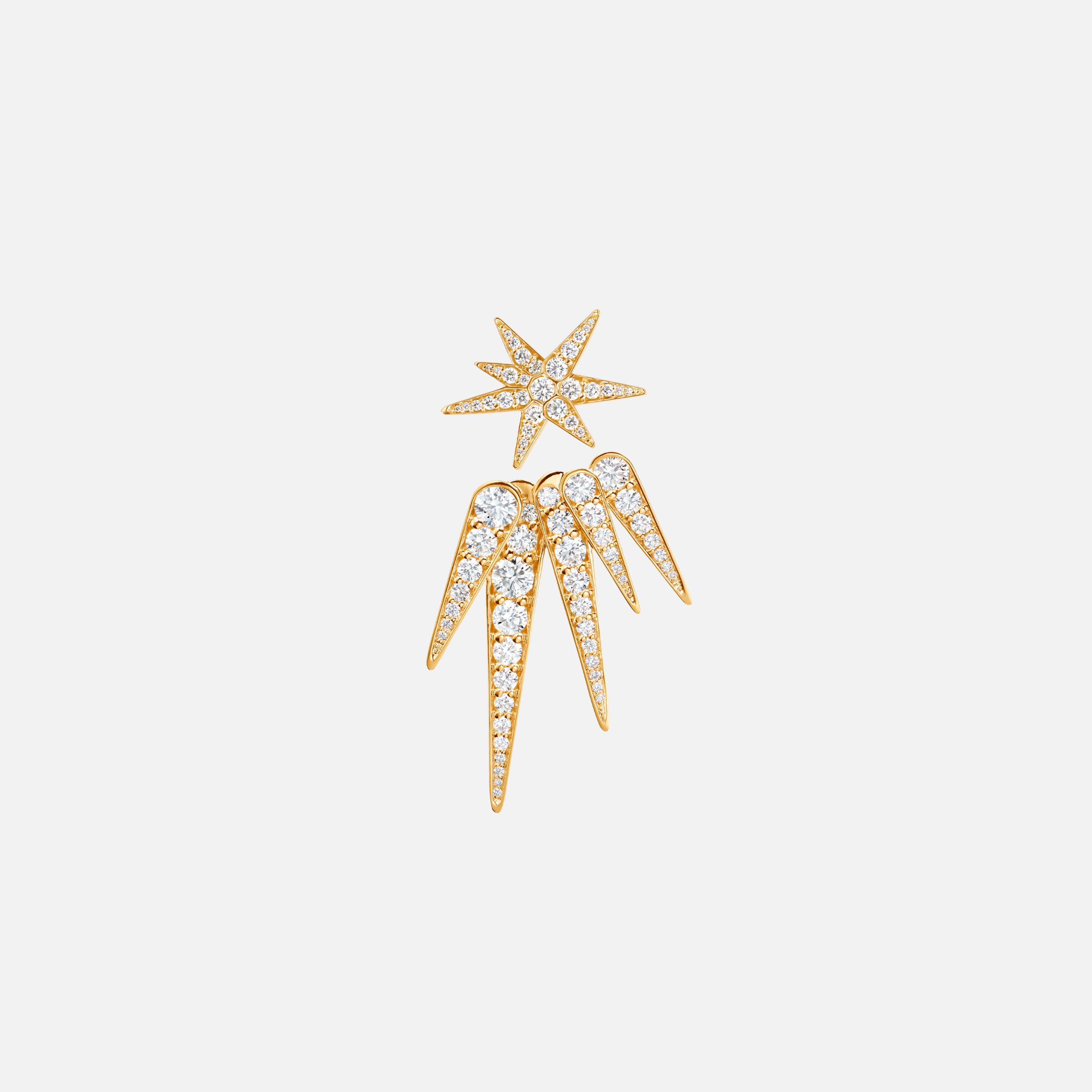 Designed by Charlotte Lynggaard. This Funky Stars 5-pointed earring pendant is crafted from 18 karat yellow gold and 44 diamonds totalling 0.61 carat TW. VS. The Funky Stars Collection is brought to life by new, intricate techniques creating a range of edgy expressions. Composed by layers of brilliant-cut diamonds, the Funky Stars have a multidimensional structure of exceptional sparkle. 19 mm at the widest point.
