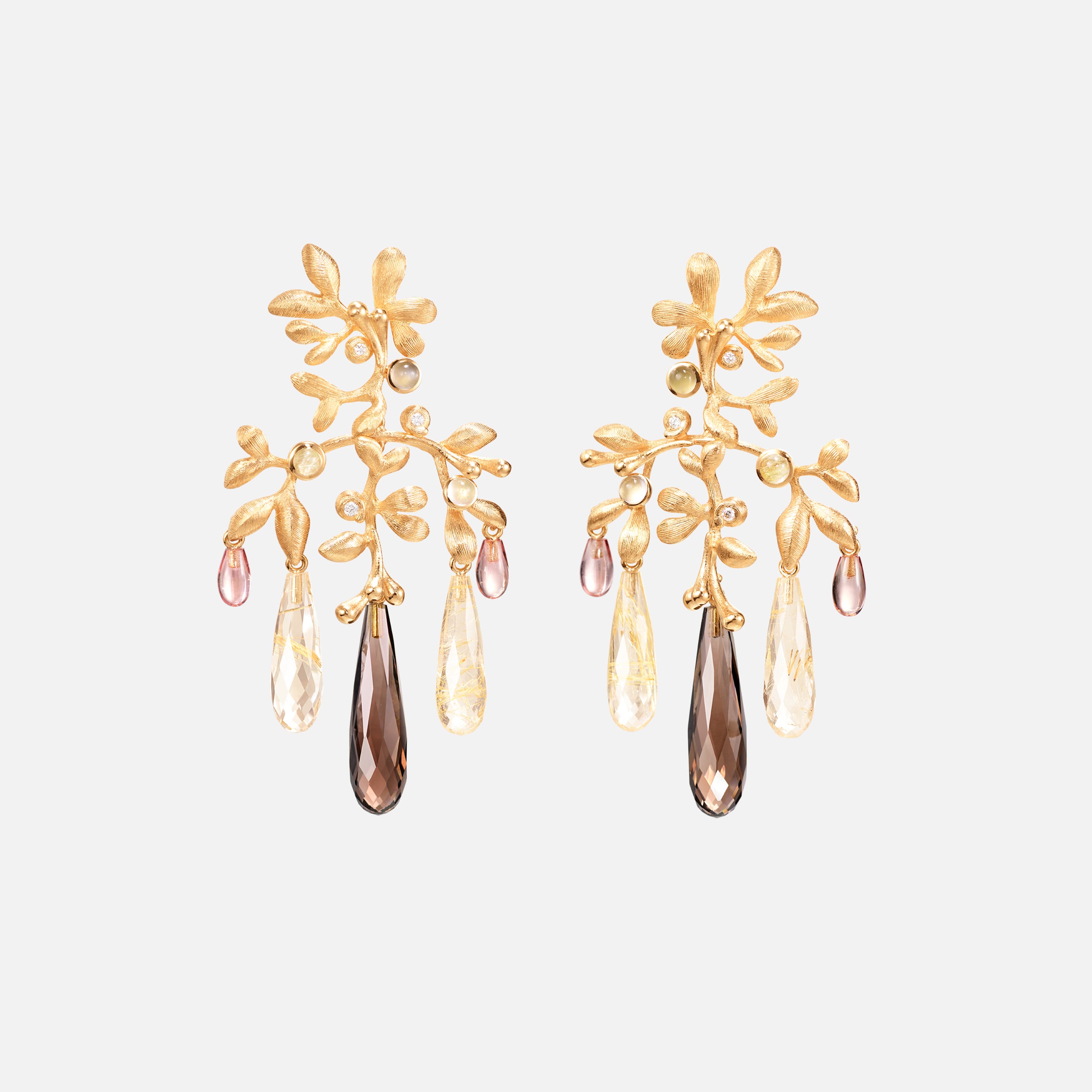 Designed by Charlotte Lynggaard, these Gipsy earrings medium are crafted from 18 karat yellow set with smoky quartz, rutile quartz, brown peach tourmalines, rose quartz, grey moonstones, and 6 brilliant-cut diamonds totalling 0.06 ct. TW VS. Total length: 6 cm. Sold as a pair. Part of The Gipsy Collection. Please note: As gemstones are natural materials, each stone is absolutely unique. They will vary in colour and have individual, unique inclusions and features. Web-images of stones are only representatives of the unique stone you will receive when ordering the product, not the exact stone.