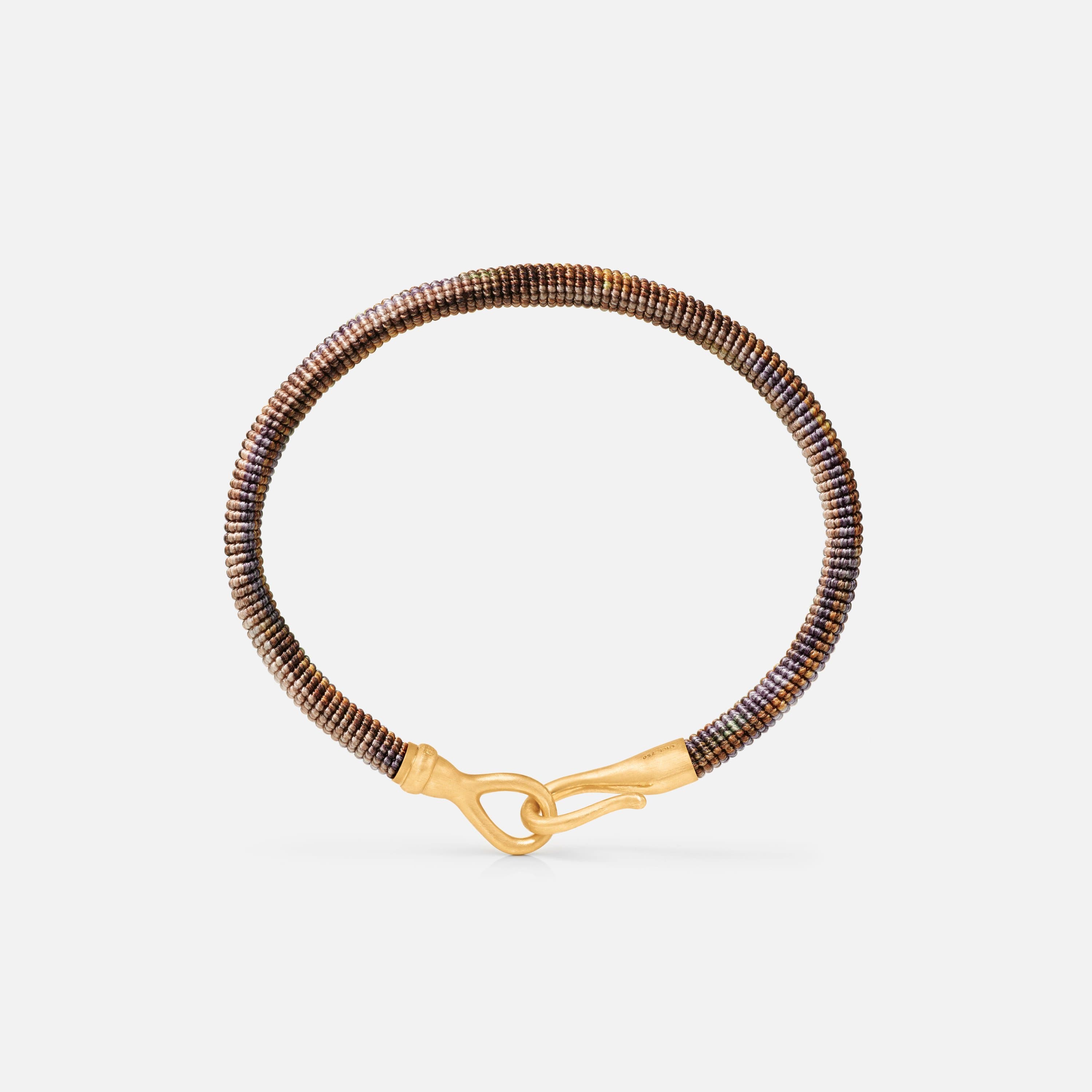 Designed by Charlotte Lynggaard, the Life Velvet bracelet is hand-knotted using 11 strings, each one woven from 6 hand-dyed threads. The brand-stamped hook fastening is hand-crafted by master goldsmiths from 18 karat, brushed yellow gold. from 18 karat, brushed yellow gold. The bracelet measures 3 mm in width and is available in lengths of 15, 16, 17, 18, 19, 20, or 21 cm. Part of the Life Collection.
