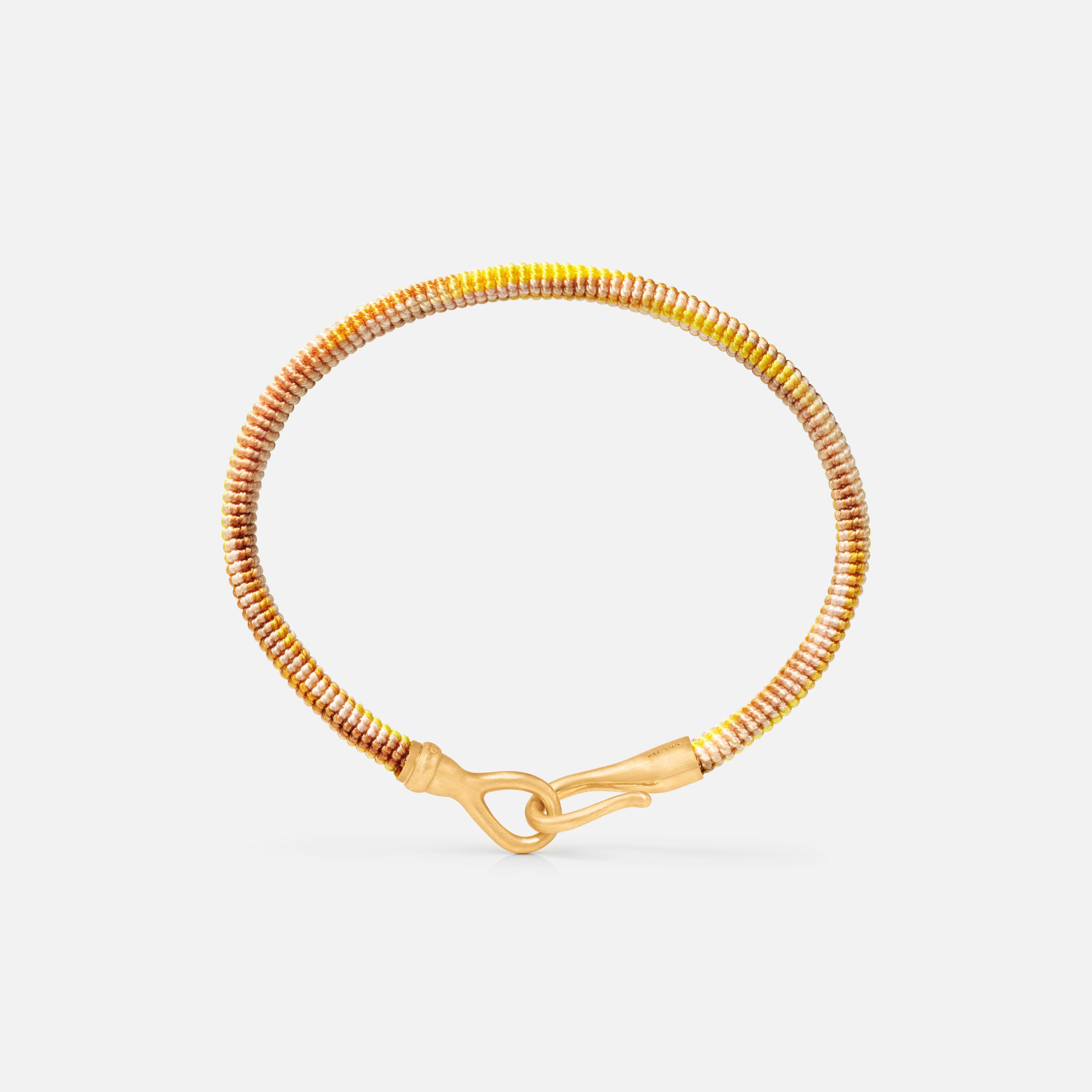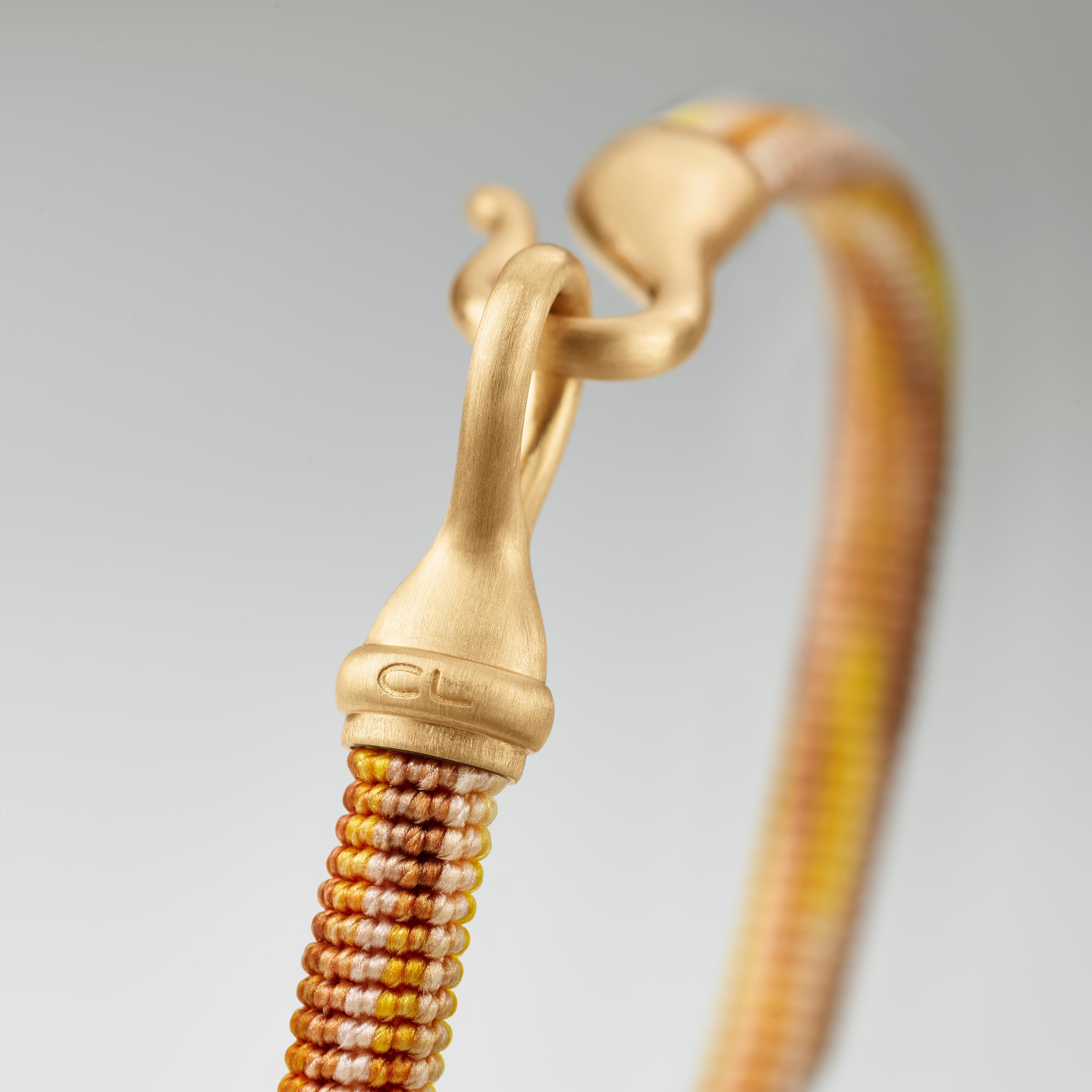 Designed by Charlotte Lynggaard, the Life Golden bracelet is hand-knotted using 11 strings, each one woven from 6 hand-dyed threads. The brand-stamped hook fastening is hand-crafted by master goldsmiths from 18 karat, brushed yellow gold. from 18 karat, brushed yellow gold. The bracelet measures 3 mm in width and is available in lengths of 15, 16, 17, 18, 19, 20, or 21 cm. Part of the Life Collection.