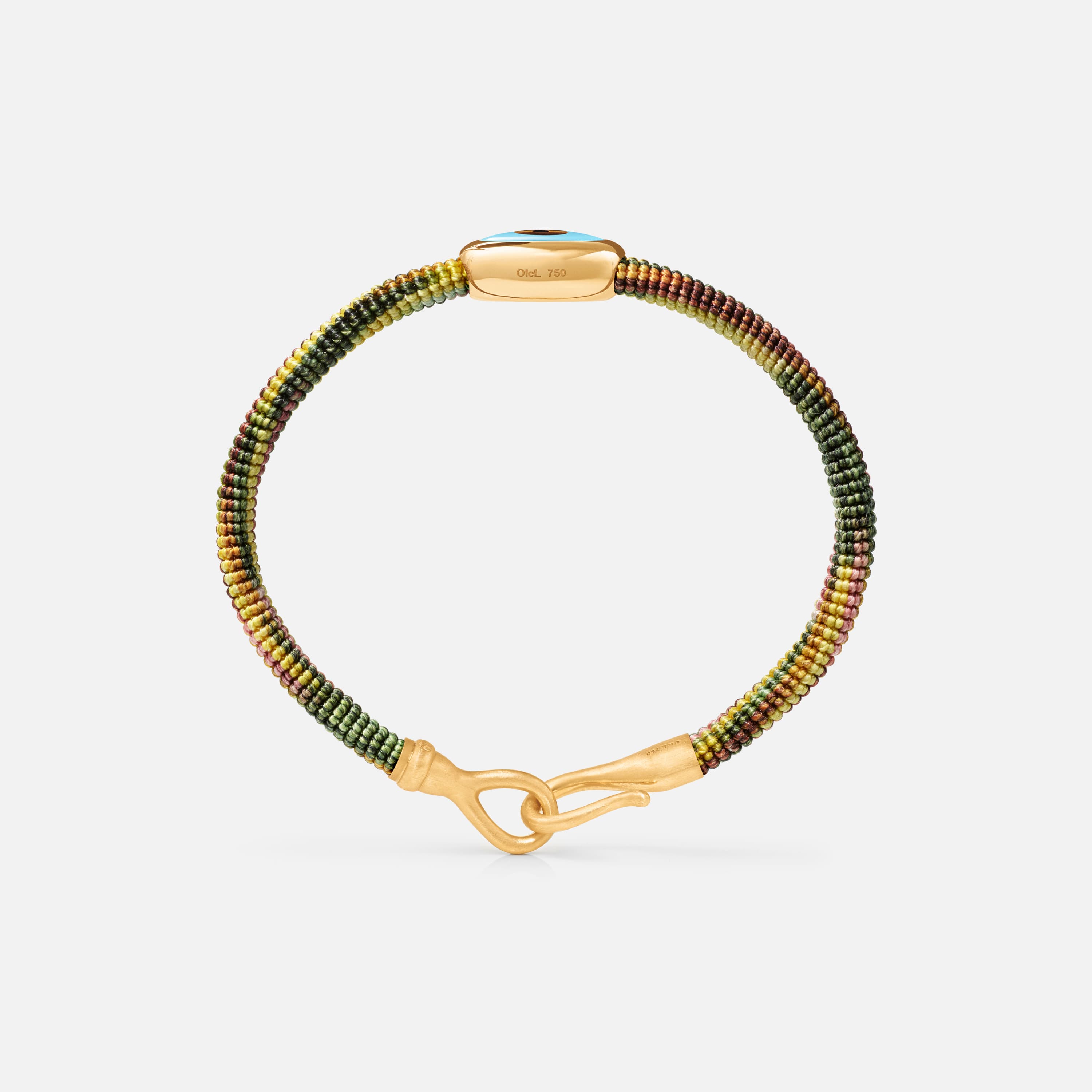Designed by Charlotte Lynggaard, the Life Plum bracelet with evil eye charm is hand-knotted using 11 strings, each one woven from 6 hand-dyed threads. The brand-stamped hook fastening is hand-crafted by master goldsmiths from 18 karat, brushed yellow gold. The 13x9x2,5 mm evil eye and is set in 18 karat, polished yellow gold. The bracelet measures 6 mm in width and is available in lengths of 15, 16, 17, 18, 19, 20, or 21 cm. Part of the Life Collection.