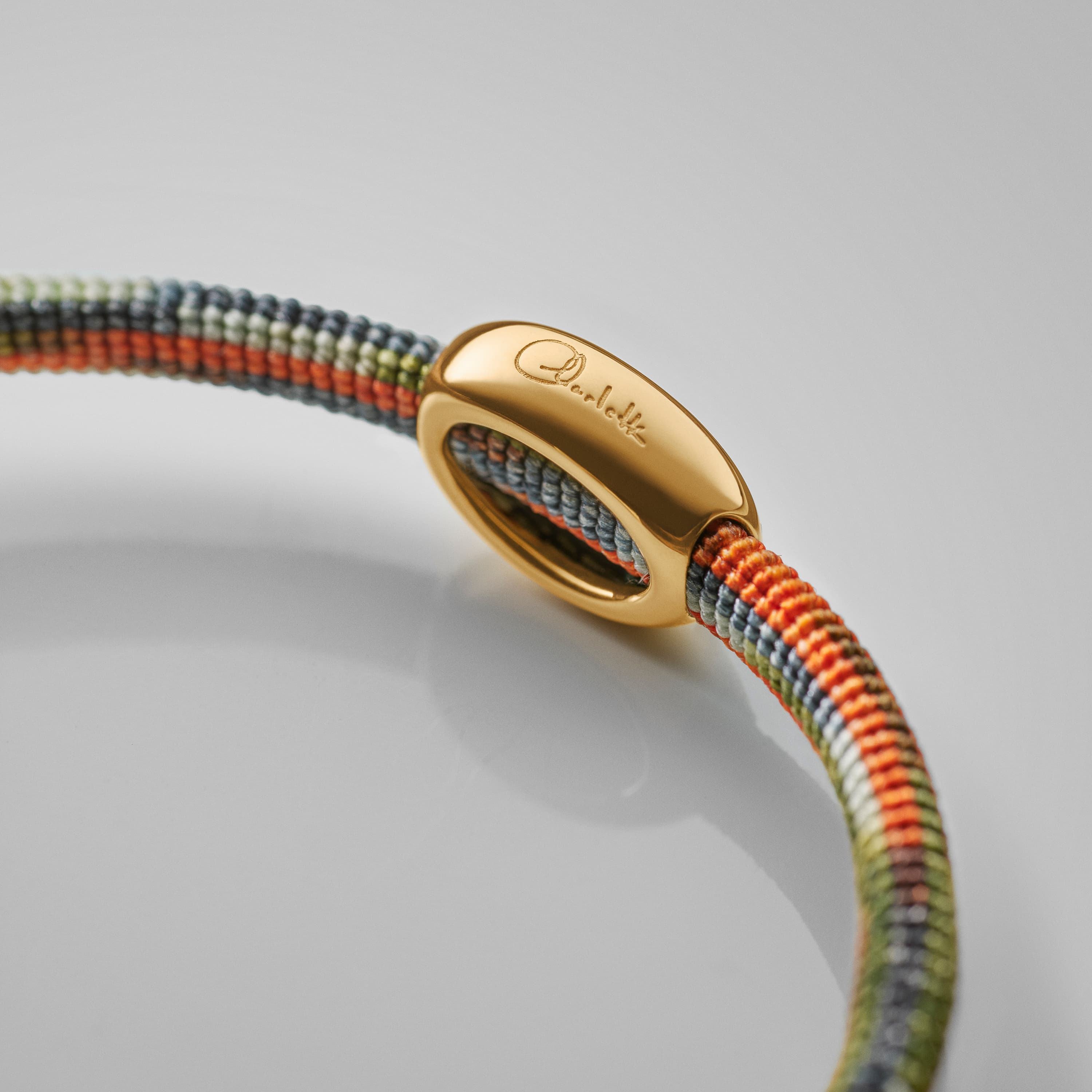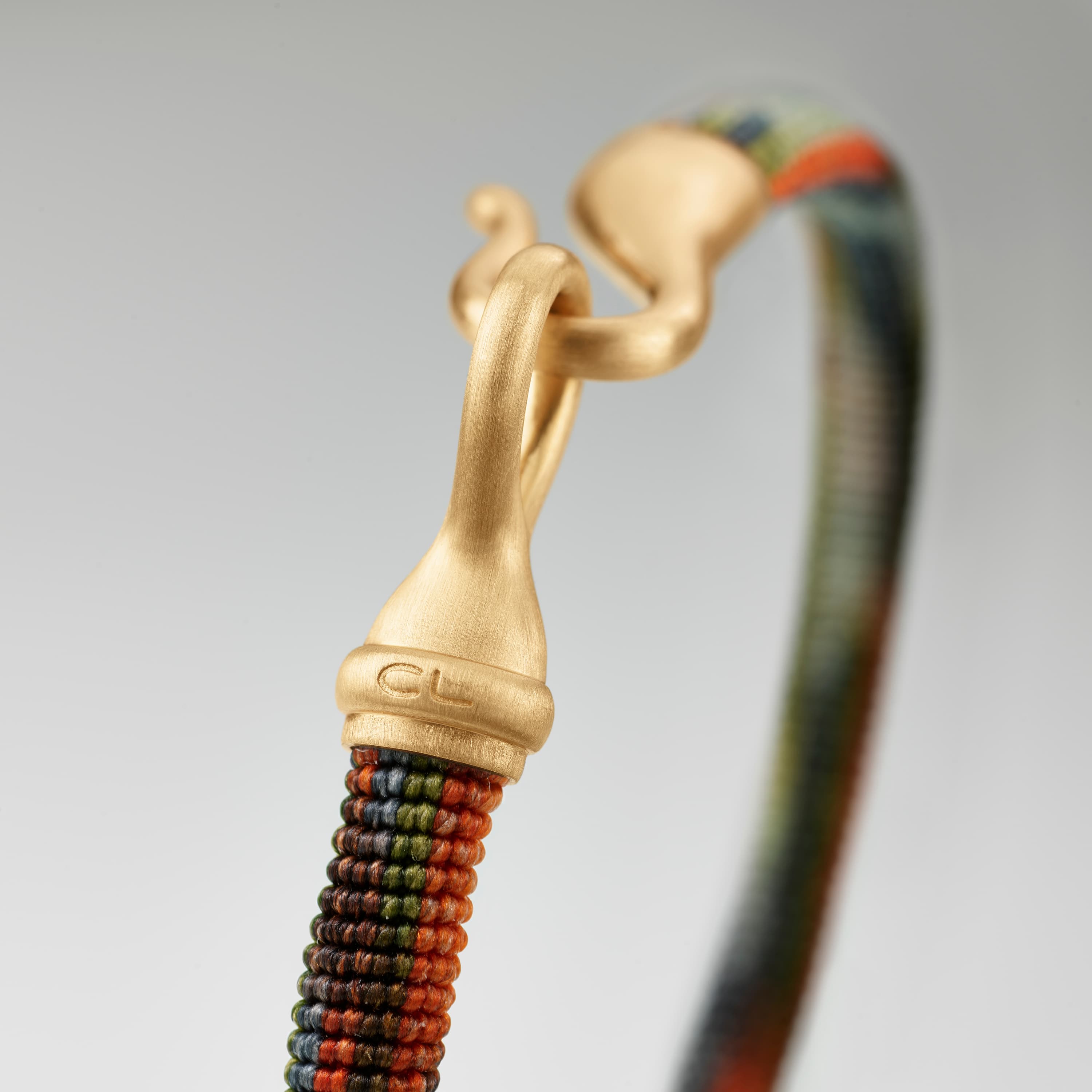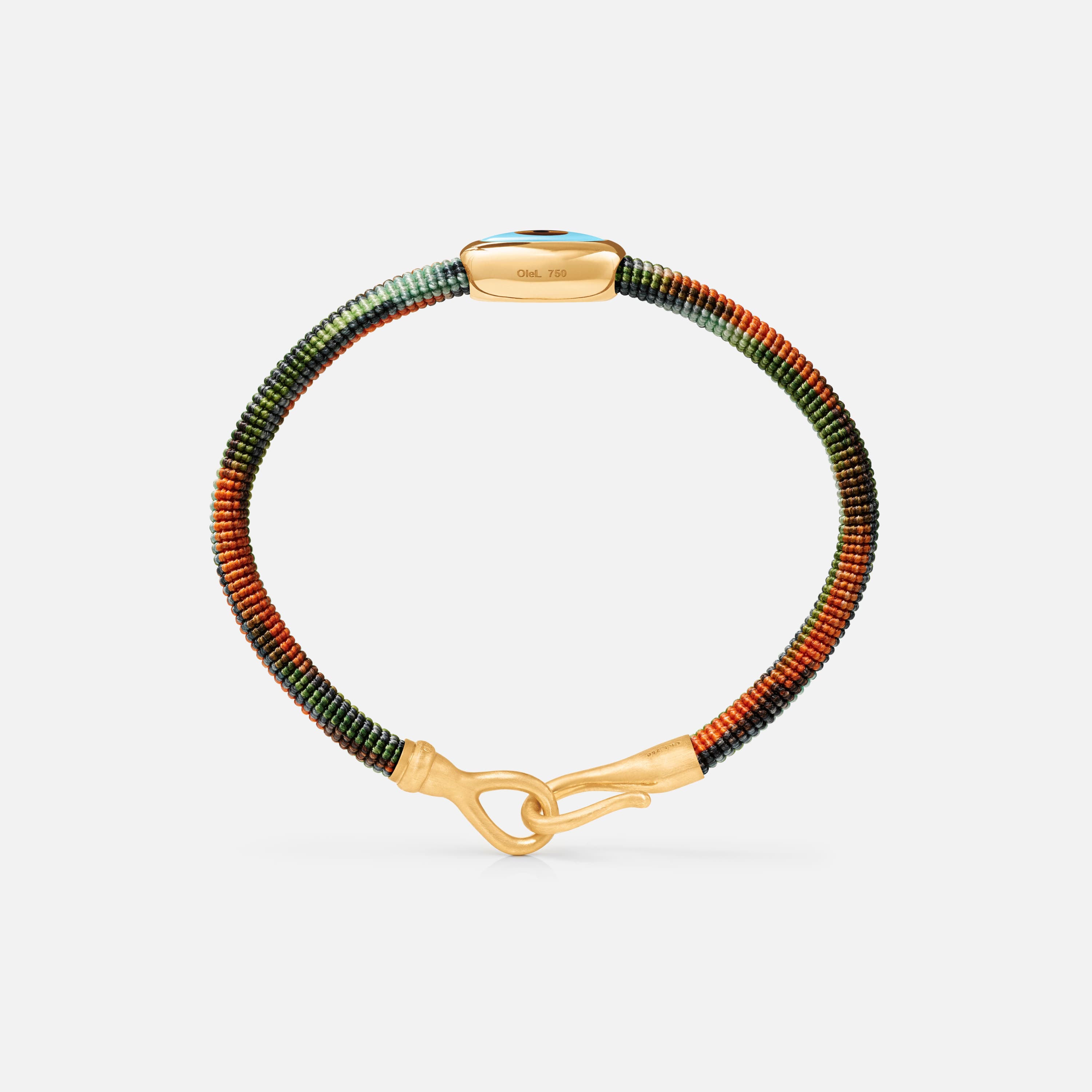 Designed by Charlotte Lynggaard, the Life Tropic bracelet with evil eye charm is hand-knotted using 11 strings, each one woven from 6 hand-dyed threads. The brand-stamped hook fastening is hand-crafted by master goldsmiths from 18 karat, brushed yellow gold. The 13x9x2,5 mm evil eye and is set in 18 karat, polished yellow gold. The bracelet measures 6 mm in width and is available in lengths of 15, 16, 17, 18, 19, 20, or 21 cm. Part of the Life Collection.