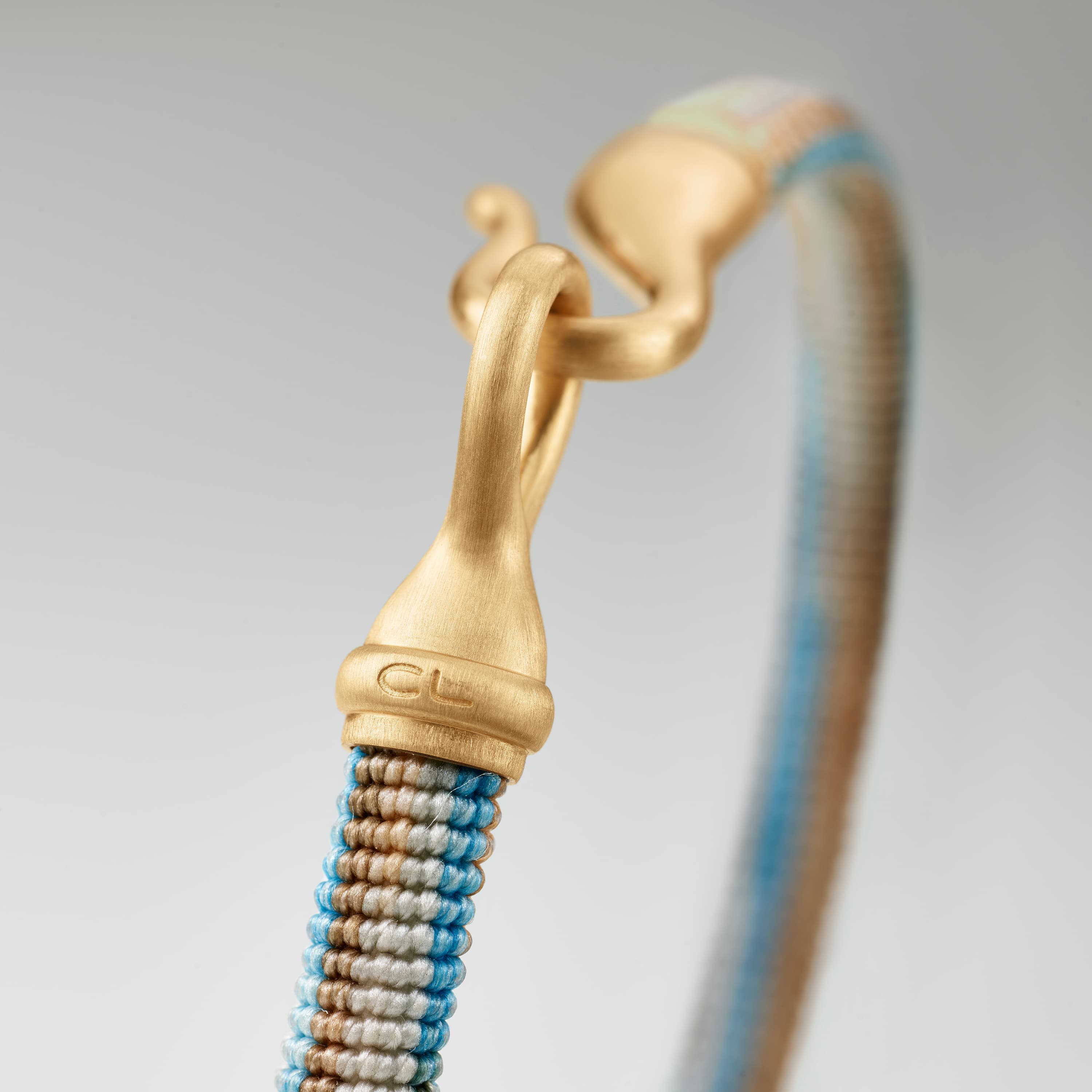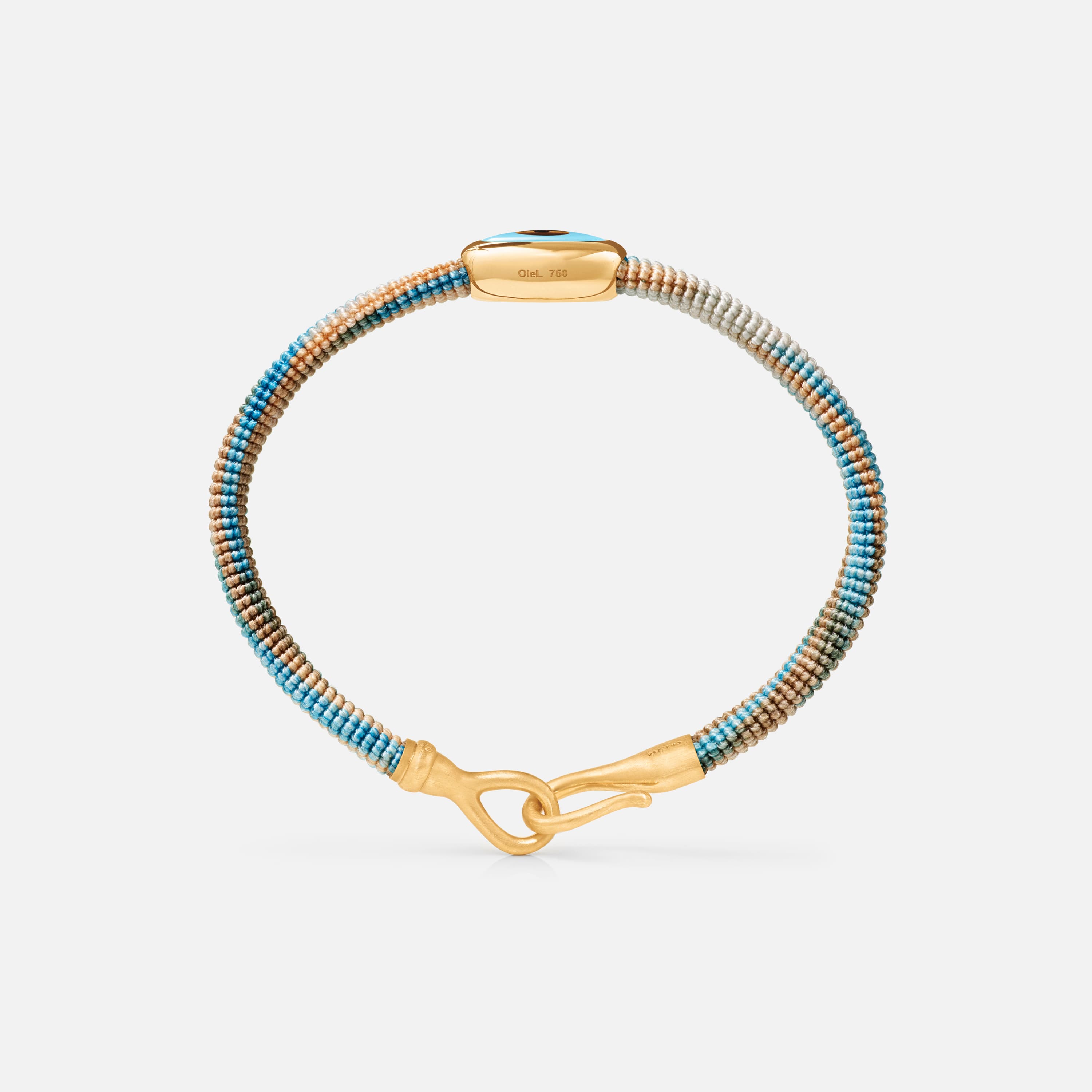 Designed by Charlotte Lynggaard, the Life Cornflower bracelet with evil eye charm is hand-knotted using 11 strings, each one woven from 6 hand-dyed threads. The brand-stamped hook fastening is hand-crafted by master goldsmiths from 18 karat, brushed yellow gold. The 13x9x2,5 mm evil eye and is set in 18 karat, polished yellow gold. The bracelet measures 6 mm in width and is available in lengths of 15, 16, 17, 18, 19, 20, or 21 cm. Part of the Life Collection.