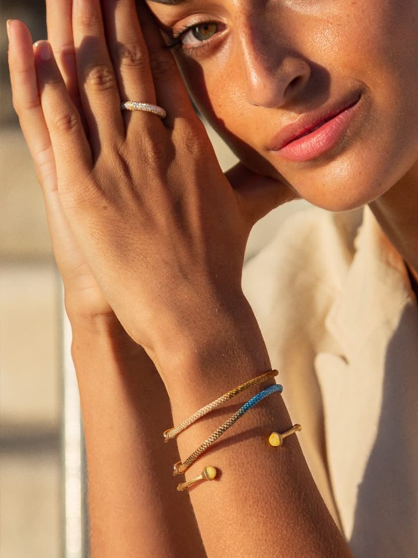 Designed by Charlotte Lynggaard, the Life Golden Day bracelet is hand-knotted using 8 strings, each one woven from 6 hand-dyed threads. The brand-stamped hook fastening is hand-crafted by master goldsmiths from 18 karat, hardened and polished yellow gold. The bracelet measures 3 mm in width and is available in lengths of 15, 16, 17, 18, 19, 20, or 21 cm. Part of the Life Collection.