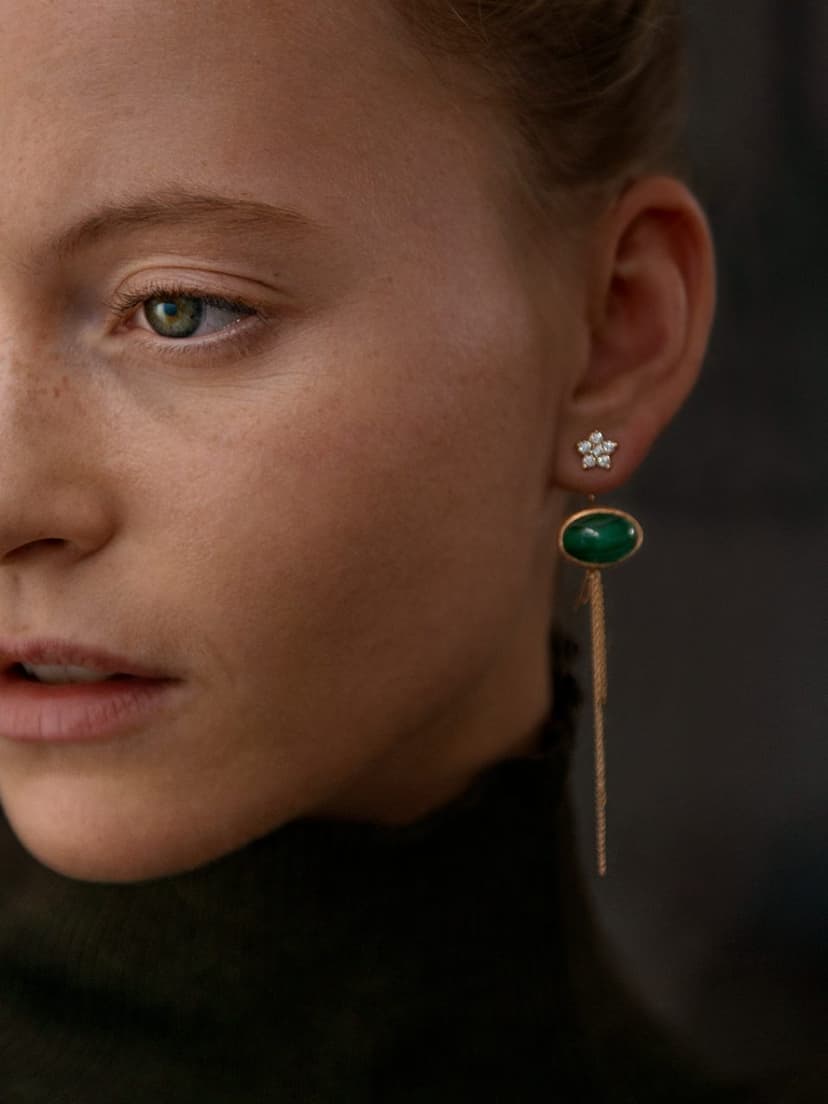 Designed by Charlotte Lynggaard, the Lotus earring pendants small are crafted from 18 karat yellow gold with malachite cabochons. The visible gold surfaces are hand-satinised by master goldsmiths. Suitable for use with stud earrings. Extra eyelets on the backs for hanging pendants with hook fastenings. Sold as a pair. Part of the Lotus Collection.