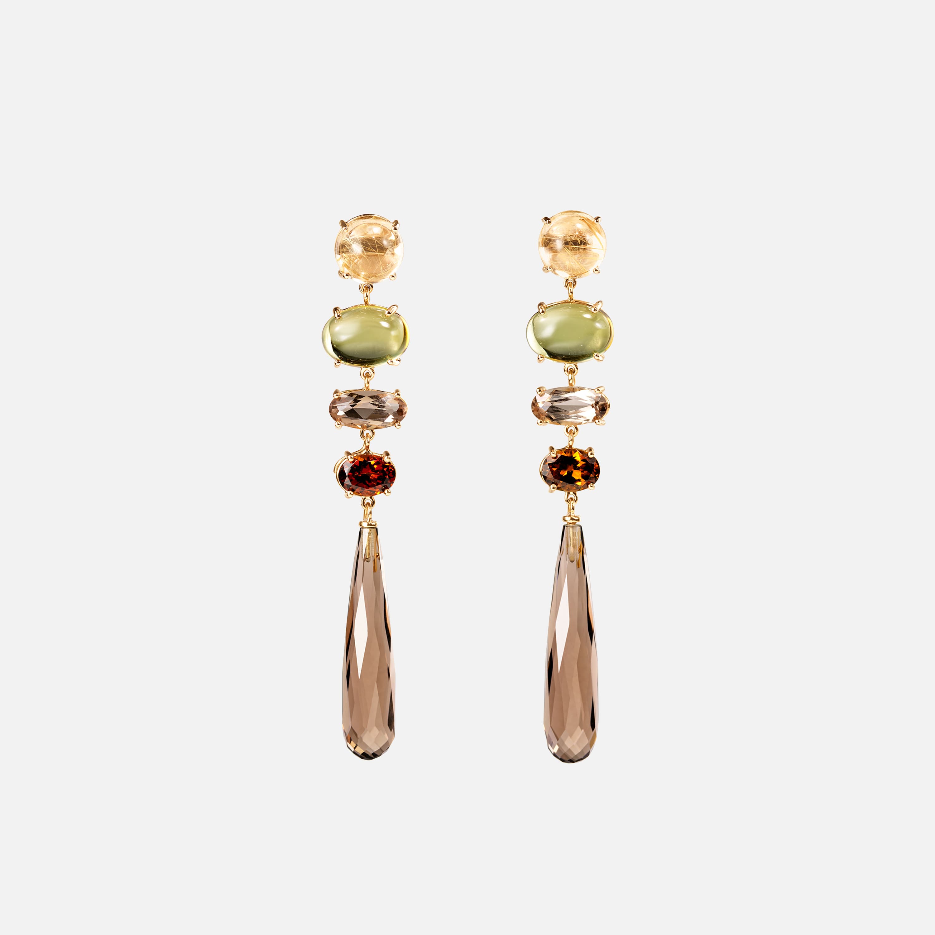 Designed by Charlotte Lynggaard, this pair of Lotus earrings is crafted in 18 karat yellow gold set with rutile quartz, green tourmalines, smoky quartz, Hessonite garnet, and smoky quartz drops. The detachable drops are finished with an elegant hook fastening, allowing for versatile wearing. This is a limited edition design available only with a curated selection of unique gemstones, with the possibility of bespoke variations. Sold as a pair. Handcrafted by master goldsmiths. Part of The Lotus Collection. Details upon request.