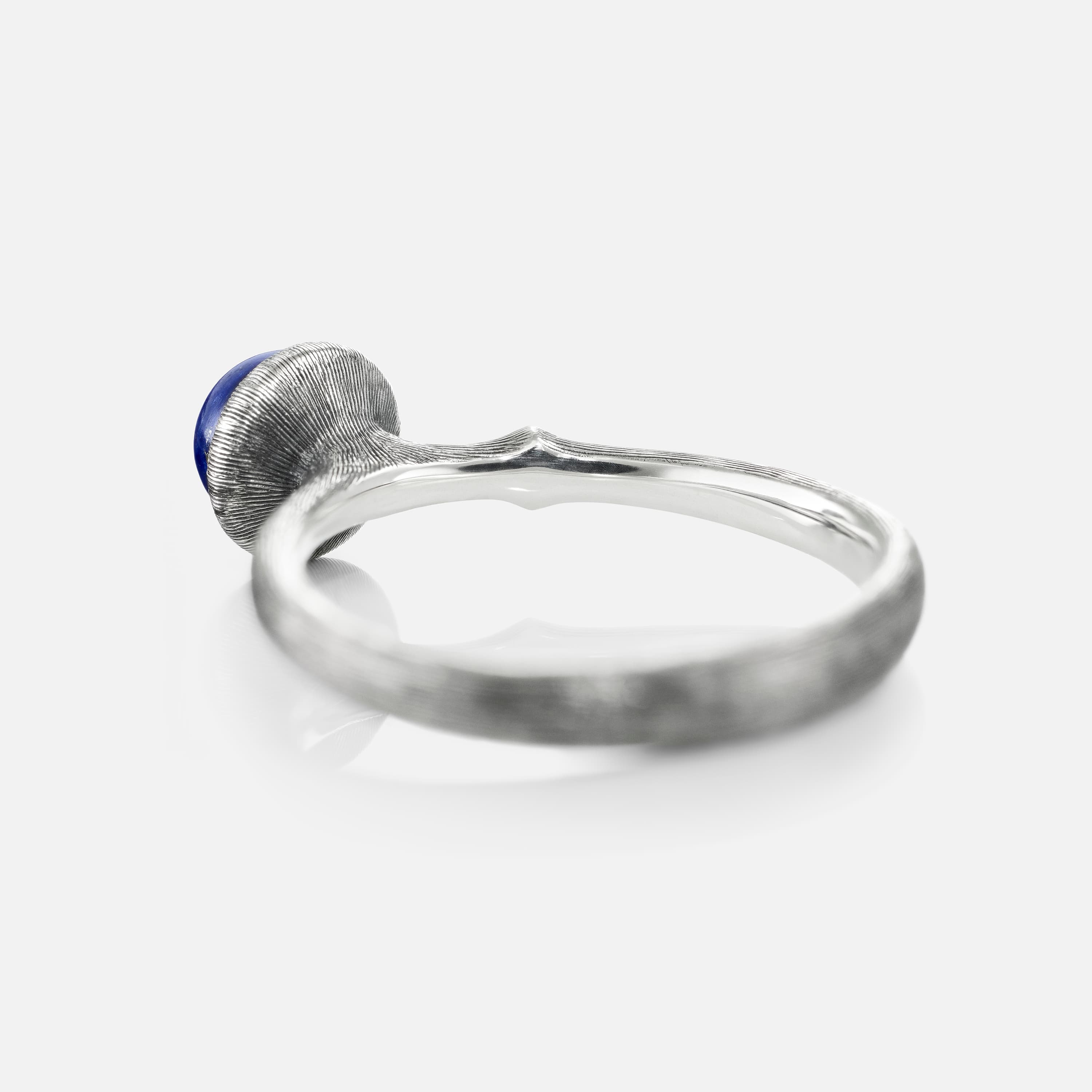 Designed by Charlotte Lynggaard, the Lotus ring, size 0, is crafted from oxidized Sterling silver and is set with a lapis lazuli cabochon. Handcrafted by master goldsmiths, the visible silver surface is hand-satinised, whilst the inside of the ring has a polished finish. Part of the Lotus Collection.