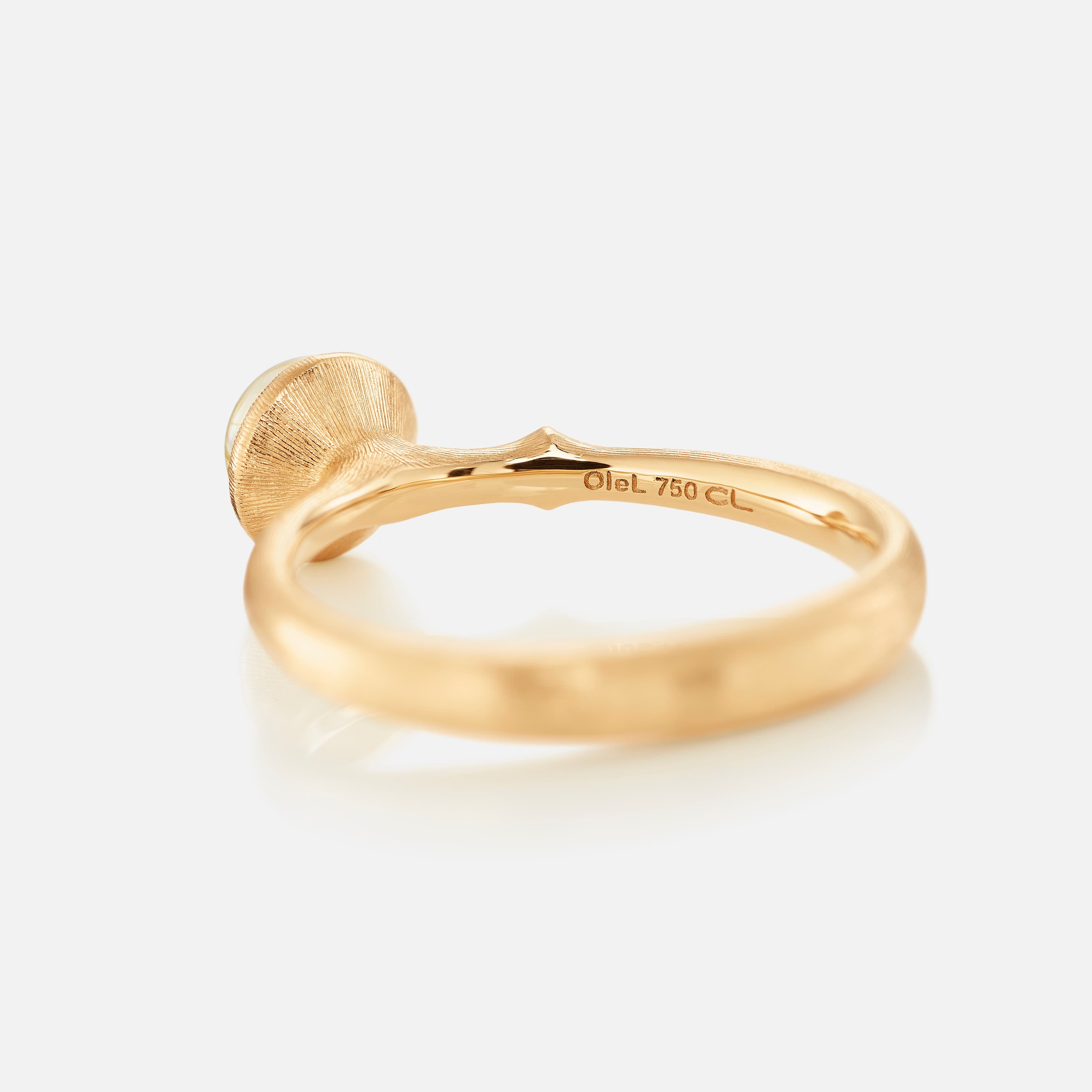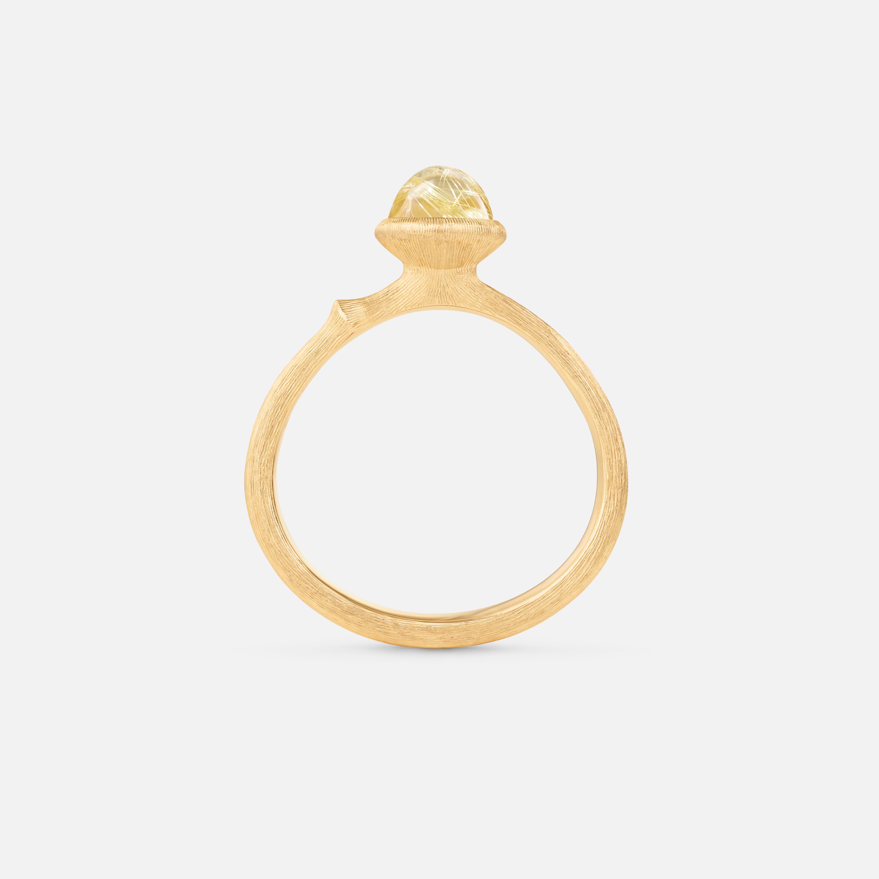 Designed by Charlotte Lynggaard, the Lotus ring, size 0, is crafted from 18 karat yellow gold and is set with a rutile quartz cabochon. Handcrafted by master goldsmiths, the visible gold surface is hand-satinised, whilst the inside of the ring has a polished finish. Part of the Lotus Collection. Please note: As gemstones are natural materials, each stone is absolutely unique. They will vary in colour and have individual, unique inclusions and features. Web-images of stones are only representatives of the unique stone you will receive when ordering the product, not the exact stone.