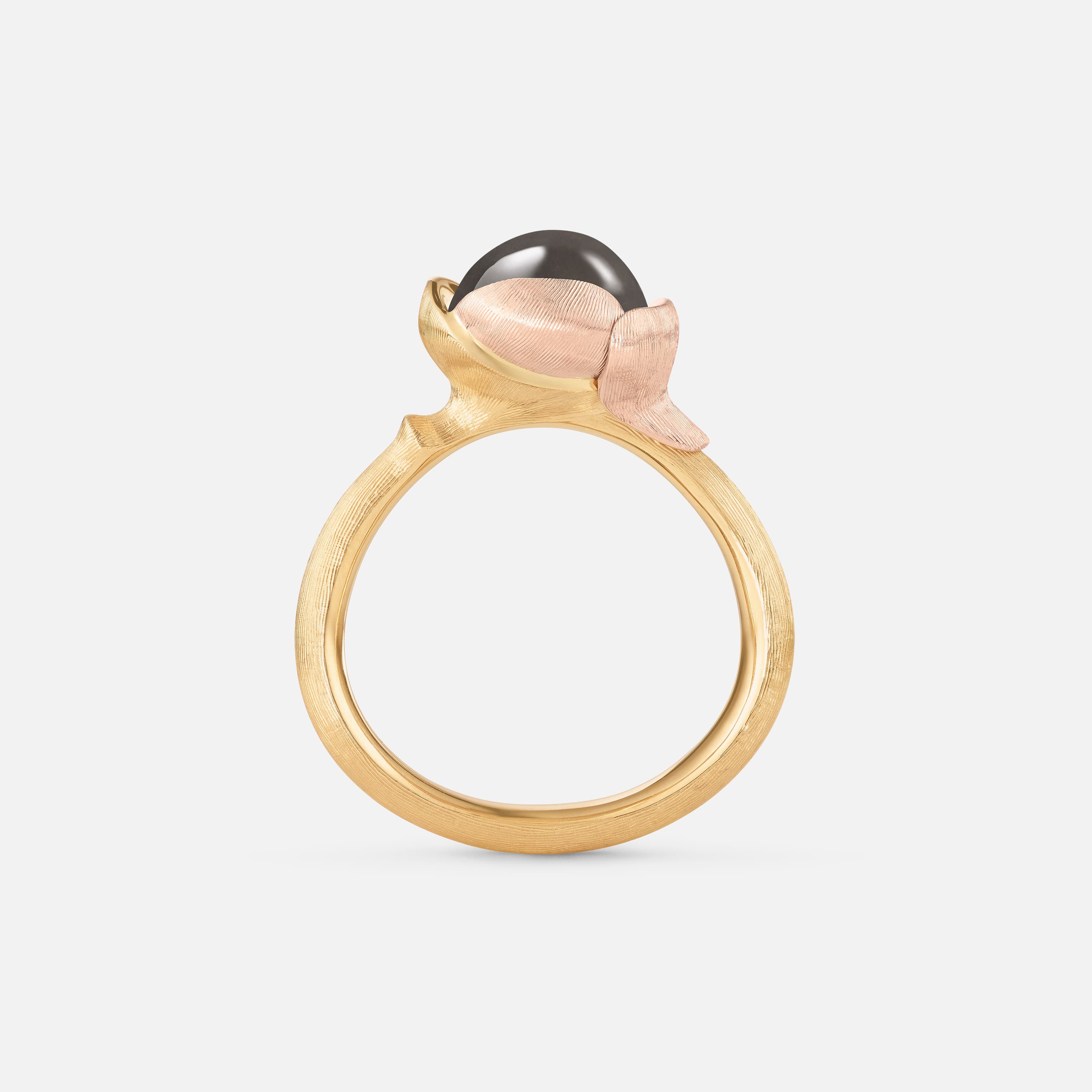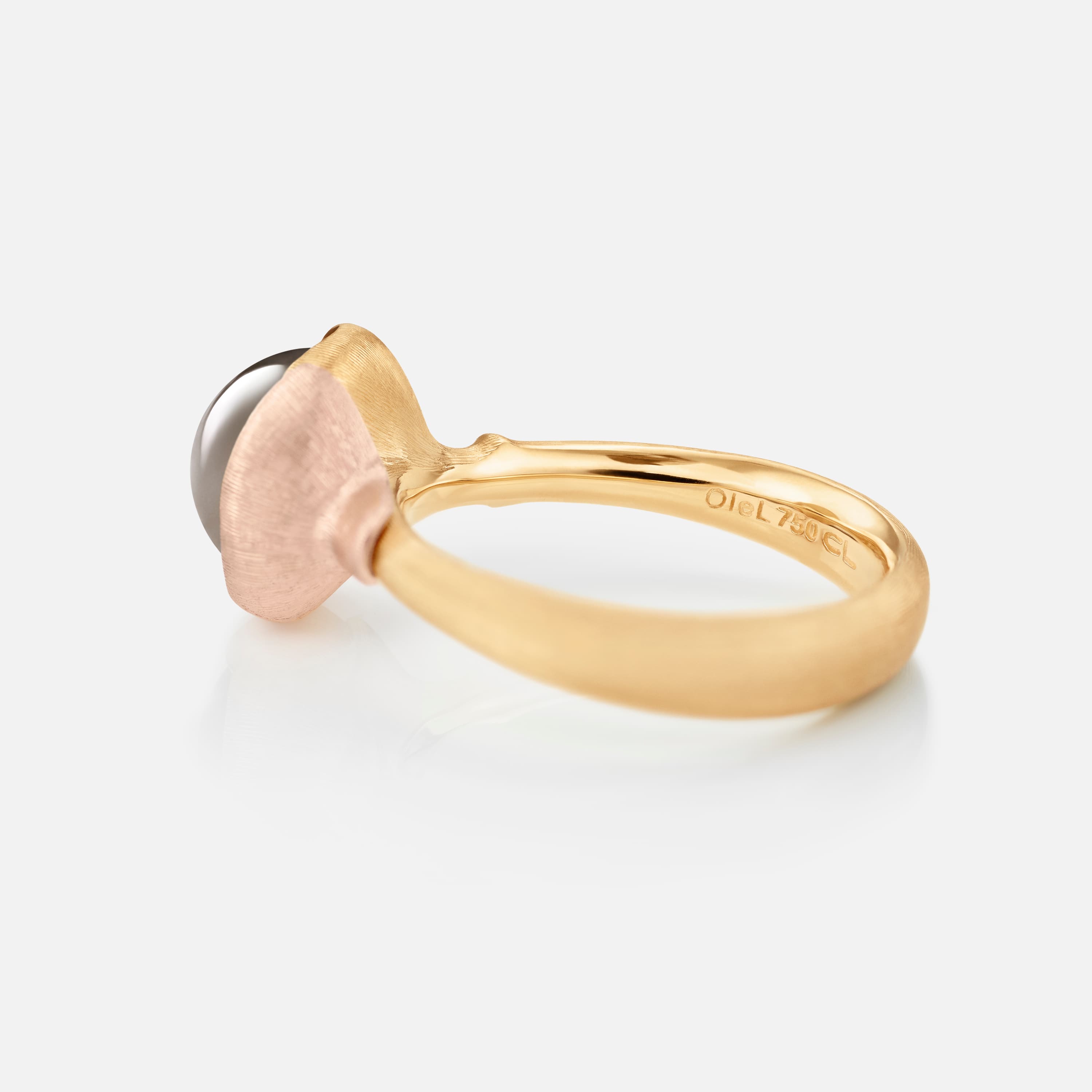 Designed by Charlotte Lynggaard, the Lotus ring, size 1, is crafted from 18 karat yellow and rose gold with a grey moonstone cabochon. Handcrafted by master goldsmiths, the visible gold surfaces are hand-satinised, whilst the inside of the ring has a polished finish. Part of the Lotus Collection. Please note: As gemstones are natural materials, each stone is absolutely unique. They will vary in colour and have individual, unique inclusions and features. Web-images of stones are only representatives of the unique stone you will receive when ordering the product, not the exact stone.