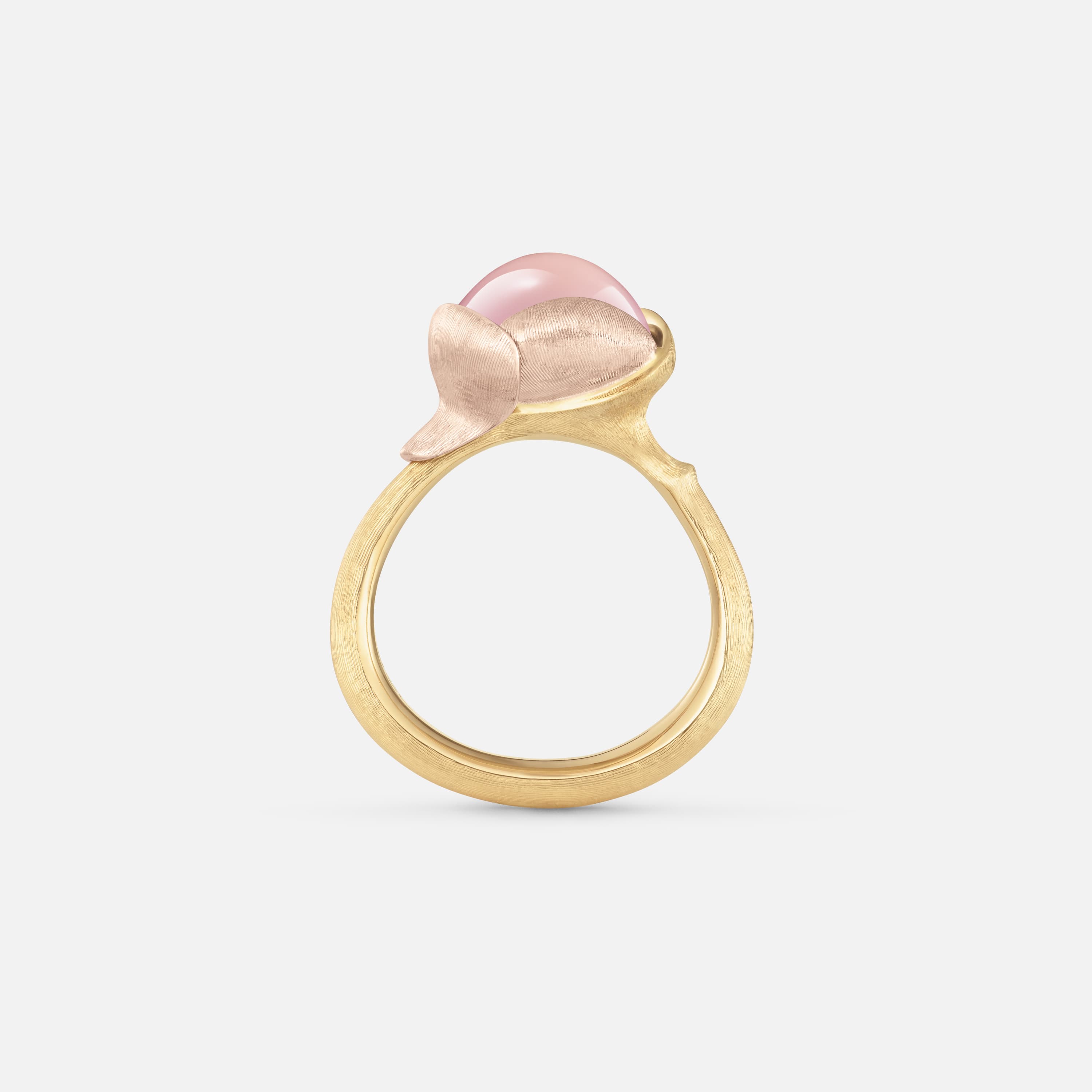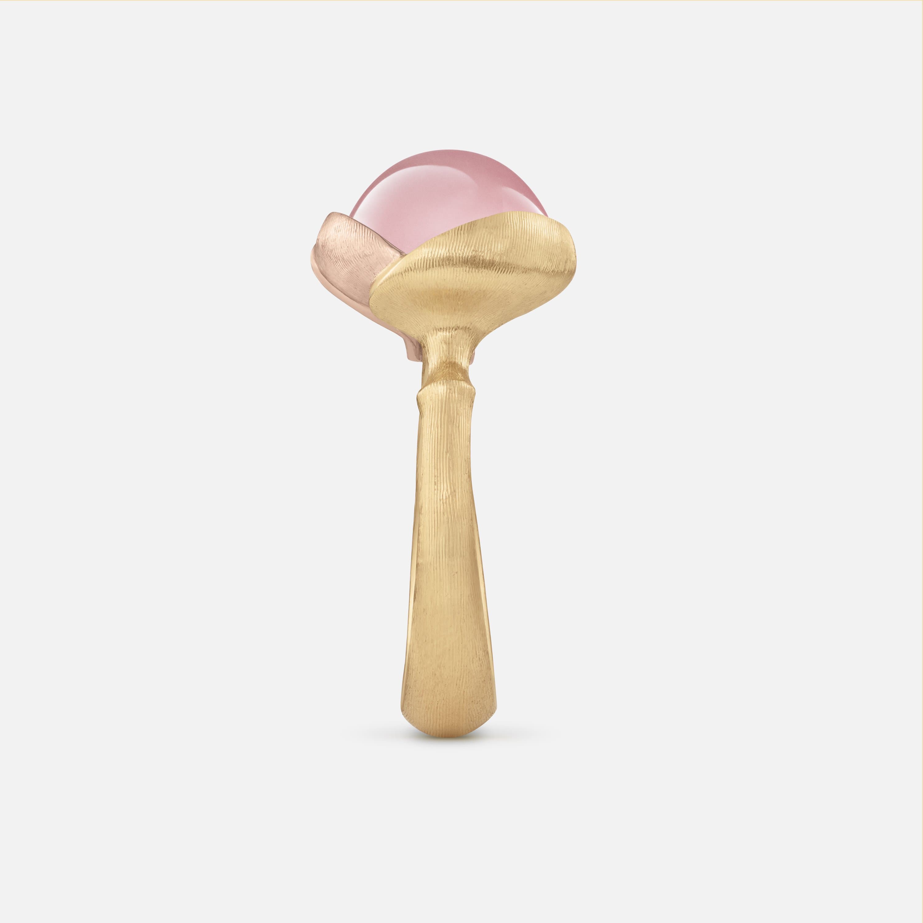 Designed by Charlotte Lynggaard, the Lotus ring, size 2, is crafted from 18 karat yellow and rose gold with a rose quartz cabochon. Handcrafted by master goldsmiths, the visible gold surfaces are hand-satinised, whilst the inside of the ring has a polished finish. Part of the Lotus Collection.