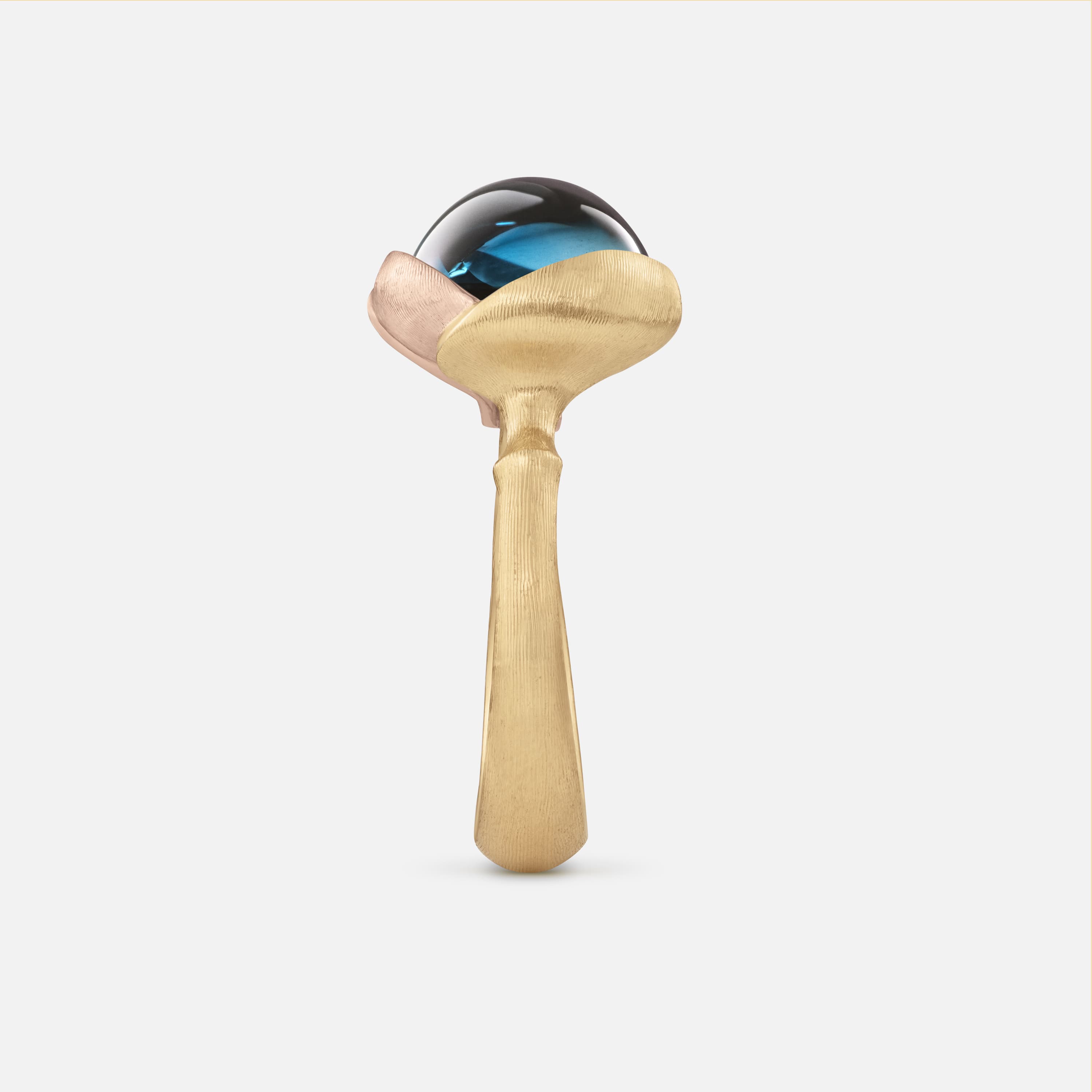 Designed by Charlotte Lynggaard, the Lotus ring, size 2, is crafted from 18 karat yellow and rose gold with a London blue topaz cabochon. Handcrafted by master goldsmiths, the visible gold surfaces are hand-satinised, whilst the inside of the ring has a polished finish. Part of the Lotus Collection. Please note: As gemstones are natural materials, each stone is absolutely unique. They will vary in colour and have individual, unique inclusions and features. Web-images of stones are only representatives of the unique stone you will receive when ordering the product, not the exact stone.