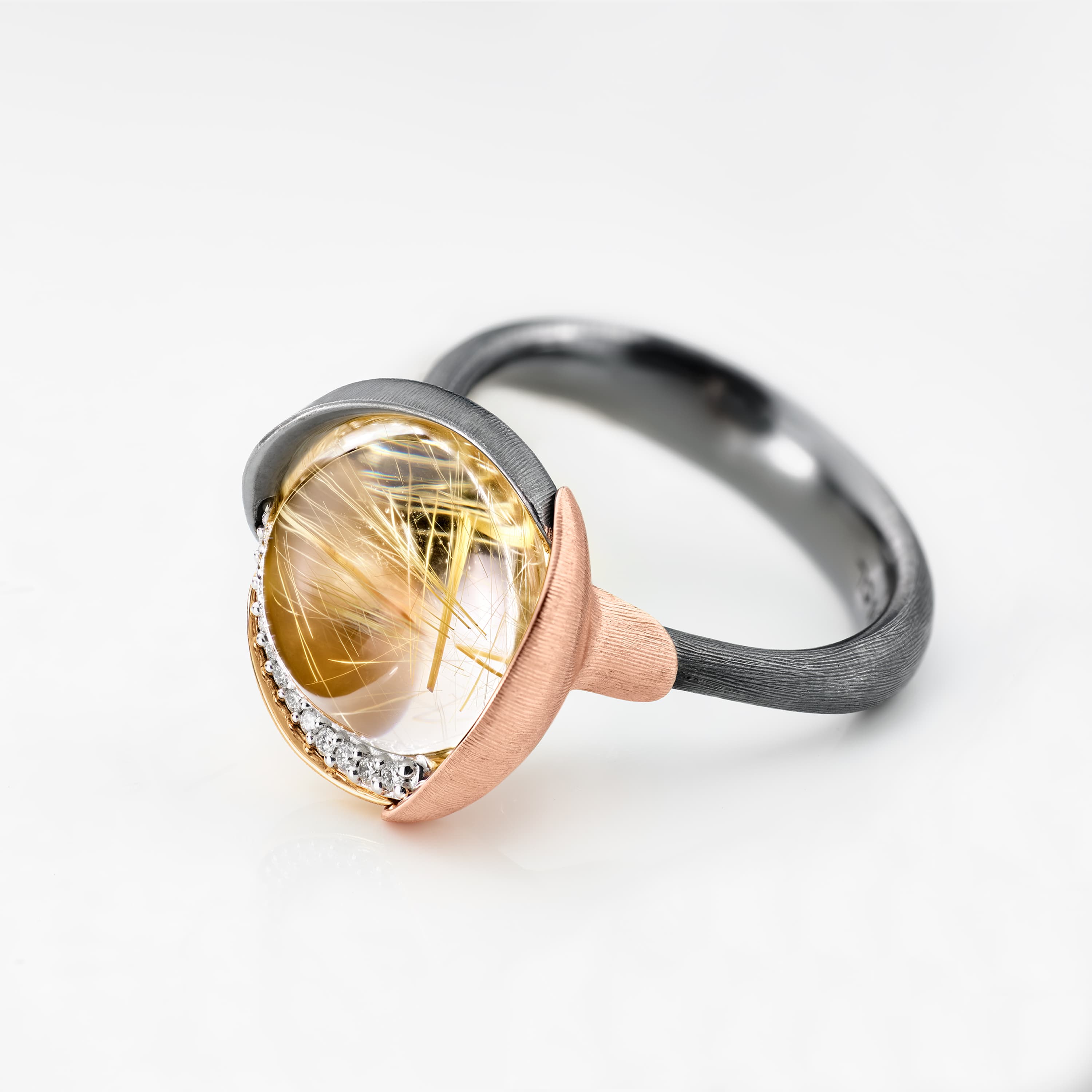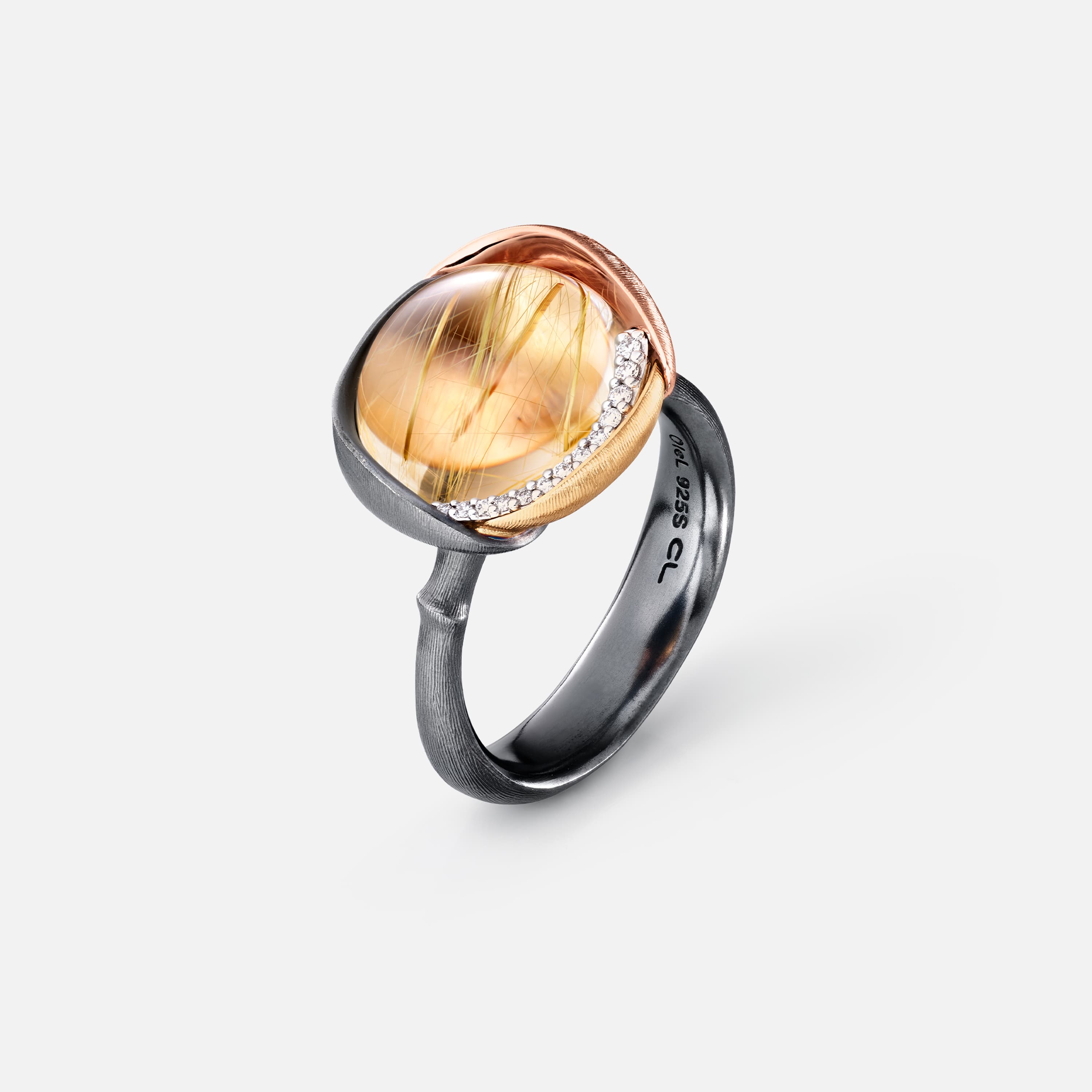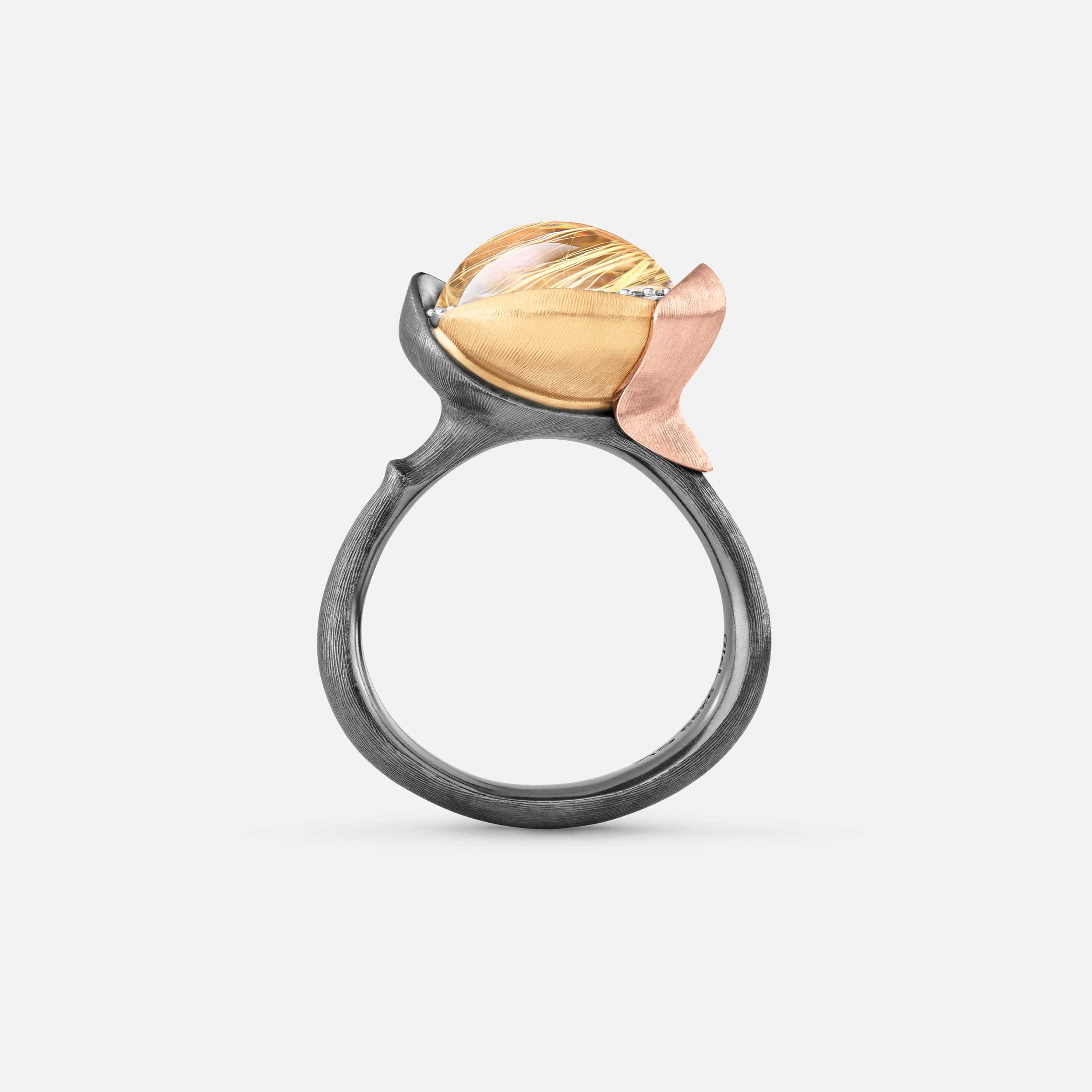 Designed by Charlotte Lynggaard, the Lotus ring, size 3, is crafted from 18 karat yellow and rose gold and oxidized Sterling silver. It is set with 13 diamonds, totalling 0.05 carat TW. VS., and a rutile quartz cabochon. Handcrafted by master goldsmiths, the precious metal surfaces are hand-satinised, whilst the inside of the ring has a polished finish. Part of the Lotus Collection.