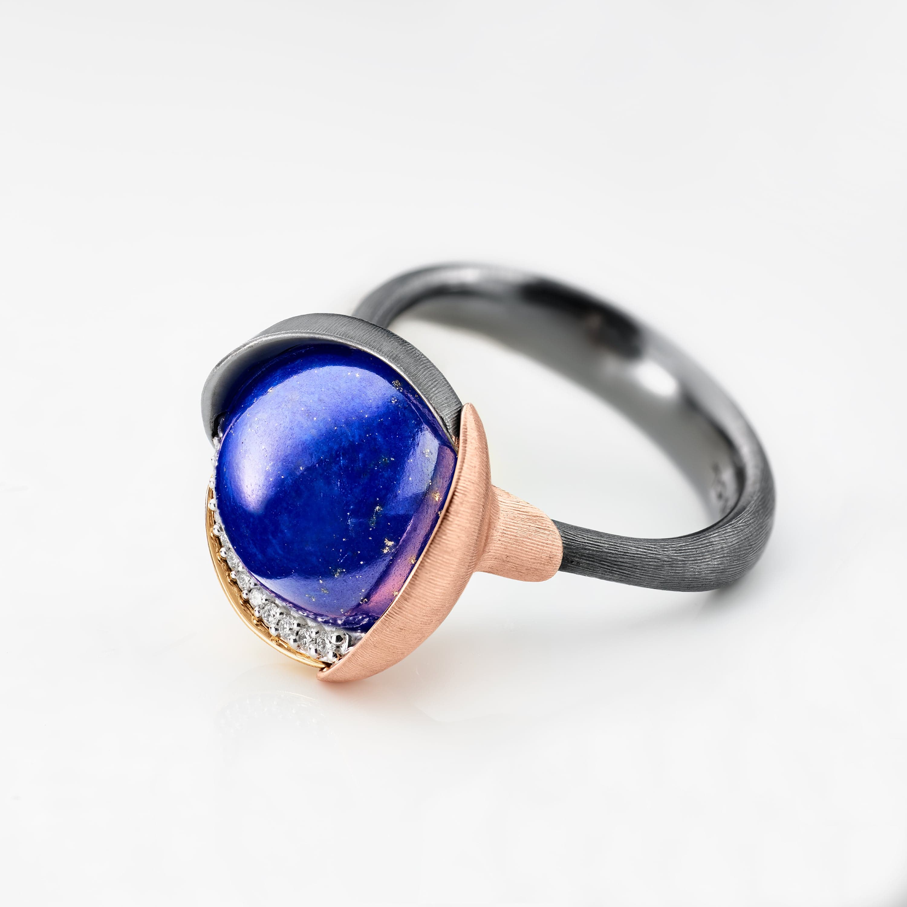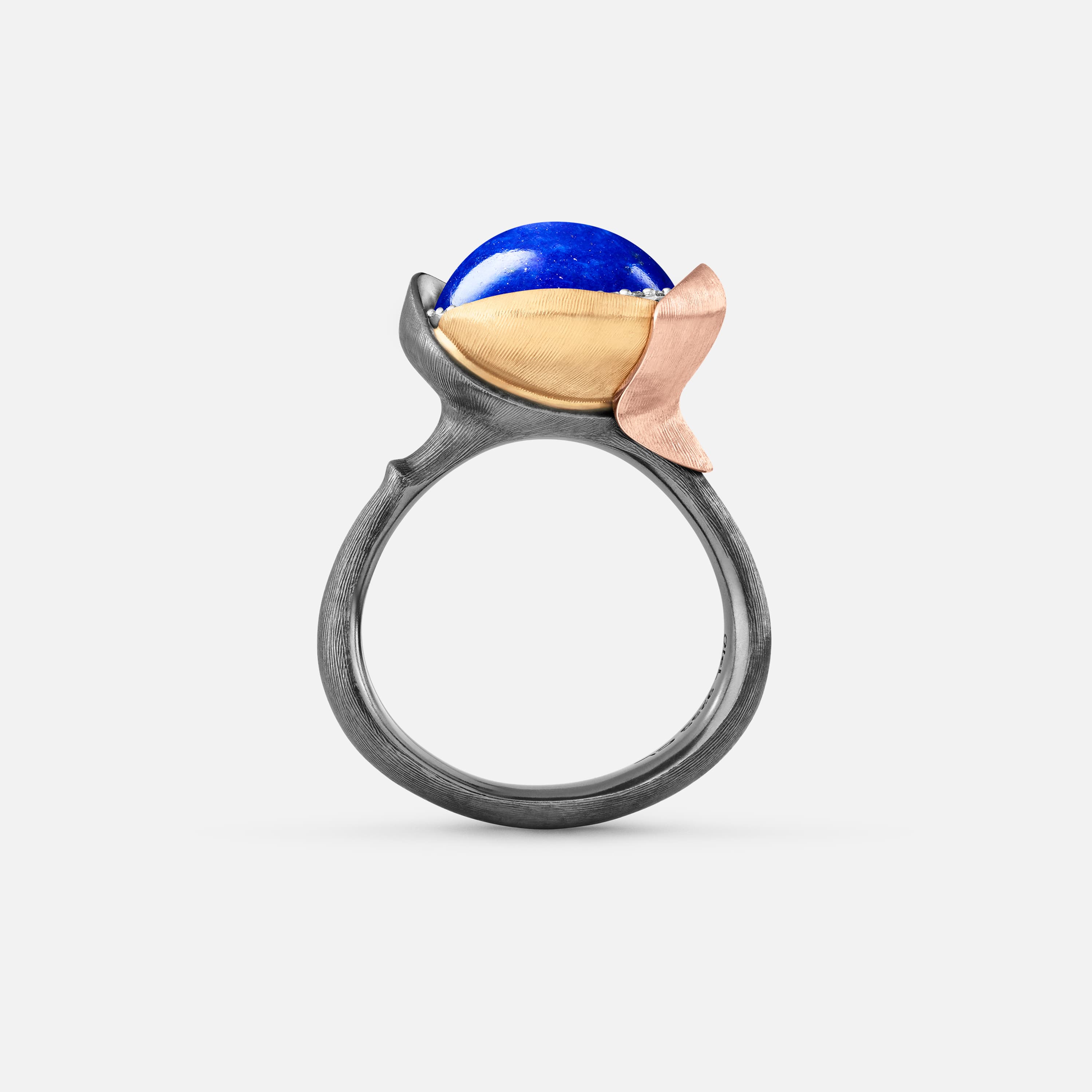 Designed by Charlotte Lynggaard, the Lotus ring, size 3, is crafted from 18 karat yellow and rose gold and oxidized Sterling silver. It is set with 13 diamonds, totalling 0.05 carat TW. VS., and a lapis lazuli cabochon. Handcrafted by master goldsmiths, the precious metal surfaces are hand-satinised, whilst the inside of the ring has a polished finish. Part of the Lotus Collection.