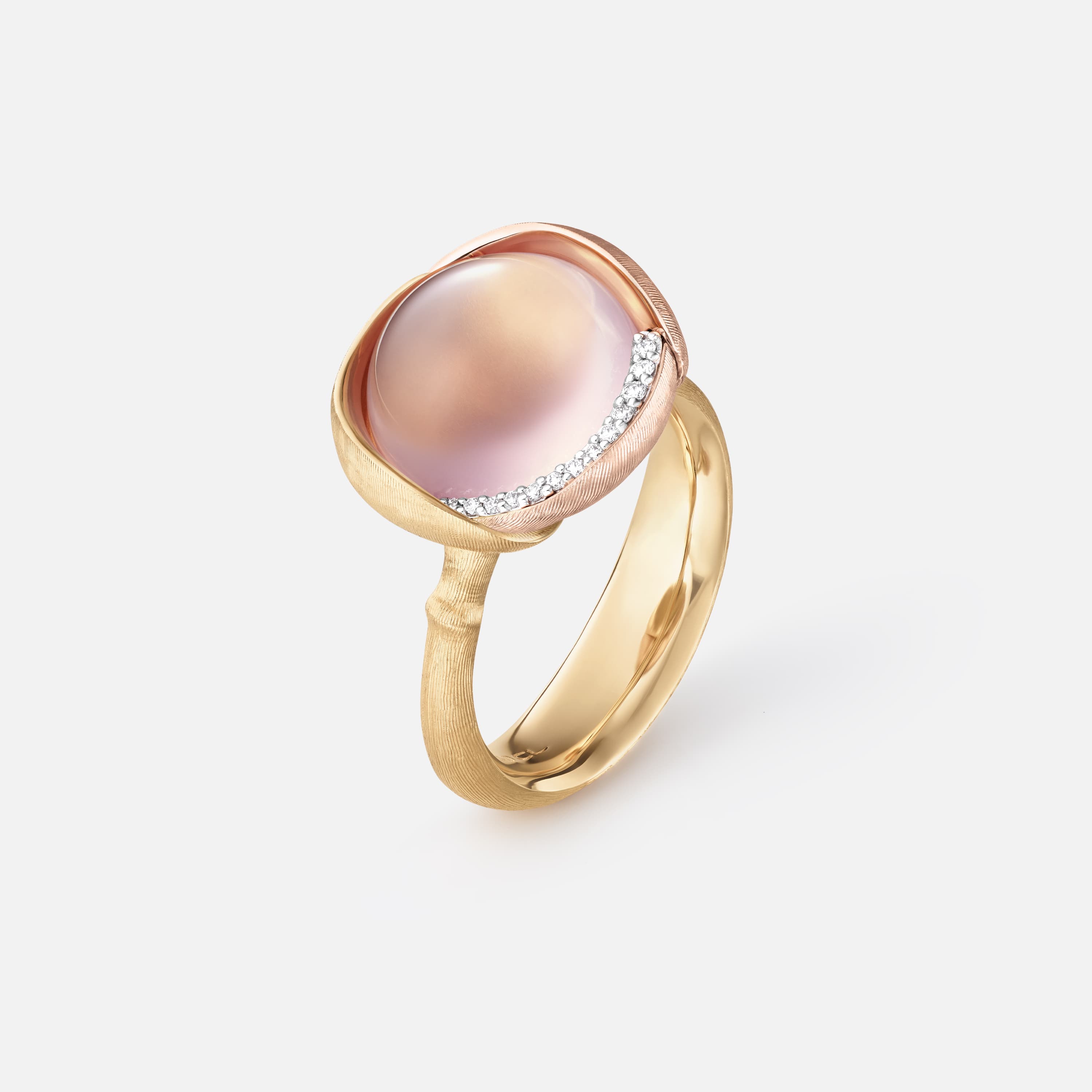 Designed by Charlotte Lynggaard, the Lotus ring, size 3, is crafted from 18 karat yellow and rose gold and is set with 13 diamonds, totalling 0.05 carat TW. VS., and a rose quartz cabochon. Handcrafted by master goldsmiths, the visible gold surfaces are hand-satinised, whilst the inside of the ring has a polished finish. Part of the Lotus Collection.