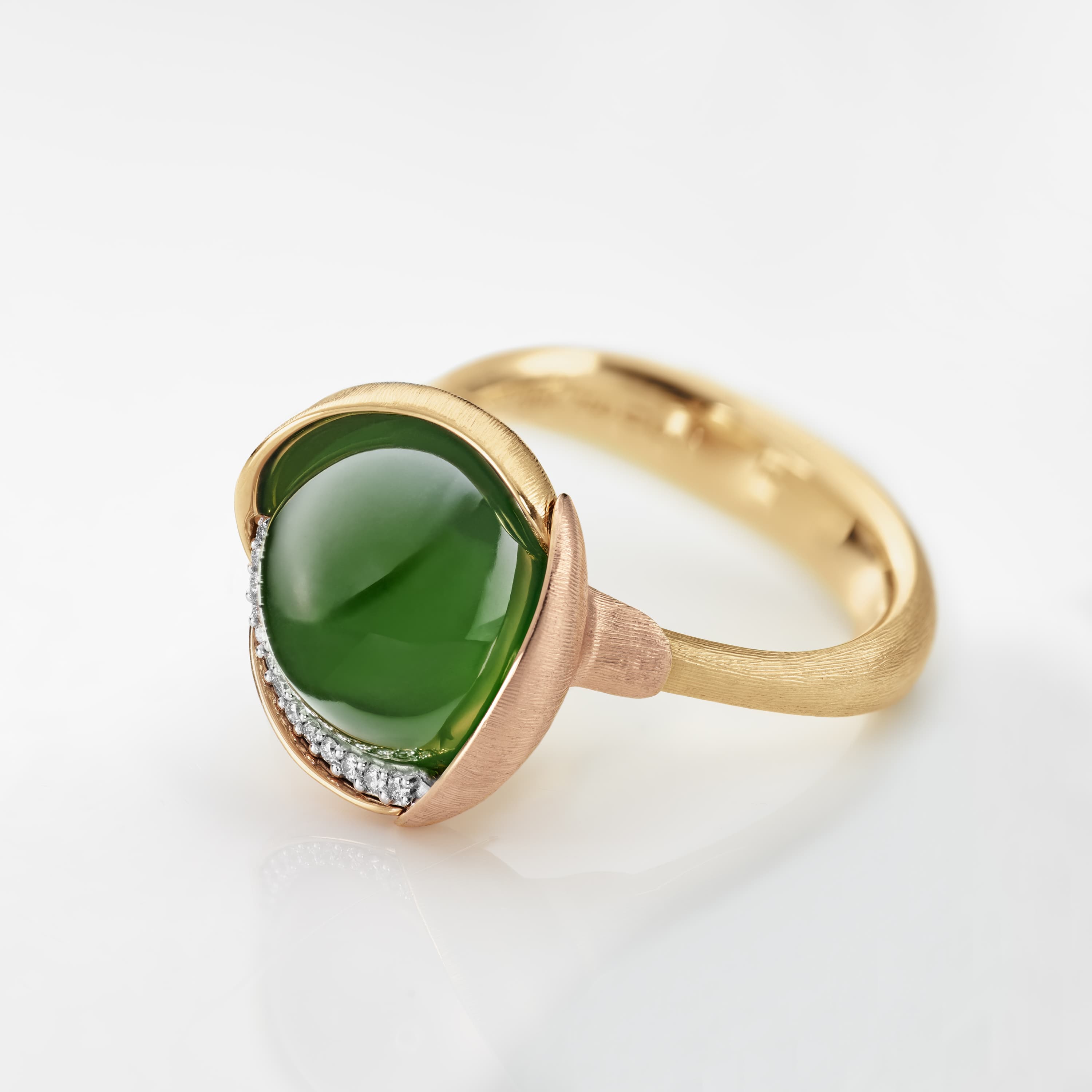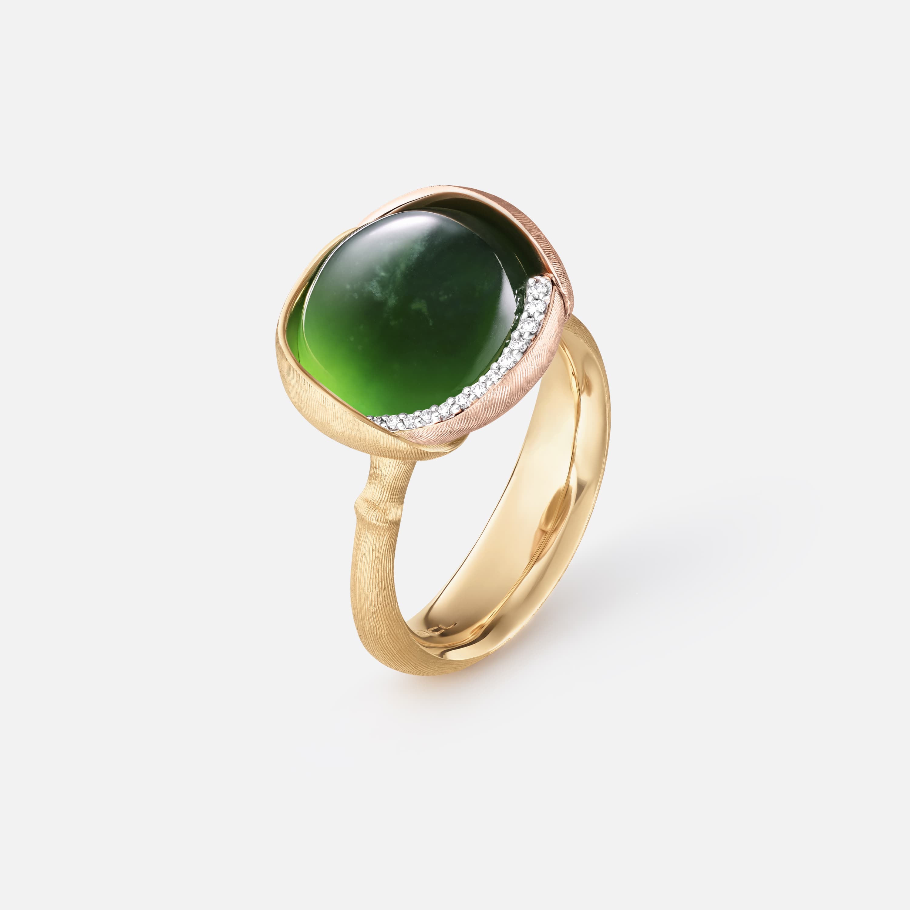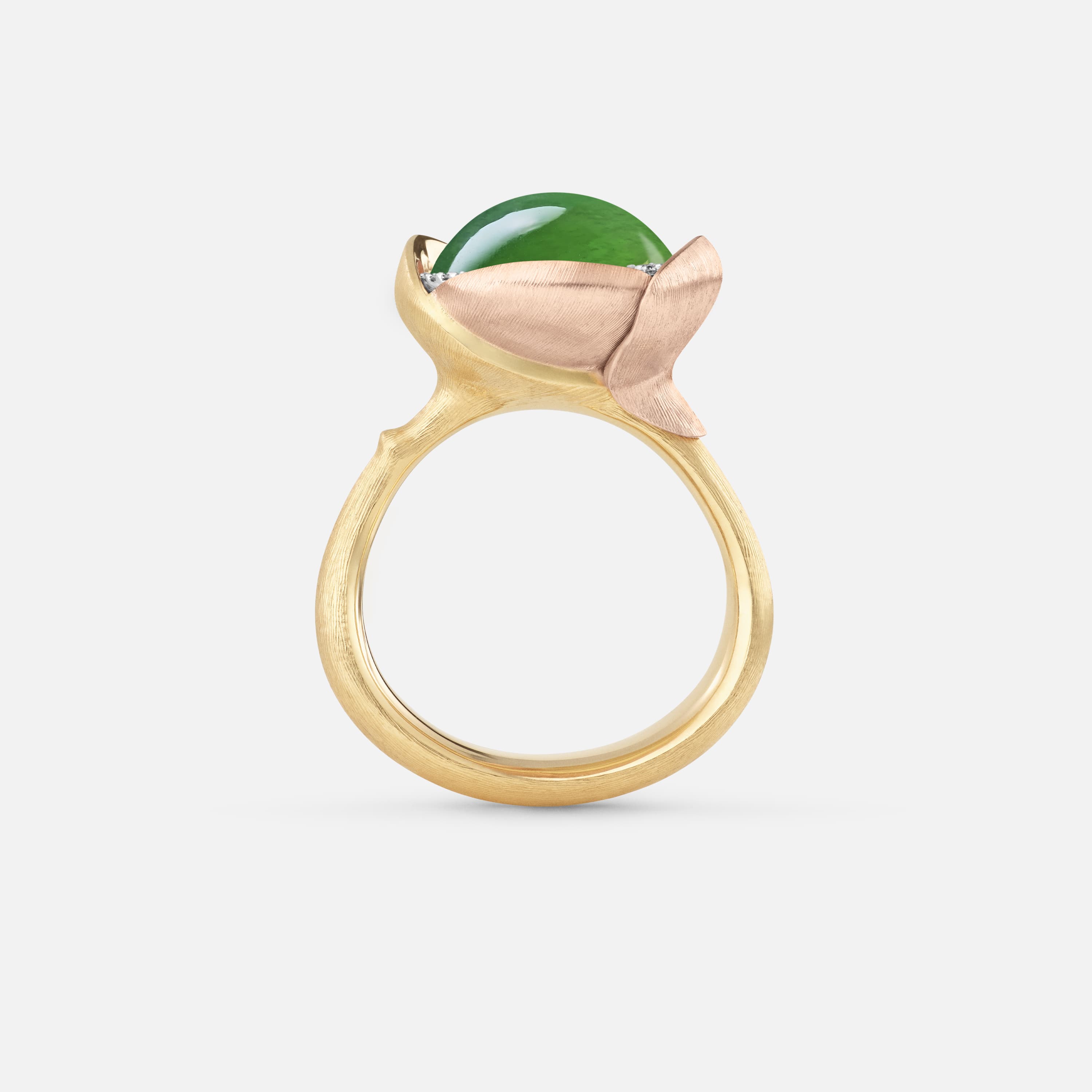 Designed by Charlotte Lynggaard, the Lotus ring, size 3, is crafted from 18 karat yellow and rose gold and is set with 13 diamonds, totalling 0.05 carat TW. VS., and a serpentine cabochon. Handcrafted by master goldsmiths, the visible gold surfaces are hand-satinised, whilst the inside of the ring has a polished finish. Part of the Lotus Collection. Please note: As gemstones are natural materials, each stone is absolutely unique. They will vary in colour and have individual, unique inclusions and features. Web-images of stones are only representatives of the unique stone you will receive when ordering the product, not the exact stone.