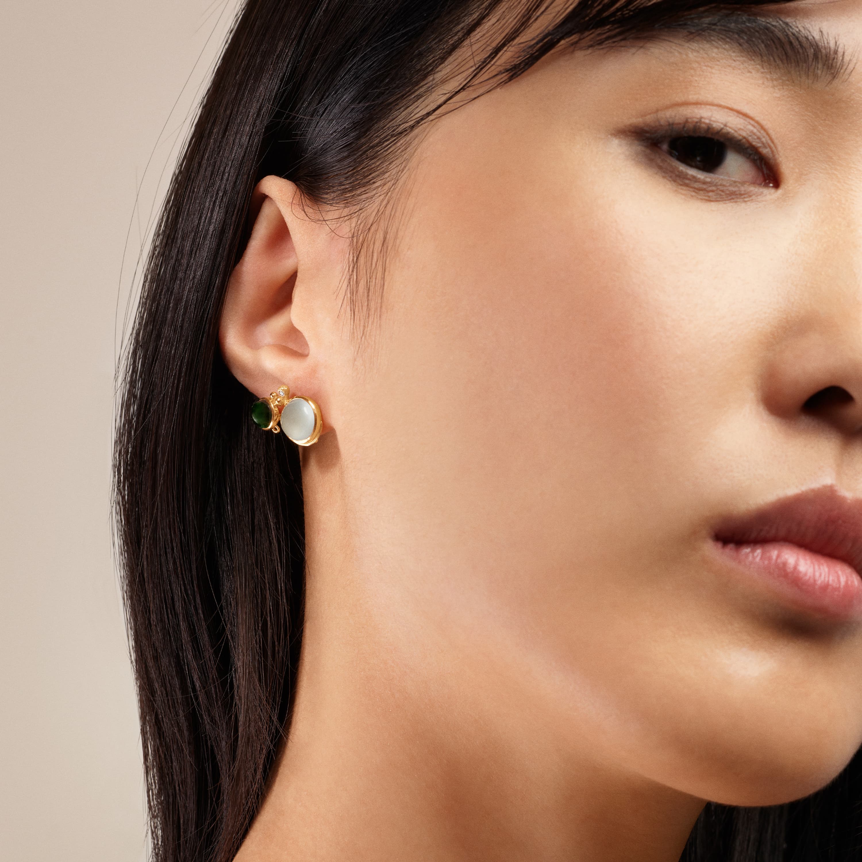 Designed by Charlotte Lynggaard, the Lotus Earring is crafted from 18 karat yellow gold with green tourmaline 6 mm and aquamarine 9 mm, and 1 diamond totaling 0.01 ct TW. VS. Handcrafted by a master goldsmith. 2 eyes for pendants. Sold as a single piece. Part of the Lotus Collection.