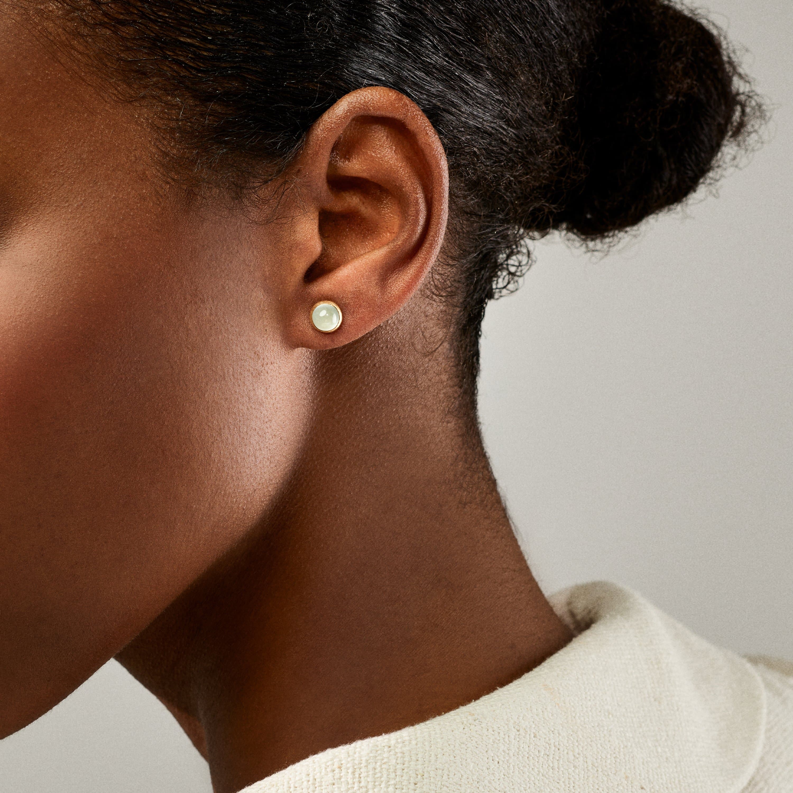 Designed by Charlotte Lynggaard, the Lotus stud earrings are crafted from 18 karat yellow gold and aquamarine cabochons. Handcrafted by master goldsmiths, the visible gold surfaces are hand-satinised, whilst the backs, that sit against the earlobes, have a polished finish. Diameter: 7 mm. Sold as a pair. Part of the Lotus Collection.