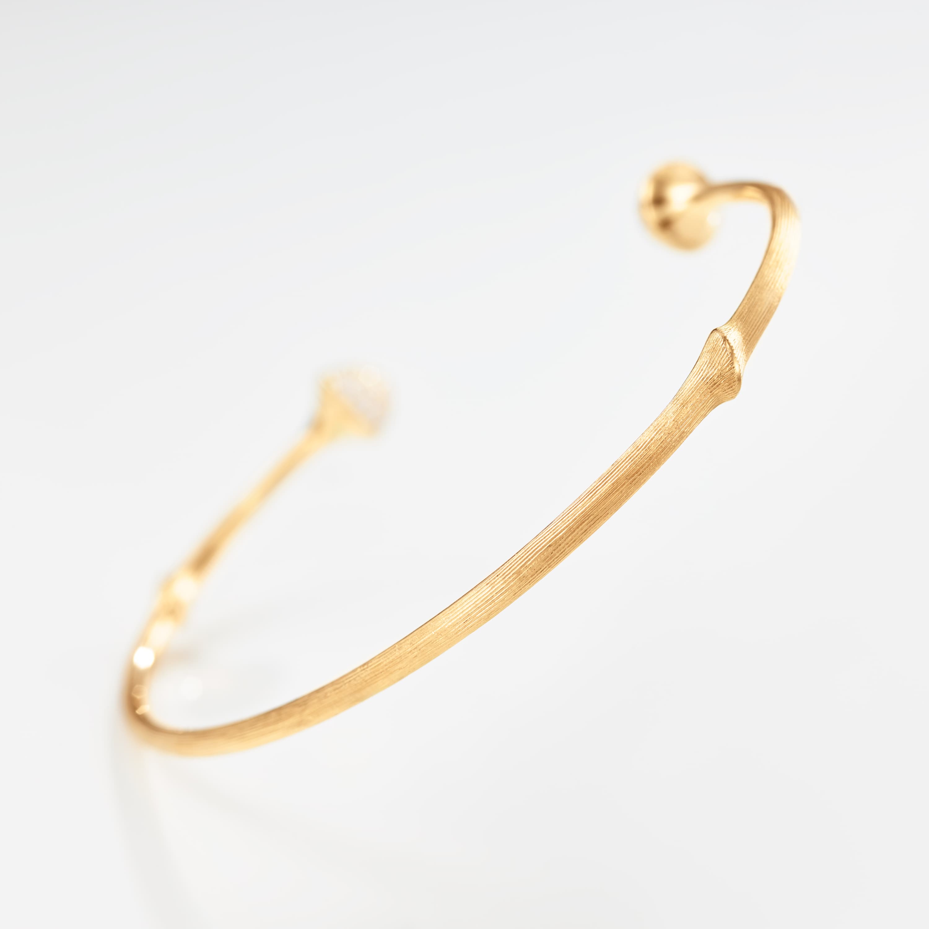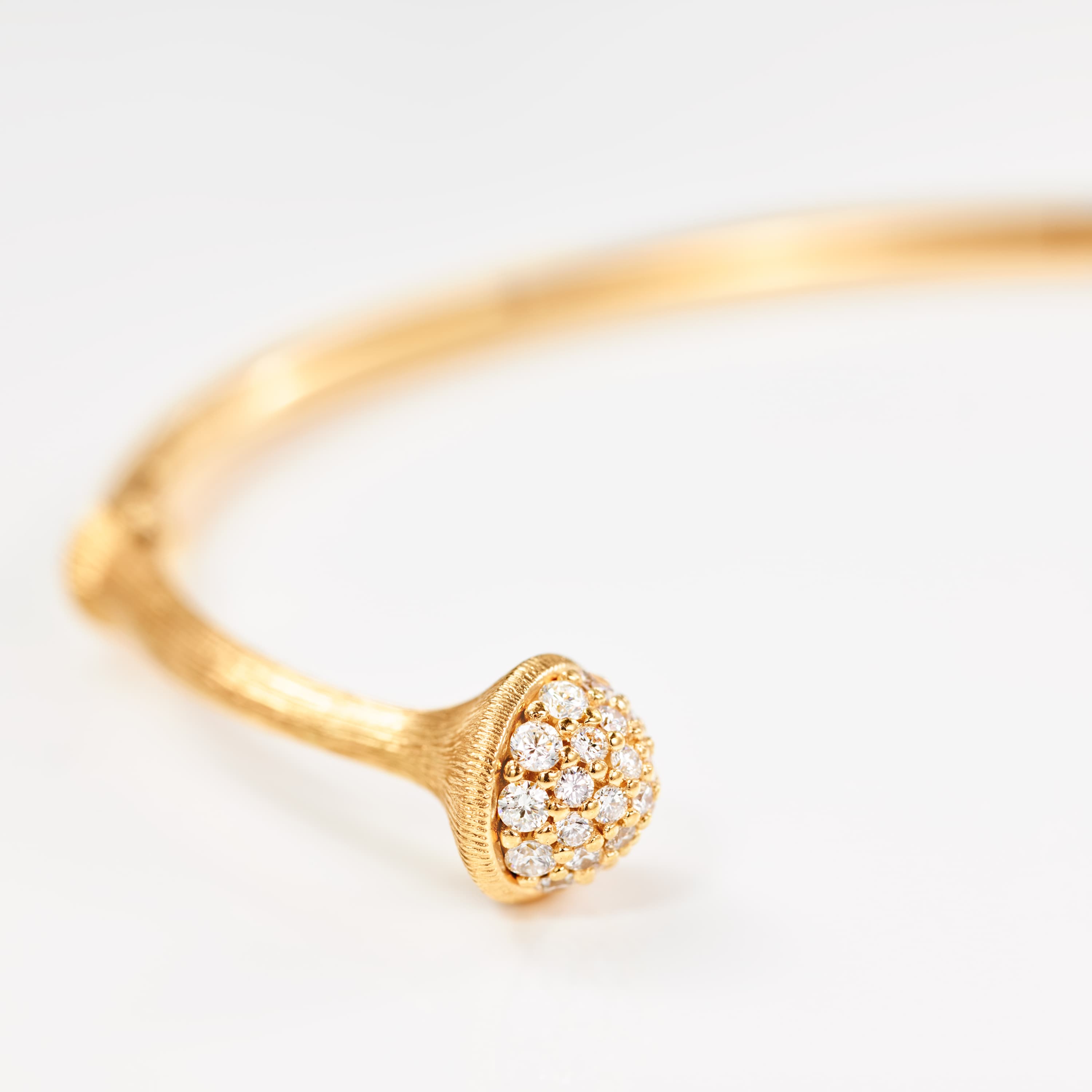 Designed by Charlotte Lynggaard, the satinised Nature bangle is crafted from 18 karat yellow gold with 52 hand-set pavé diamonds totalling 0.38 carat TW. VS. The surface of the bangle is sculpted and finished by hand by master goldsmiths. Available as 15, 16, 17 or 18 cm. Part of the Nature Collection.