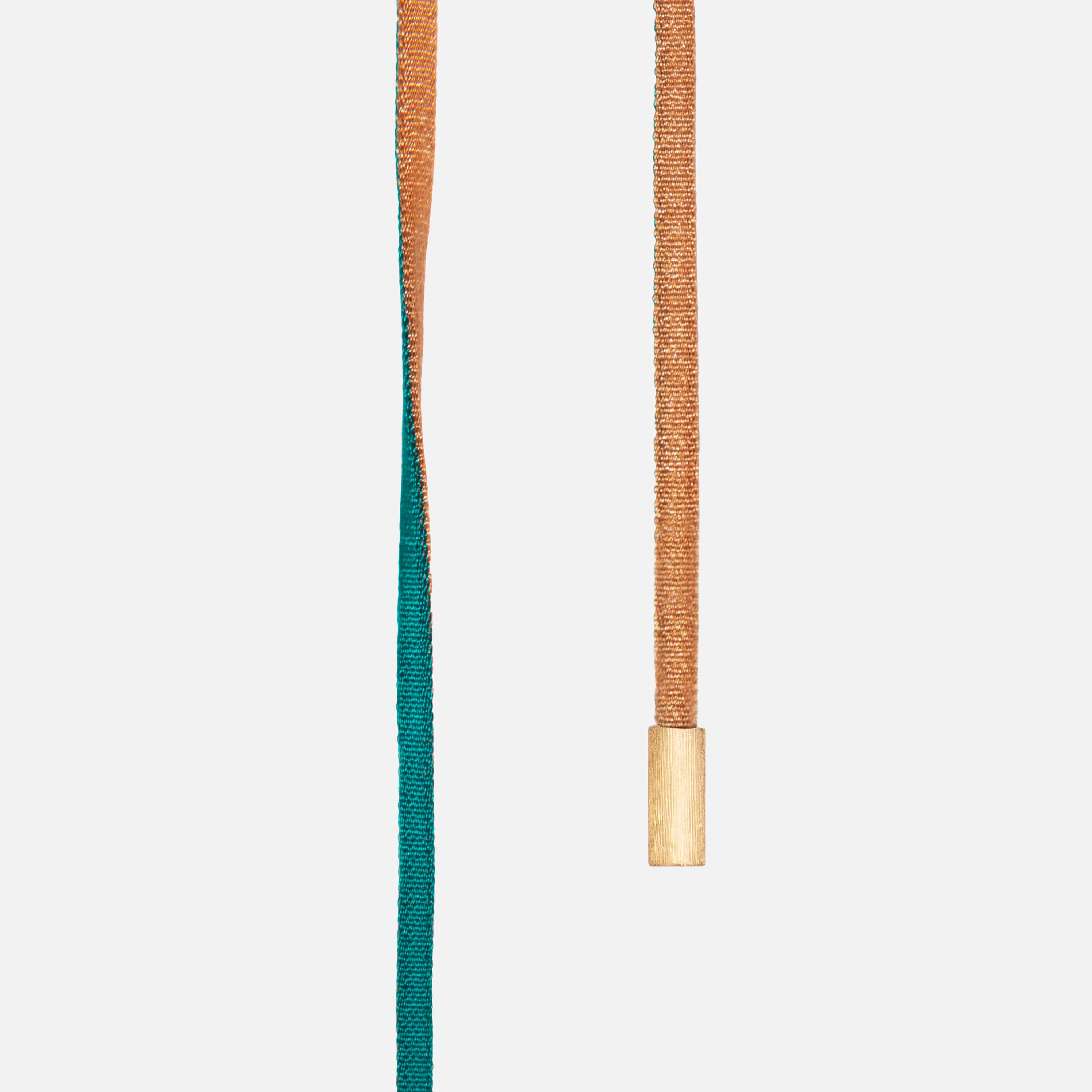Designed by Charlotte Lynggaard, the silk String necklace is crafted from pure silk with 18 karat, textured, yellow gold end pieces. One side is a golden colour, and the other is turquoise. Total length is 130 cm. Part of the Ole Lynggaard Copenhagen Collection.