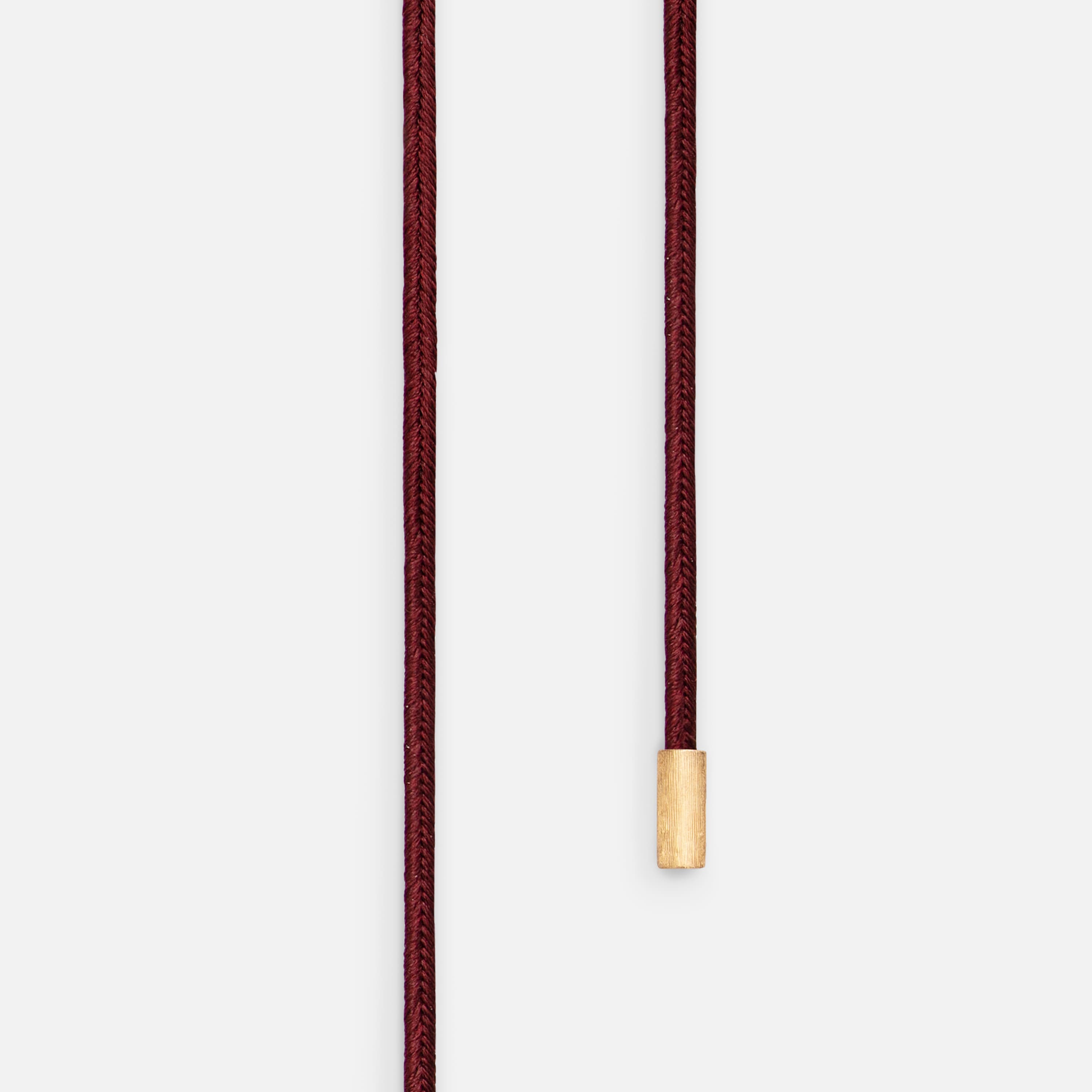 Designed by Charlotte Lynggaard, the silk String necklace in colourway Bordeaux is crafted from pure silk with 18 karat, textured, yellow gold end pieces. Total length is 130 cm. Part of the Ole Lynggaard Copenhagen Collection.