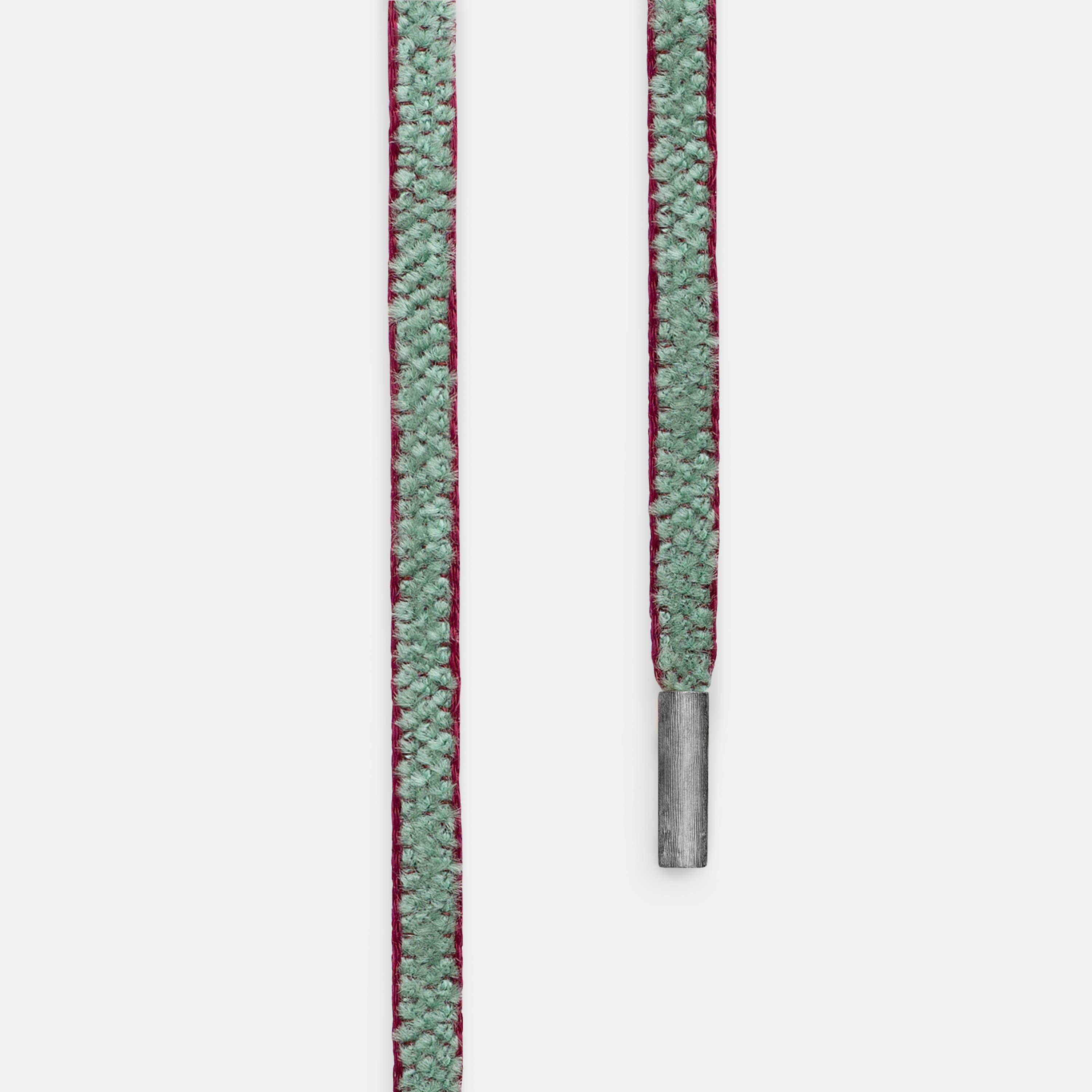 Designed by Charlotte Lynggaard, the Chenille Mokuba String necklace in colourway ice-blue & Bordeaux is crafted from pure silk with oxidized, textured, Sterling silver end pieces. Total length is 130 cm. Part of the Ole Lynggaard Copenhagen Collection.