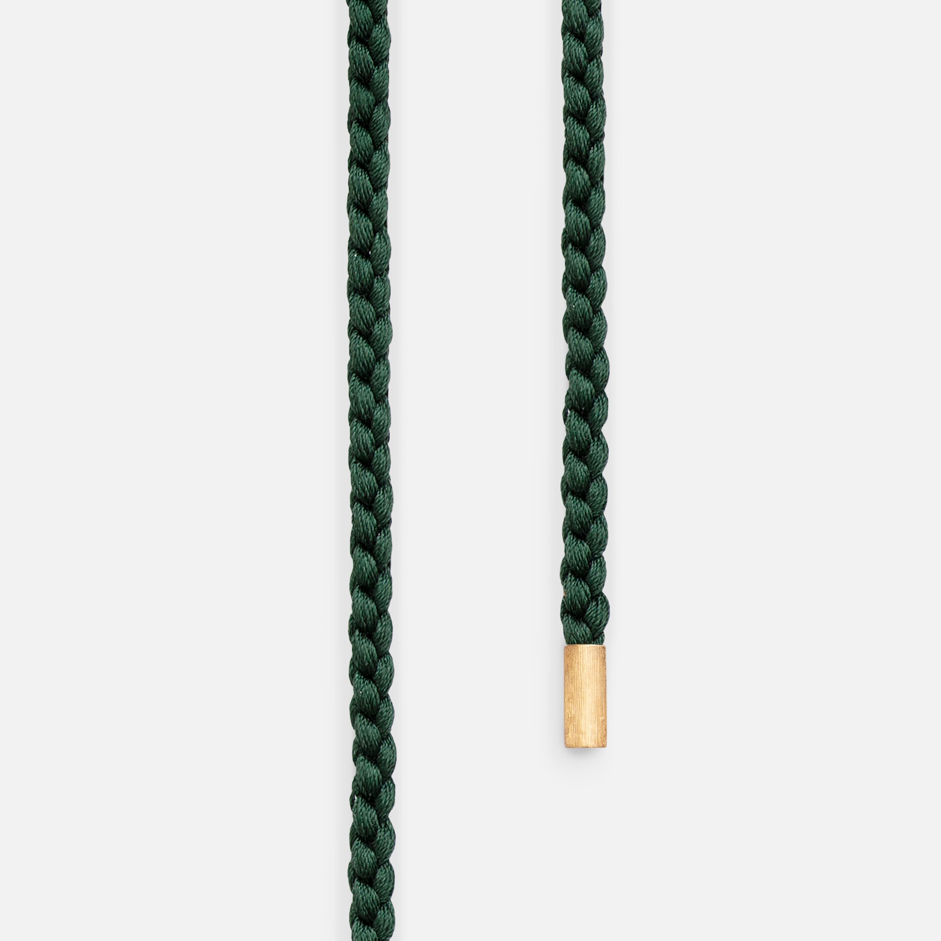 Designed by Charlotte Lynggaard, the Mokuba silk String necklace in dark green is crafted from pure silk with 18 karat, textured, yellow gold end pieces. Total length is 130 cm. Part of the Ole Lynggaard Copenhagen Collection. Total length: 51.18 inches.