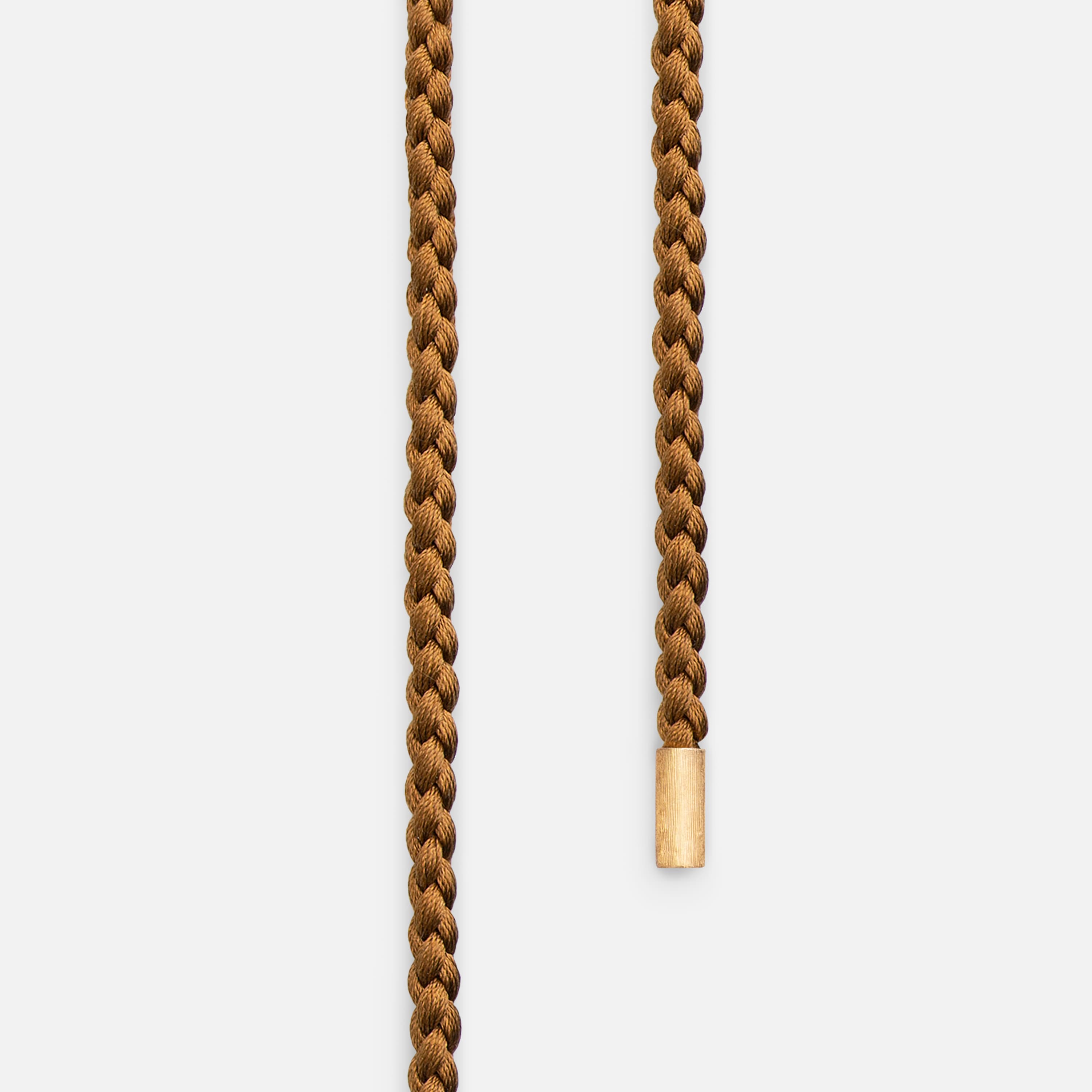 Designed by Charlotte Lynggaard, the Mokuba silk String necklace in colourway camel is crafted from pure silk with 18 karat, textured, yellow gold end pieces. Total length is 130 cm. Part of the Ole Lynggaard Copenhagen Collection. Total length: 51.18 inches.