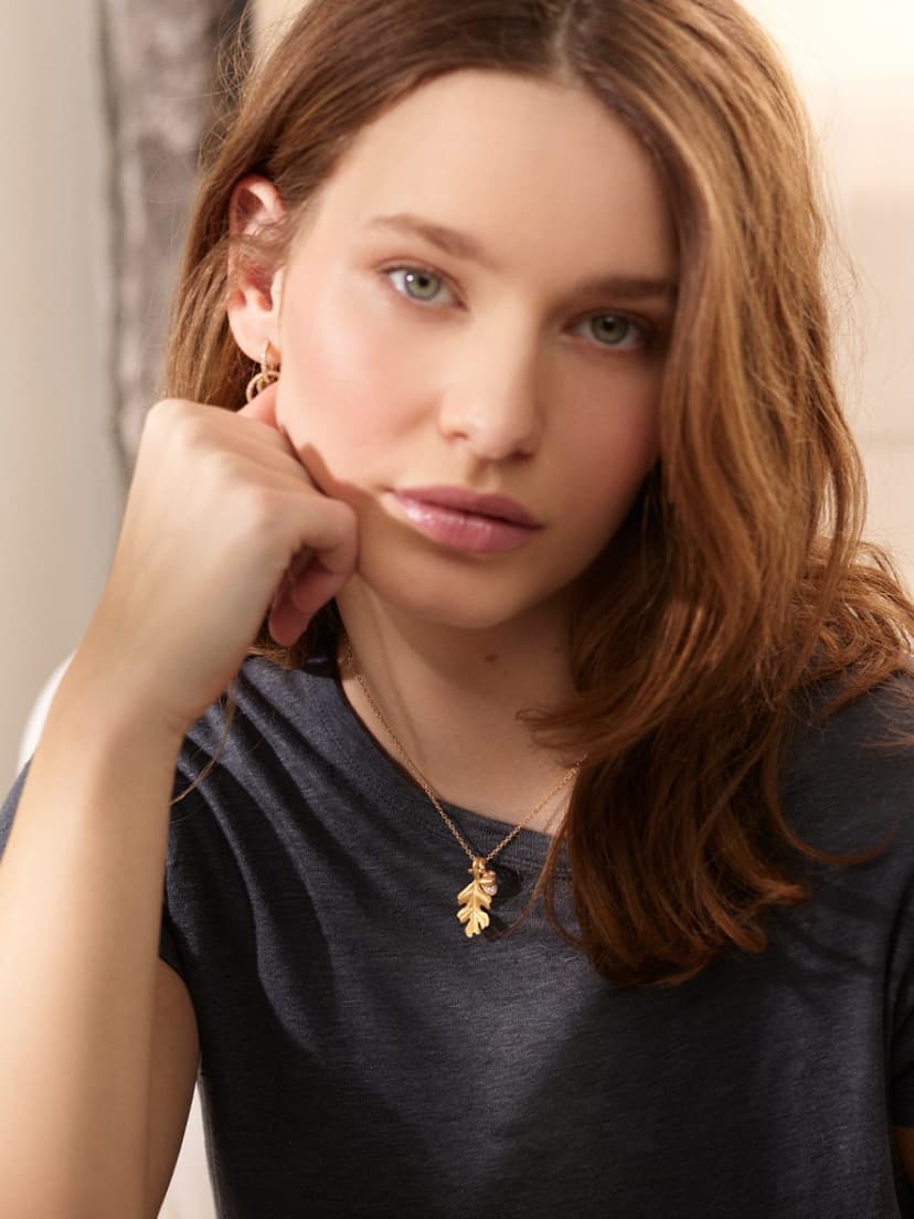 Designed by Charlotte Lynggaard, the Oak leaf pendant medium is 30 mm high and crafted from 18 karat yellow gold. Master goldsmiths hand-satinise the front of the pendant, and polish the reverse. Part of the Forest Collection.