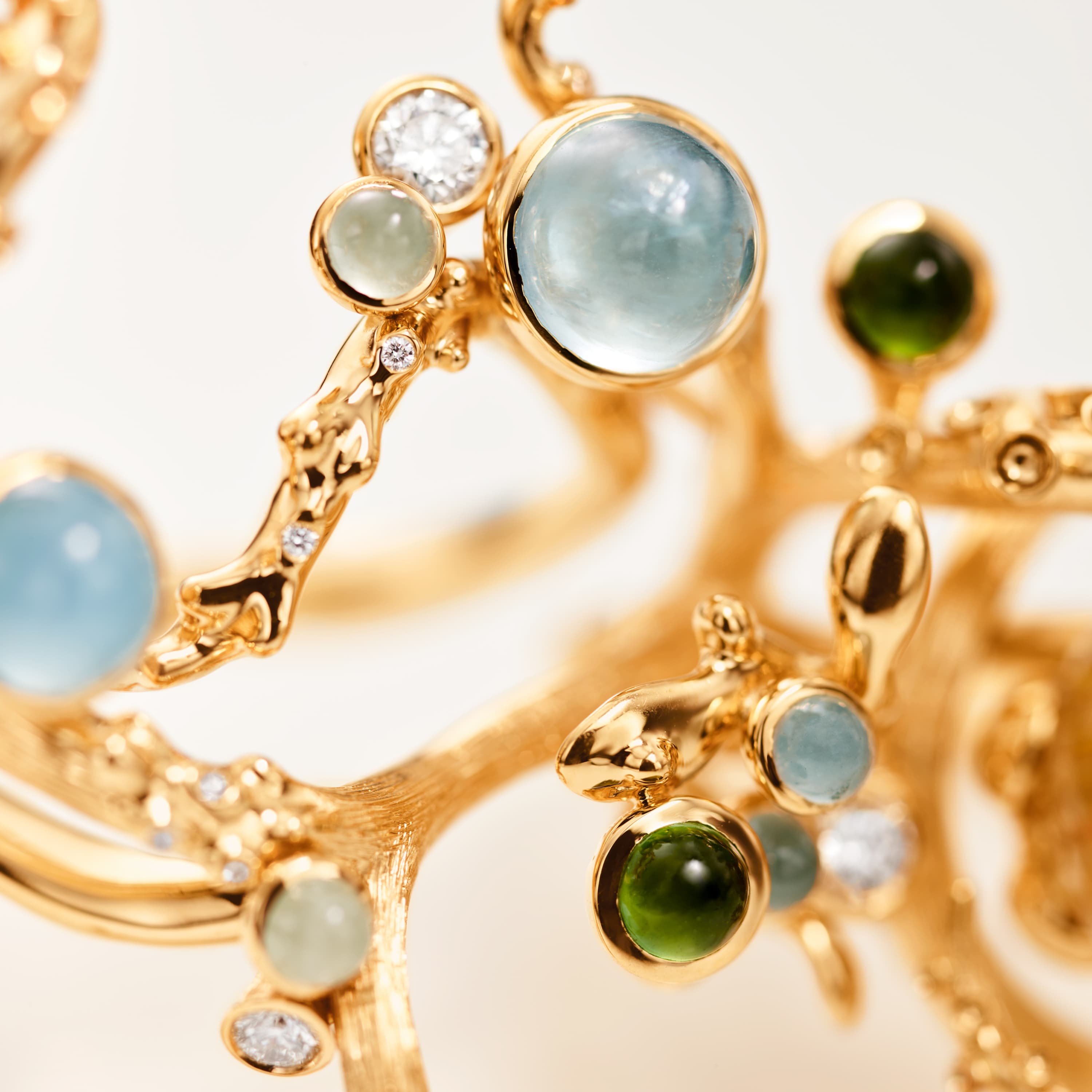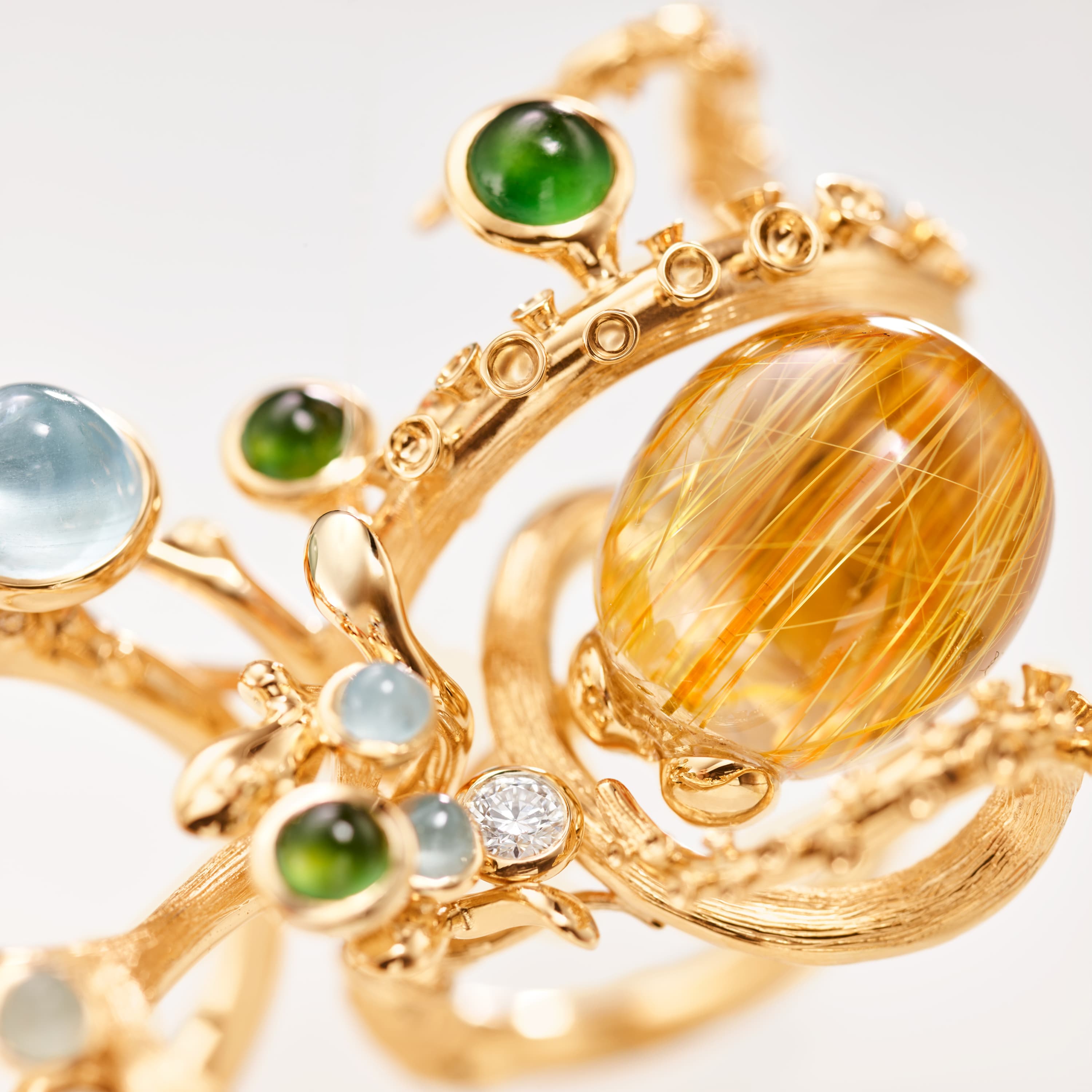 18k gold, aquamarines, serpentines, rutile quartz and diamonds 0,32 ct. TW. VS.