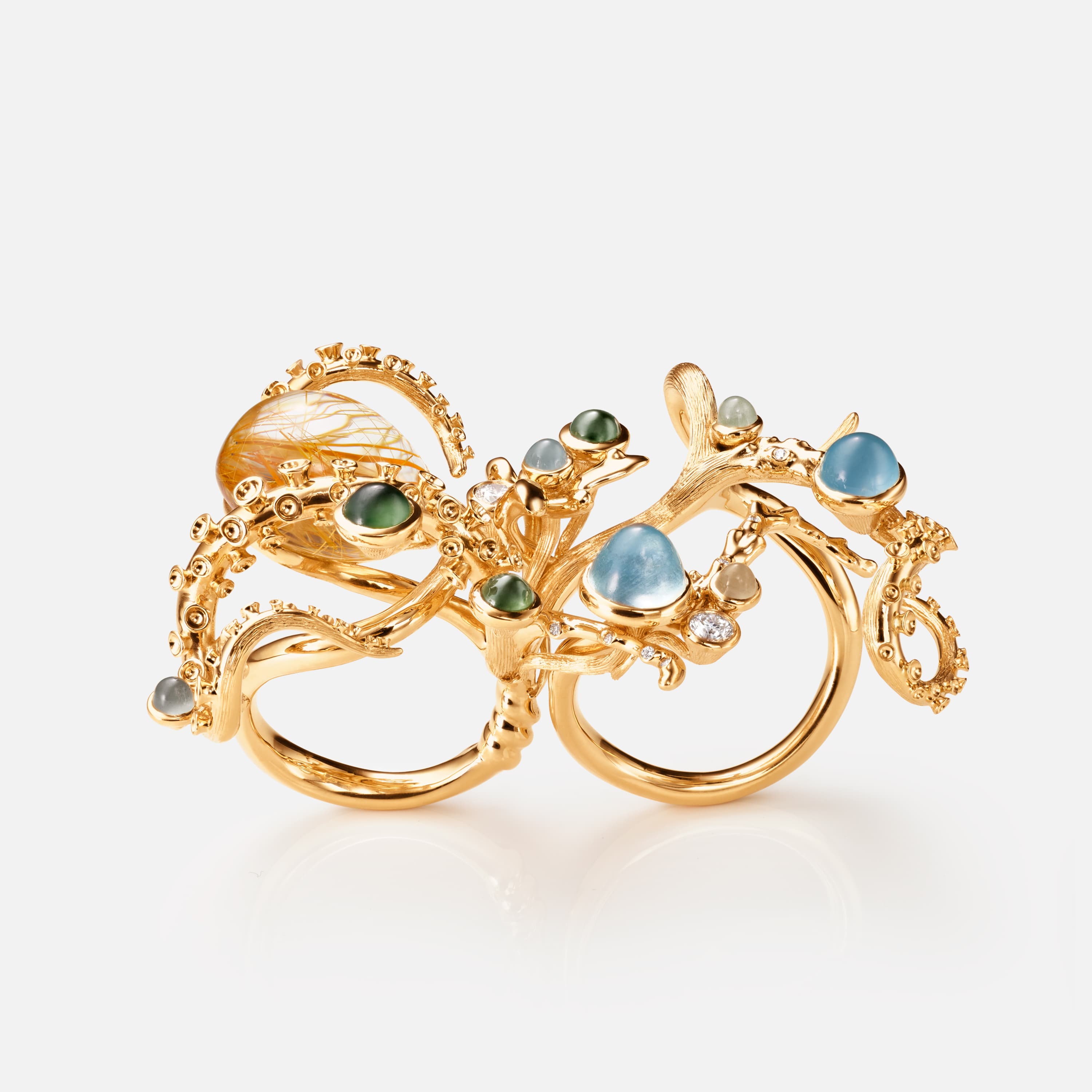 Designed by Sofia Lynggaard Normann, the Octopus ring is crafted from 18 karat yellow gold set with aquamarines, serpentines, a large rutile quartz and hand-set diamonds totalling 0.32 carat TW. VS. The voluminous ring has two ring shanks and is therefore worn on two fingers. Handcrafted by master goldsmiths. Part of the Young Fish Collection.