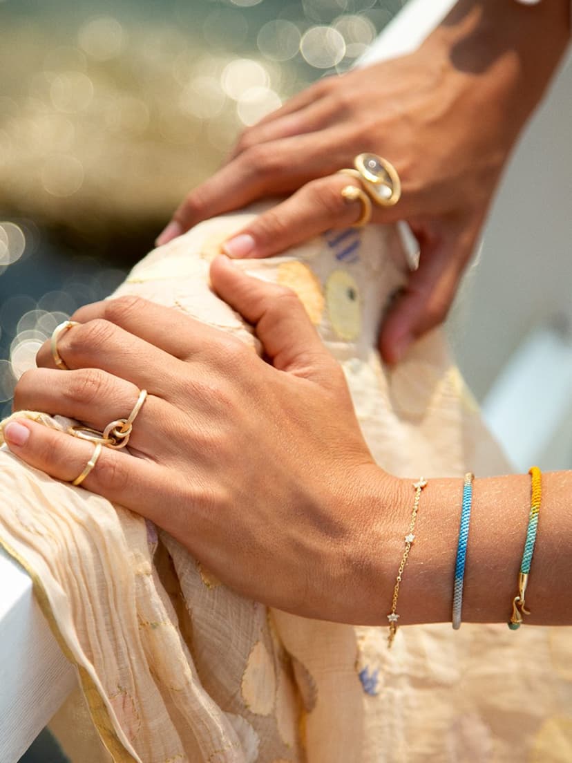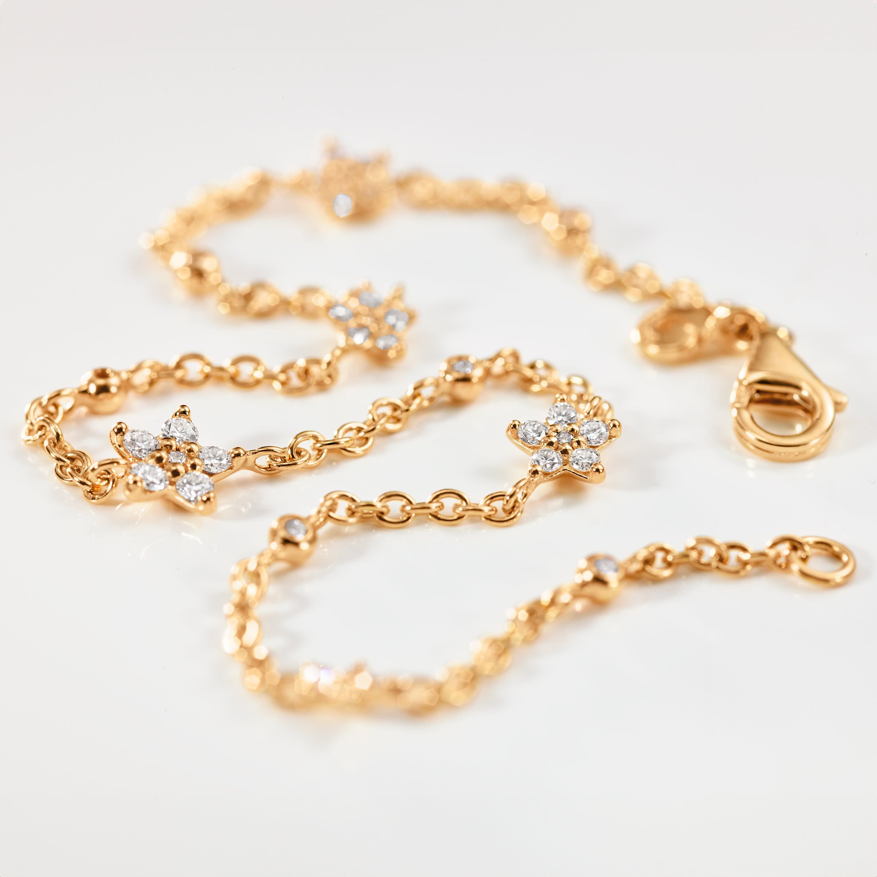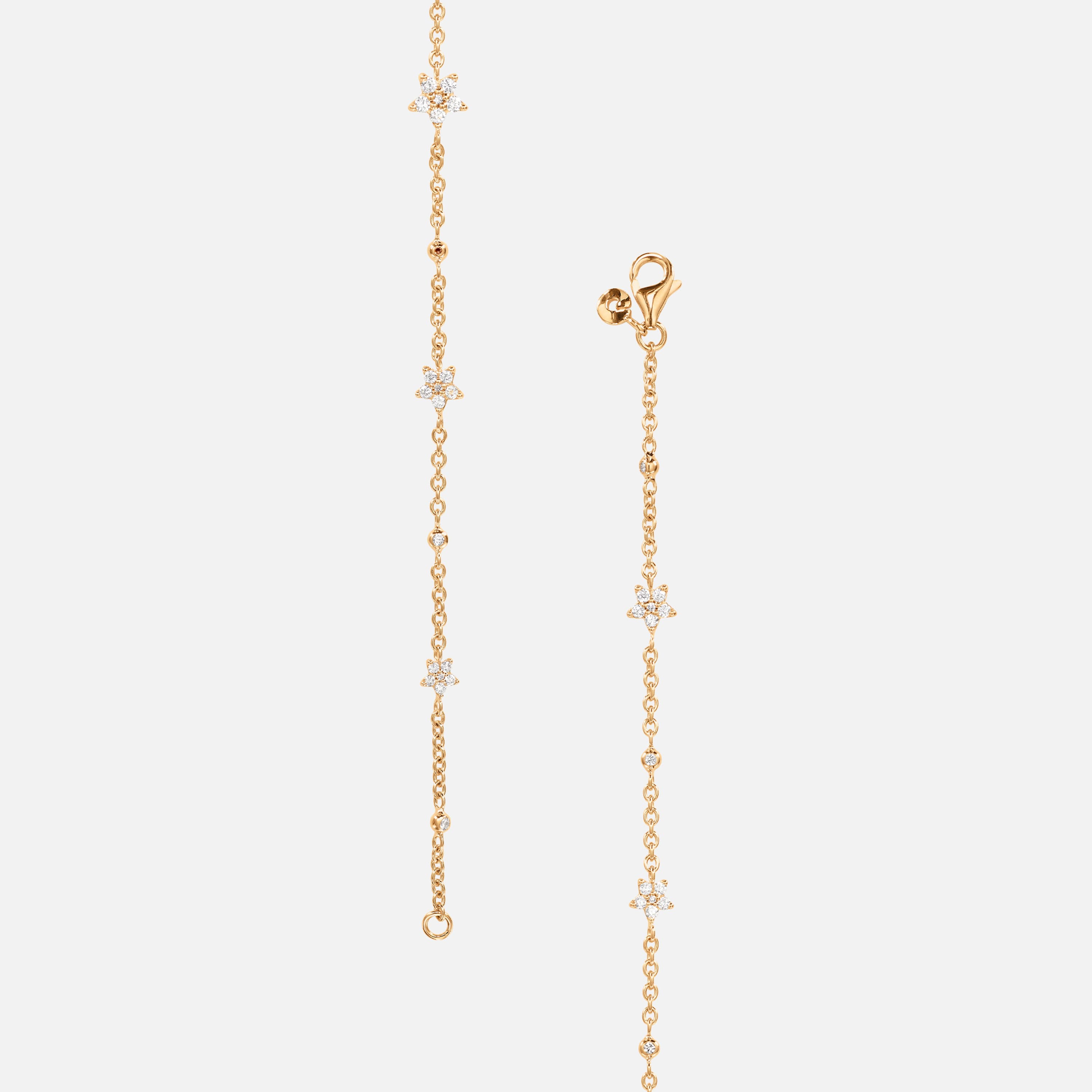 Designed by Charlotte Lynggaard, the Shooting Stars bracelet is available as 16, 17, 18, or 19 cm long and is crafted from 18 karat yellow gold and 35 diamonds totalling 0.35 carat TW. VS. The bracelet alternates bezel-set diamonds and 5 stars, each of which has a slightly convex, hand-polished back and comprises 6 brilliant cut diamonds, raised from the surface to allow light through the facets. Handcrafted by master goldsmiths.