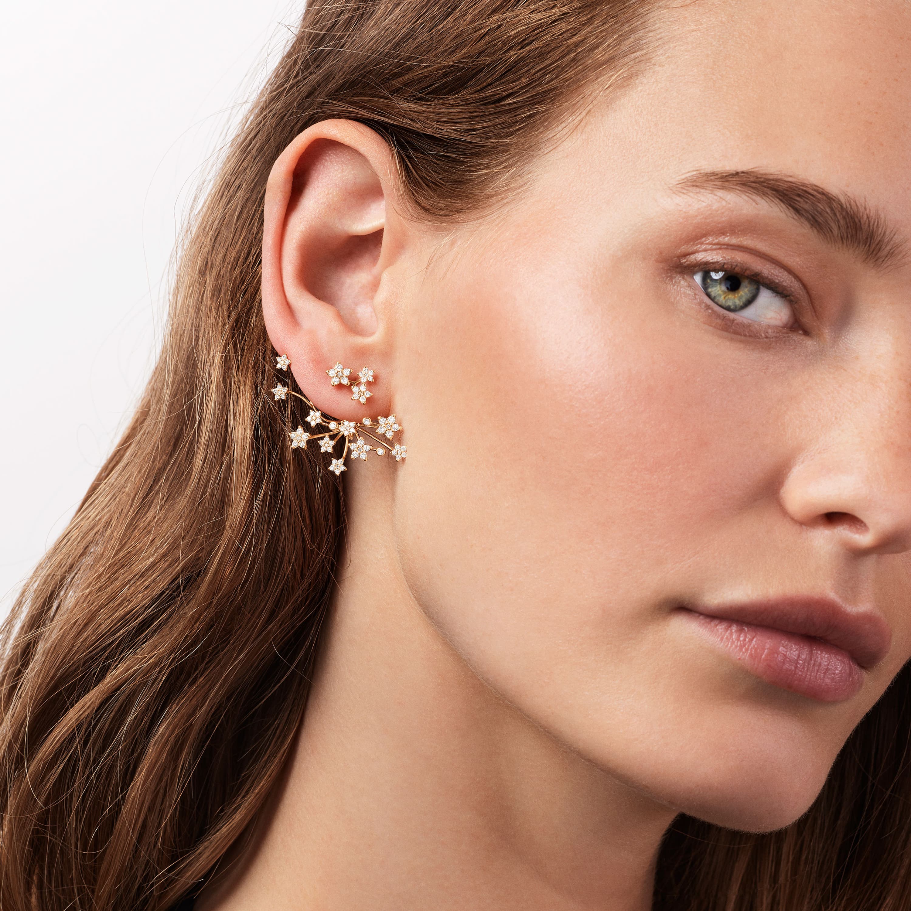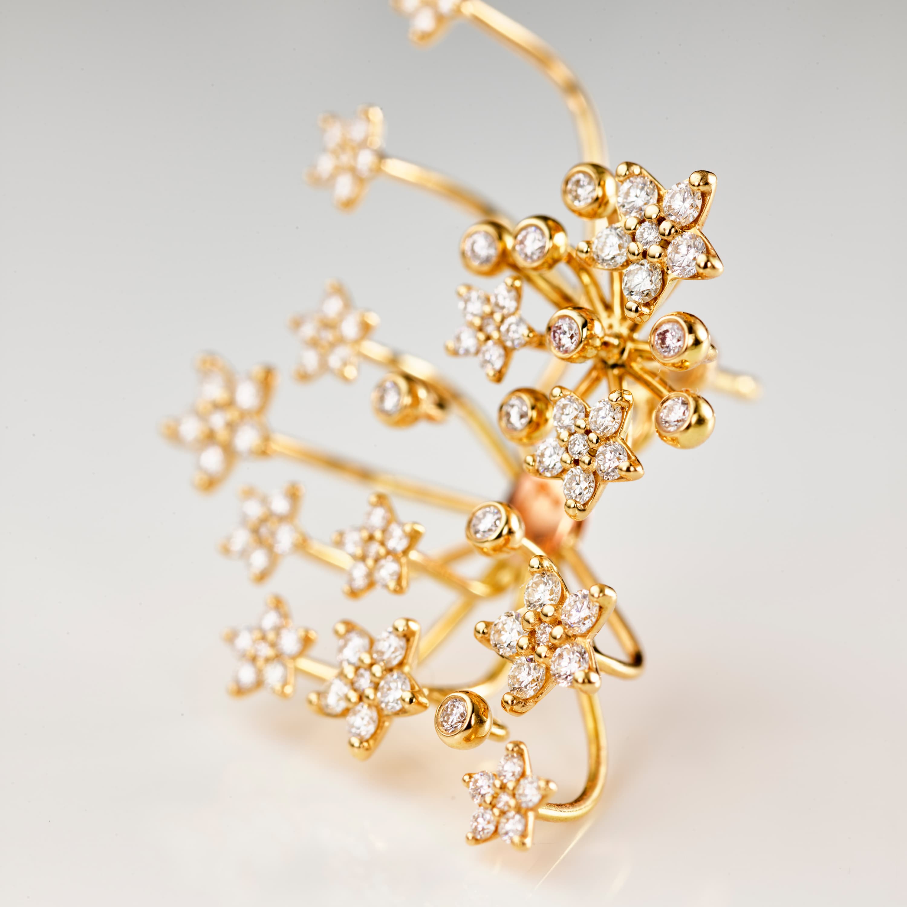 Designed by Charlotte Lynggaard, this Shooting Stars earring pendant is crafted from 18 karat yellow gold and 63 diamonds totalling 0.45 ct. TW VS. The design features a sky of stars, with each star comprising six brilliant-cut diamonds, raised from the surface to allow light through the facets. The gold surfaces are hand-polished by master goldsmiths. The Shooting Stars earring pendant is designed to be added to a Shooting Stars stud earring from behind the earlobe, thereby allowing it to be effortlessly attached to and detached from various earrings. The pendant is available as both left and right. Sold as a single piece. Part of The Shooting Stars Collection.