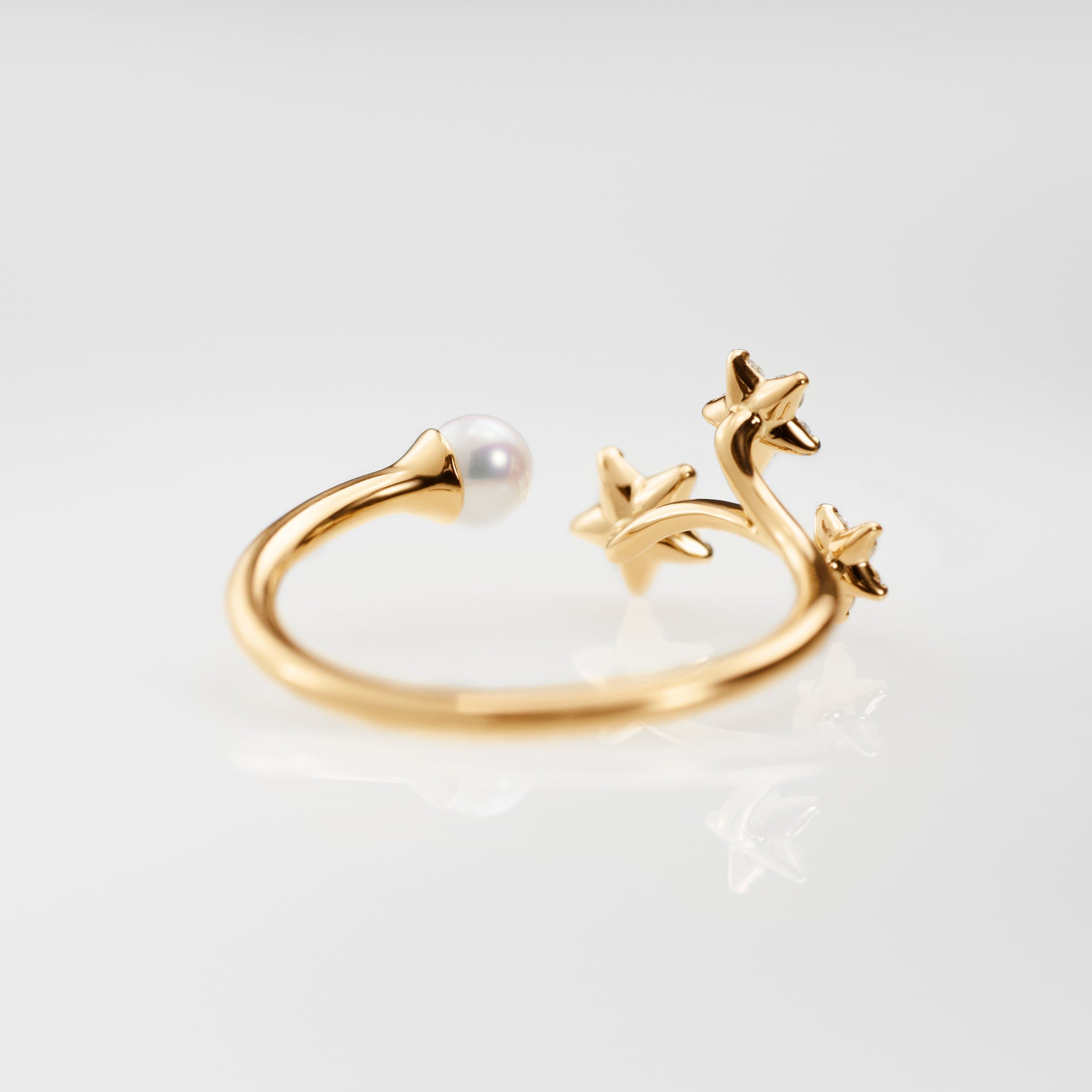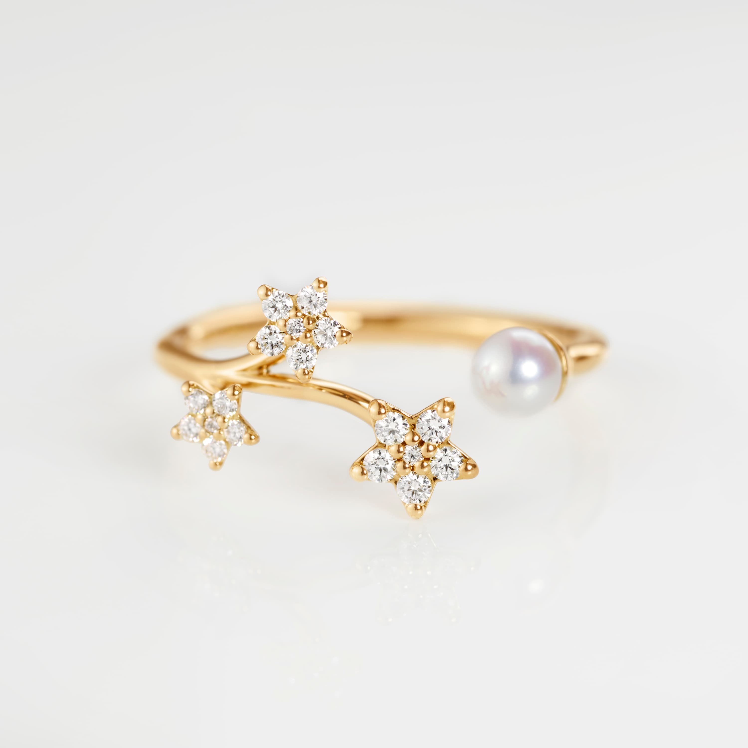 Designed by Charlotte Lynggaard, the Shooting Stars ring is crafted from 18 karat yellow gold, 18 diamonds totalling 0,14 carat TW. VS., and a 4 mm freshwater pearl. Each star comprises 6 brilliant cut diamonds, raised from the surface to allow light through the facets. The ring shank is slightly oval to enhance the delicate appearance of the ring, and the gold surfaces are hand-polished by master goldsmiths.